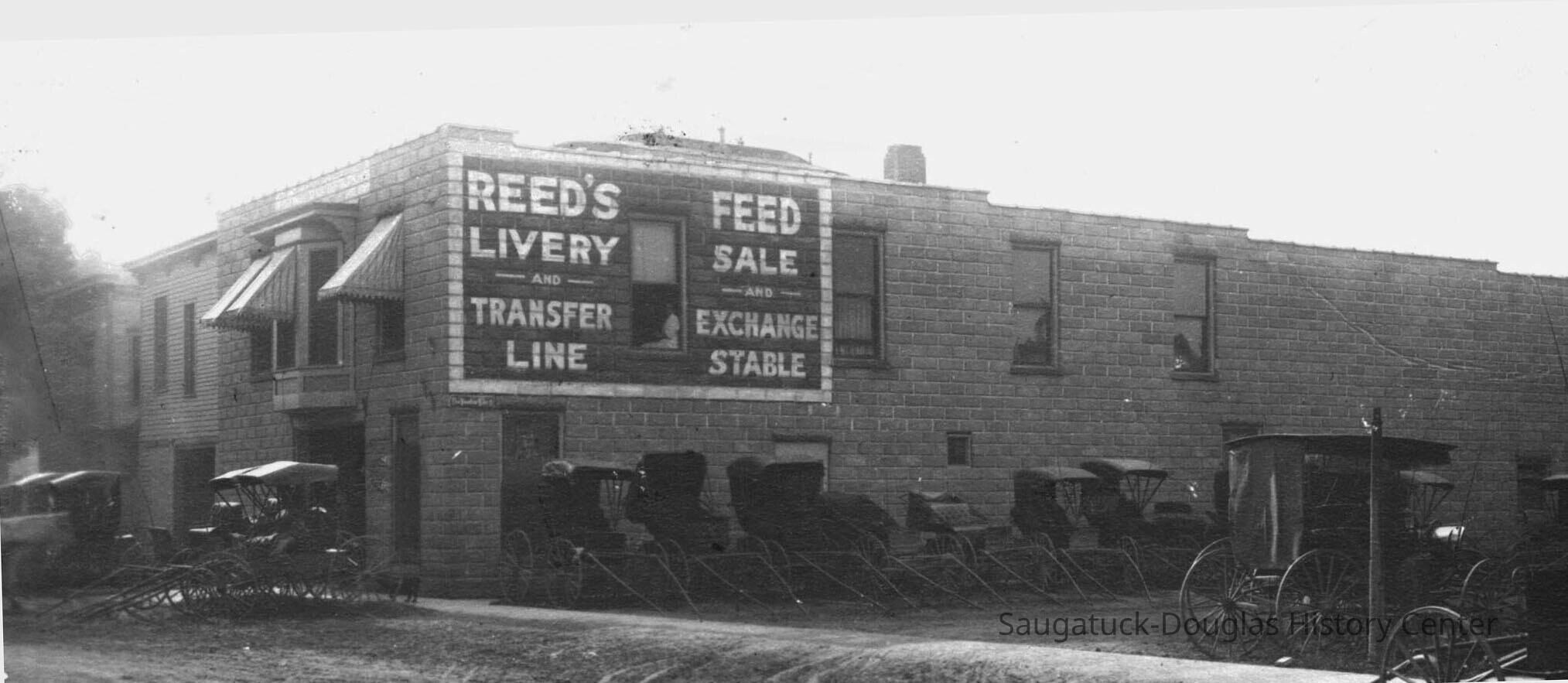 IN THEIR TIME the Reed family was one of Saugatuck’s best known family of entrepreneurs. In 1905 Roger Reed’s new livery building rose up on the site of the old Union House Hotel (for a time known as the Sherwood Hotel) which had been built in the early 1860s by Michael Spencer, the owner of Saugatuck’s first steam saw mill, as boarding house for his mill workers. We cannot find a photograph of the old hotel but it is often referred to as an unpleasant and rowdy drinking and dance establishment. As most of our readers know, fire took out many buildings in days past, and this one went that way in October of 1897—presumably to the delight of many. In its place rose up one of the busiest and modern buildings in the village of Saugatuck: Reed’s Feed, Livery and Stage Coach Station. It was the last of the village’s stage coach lines—a victim, of course, of the new fangled automobile.
