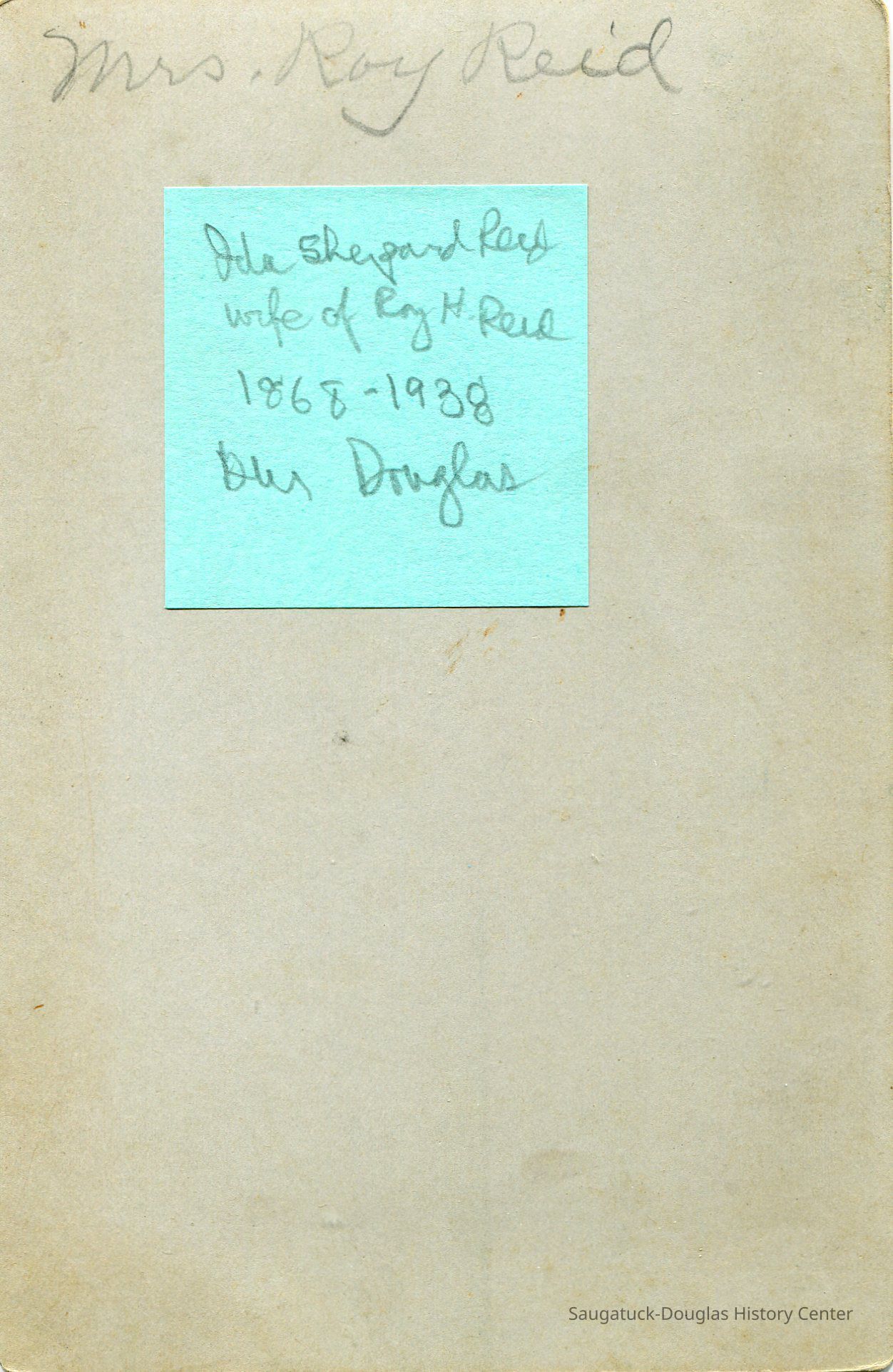 Mrs. Roy Reid is written in pencil on the back along with a green post-it noting the following in cursive: Ida Shepard Reid, wife of Roy H. Reid, 1868-1938, [unreadable squiggle] Douglas.Photograph Details