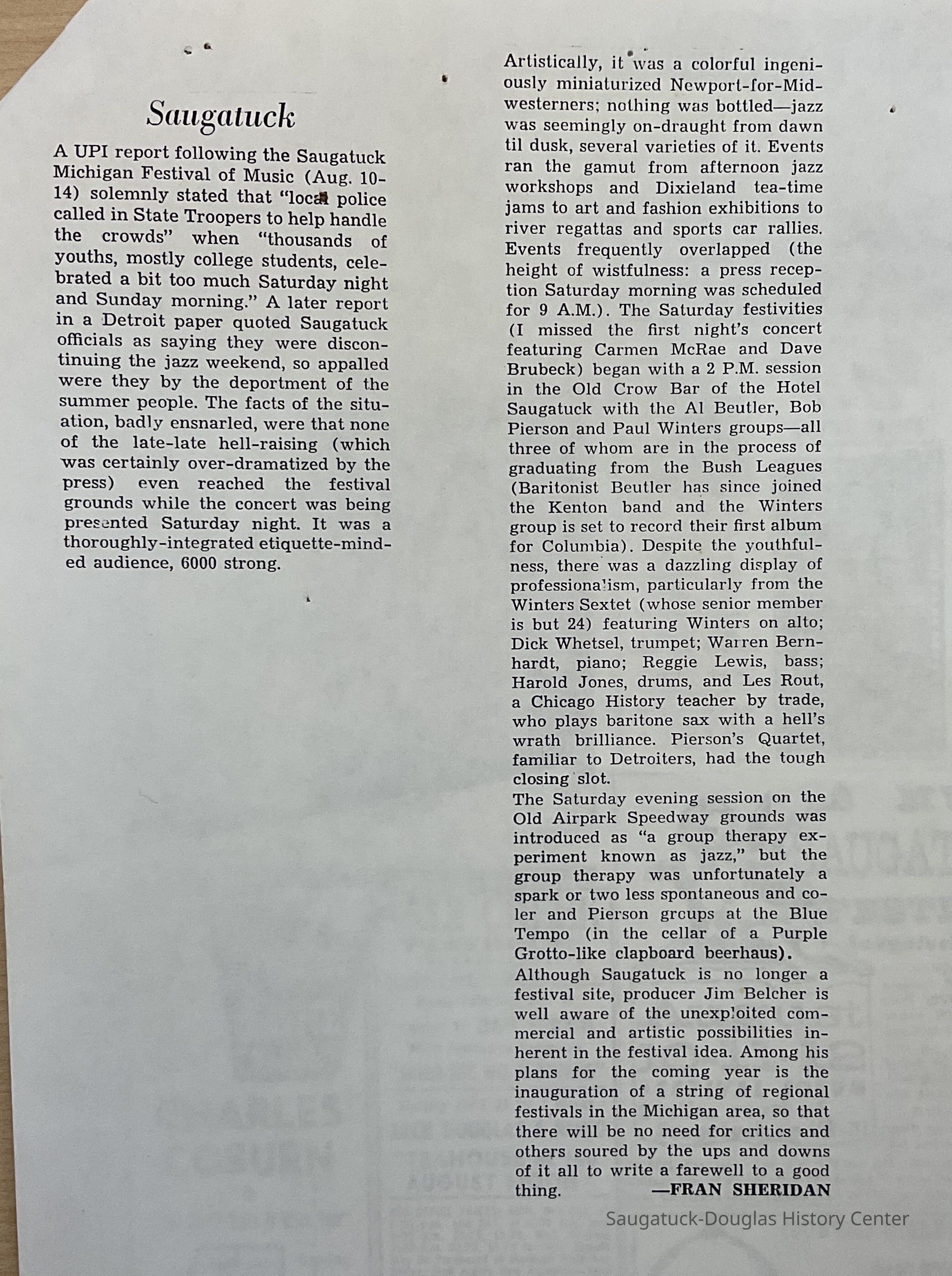 An article written by Fran Sheridan about the Saugatuck Music Festival and a refuting of the newspaper articles that were in the local papers and the Detroit newspaper about the supposed riots that were part of the festival.Collection