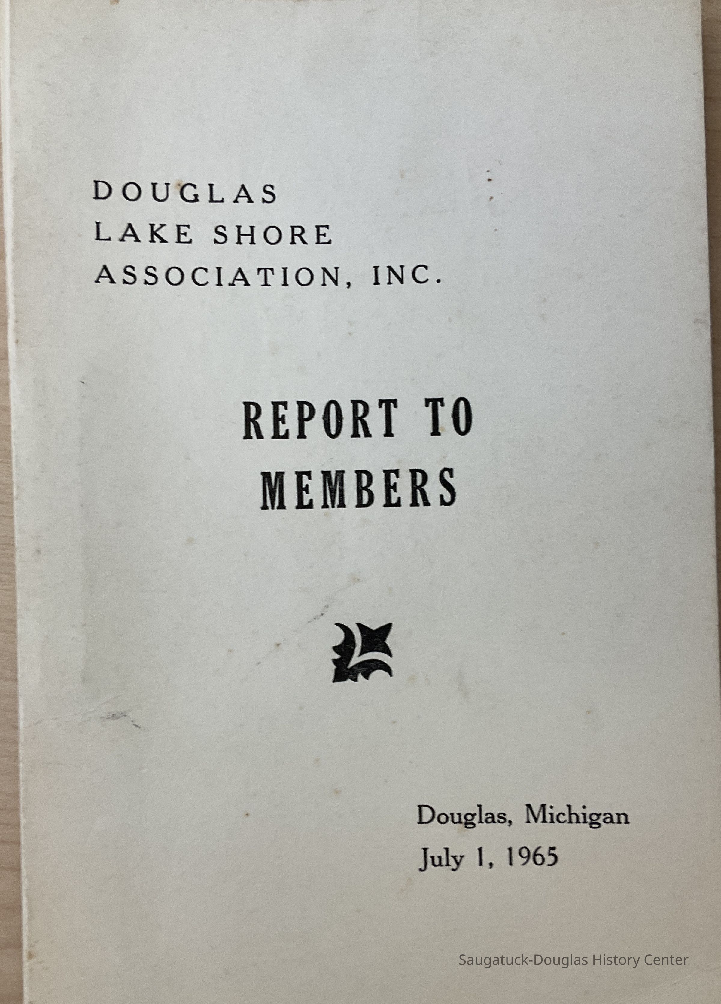 July 1, 1965 Report to Members of the Douglas Lake Shore Association, Inc. The Association was incorporated in October 1964 as a non-profit organization. It lists the By-Laws, Articles in Incorporation, and directory of Committees and Members.Collection