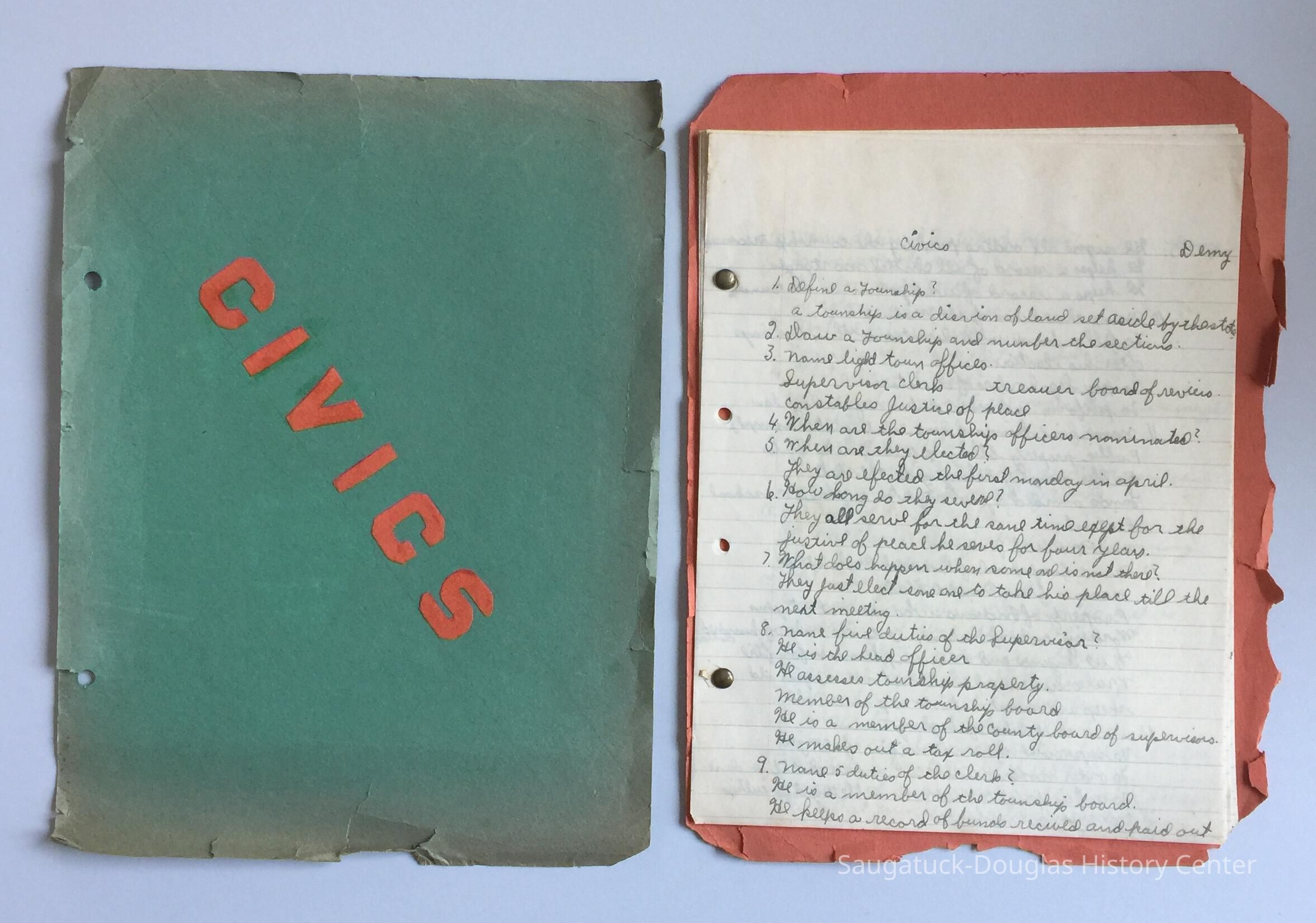 Civics booklet and Science booklet are hand made with construction paper covers and held together with metal brads. The pages are ruled paper with handwritten text. Civic cover has hand-cut orange letters on green paper