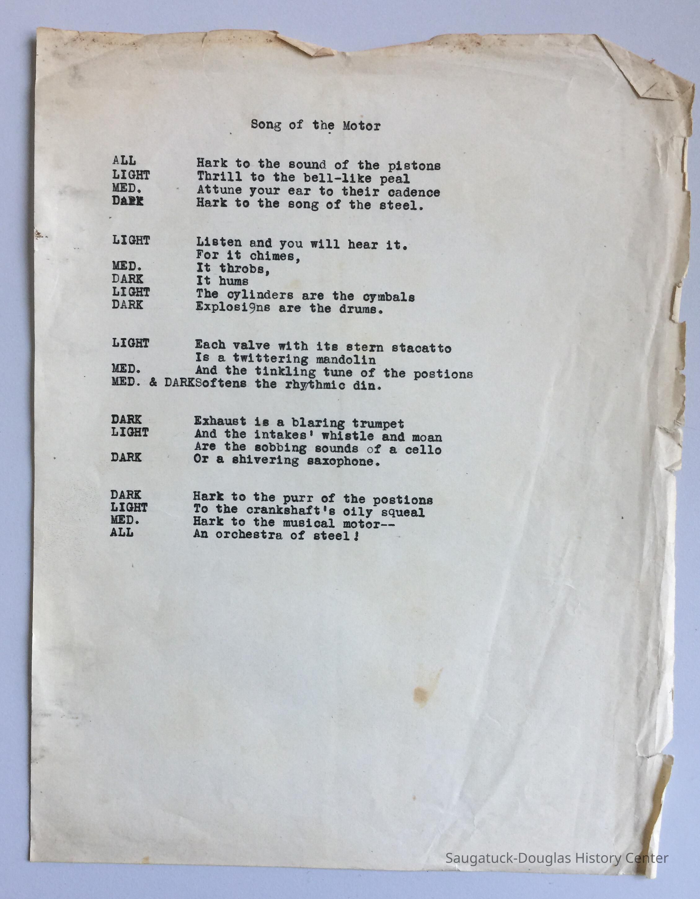 "Song of the Motor" is a typewritten poem, origin unknown. May be directions for a theatrical performance with "All" "Light" "Dark" appearing along left edge of text.Context