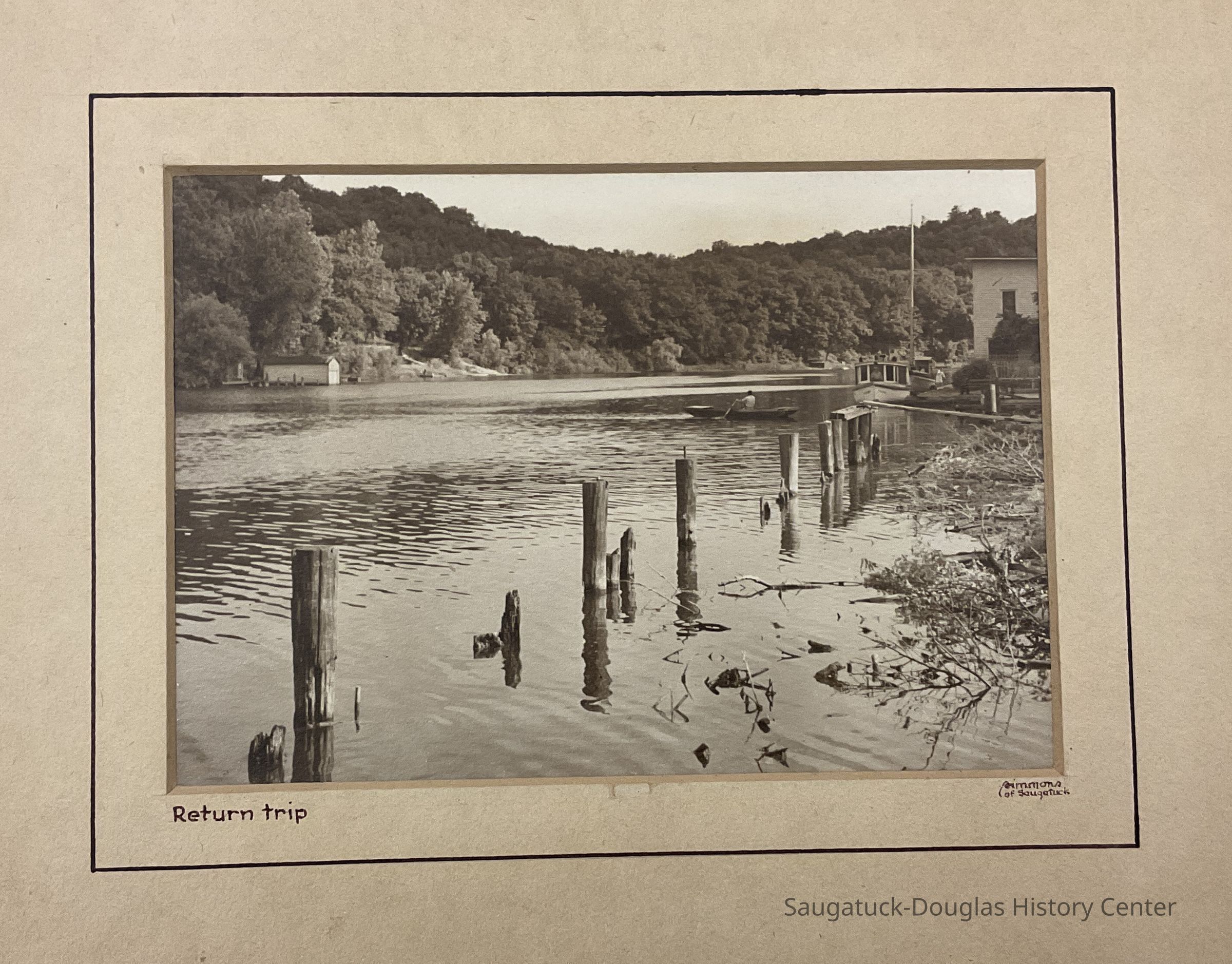 Sepia tone, 7"x5" photo of the Kalamazoo River showing a lone man in a row boat. with old pilings in the foreground and two boats moored along the eastern side of the river. It is matted and signed Simmons of Saugatuck in the lower right hand and the words, "Return Trip" in the lower left.Collection