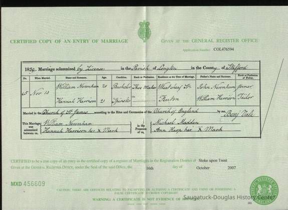 In 1839 he was married to Hannah Harrison of Stratfordshire, England, and to this union came thirteen children, John, Lucy, Hannah and Mary who always resided in England; Richard L. (an attorney in Grand Rapids), Lizzie (Mrs. J. G. Annesley, deceased), Stephen of Saugatuck and Marie of Hammond, Ind. Five children died in infancy.