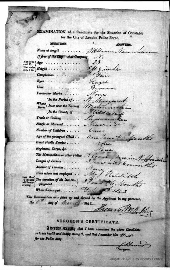 On March 5th 1844 William applied to join the London Police Force and being accepted joined them on 26th December 1844. On the 1851 Census the family are recorded in London and William had became a Station Sergeant with the City Police and rose to be an Inspector by the time he was discharged on 11th November 1858. Richard was also in the London Police Force.
