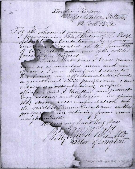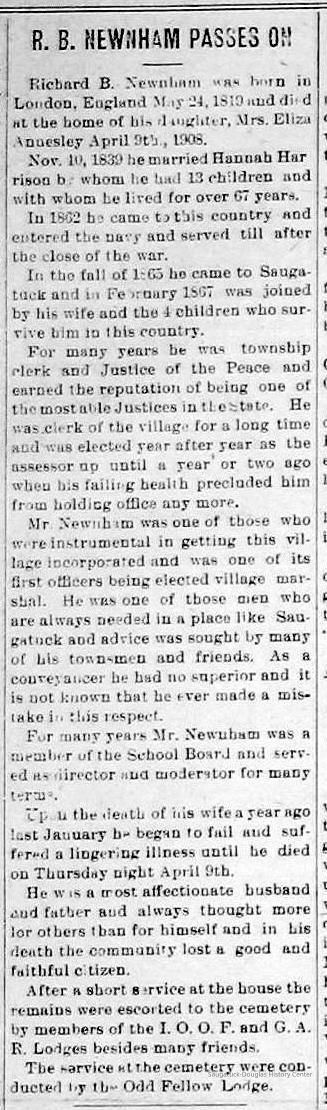 Richard B. Newnham, many years a resident of Saugatuck, has a most unusual and interesting history. He was the son of John and Lucy Newnham, natives of Hampshire, England, where he was born May 24, 1819 in the city of London, his birth taking place almost the same hour as that of Queen Victoria and only half a mile distant from the place where she was born.