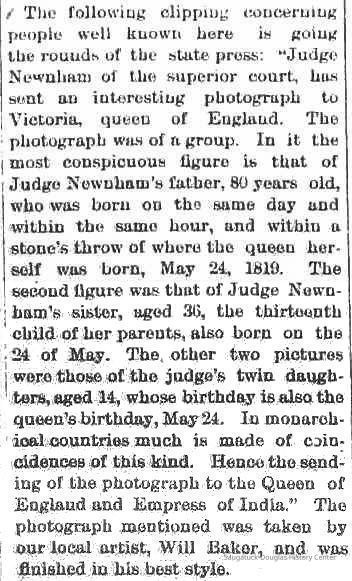 My Great Grandmother Charlotte Hannah did not see her parents again but letters passed between her sister Mary Ann's daughter Rose and Richard's grandson Stephen Linney Newnham. Also a copy of the newspaper cutting was among Mary Ann's effects reporting on Richard's letter from America to Queen Victoria with a photograph of himself, his daughter Maria and two grandchildren Laura and Lucy to tell her that he was born within an hour of her birth on 24th May 1819, and that his daughter and twin grandchildren were also born on the same day. This cannot be coincidence! American descendants have recorded that the royal household returned a photograph of four members of the royal family--of different generations--including the Queen herself, the Prince of Wales, the Duke of York, and the infant son of the last named.