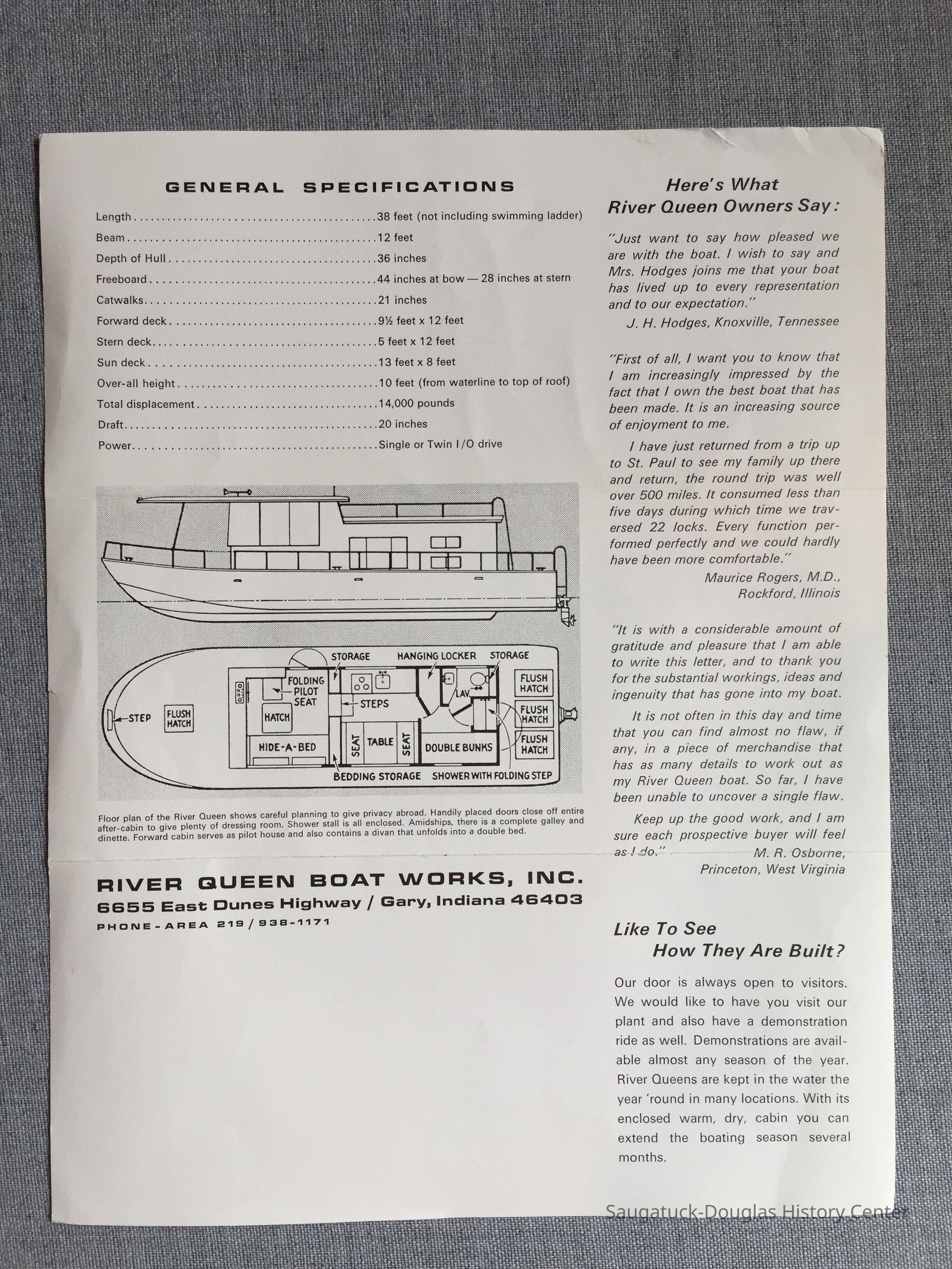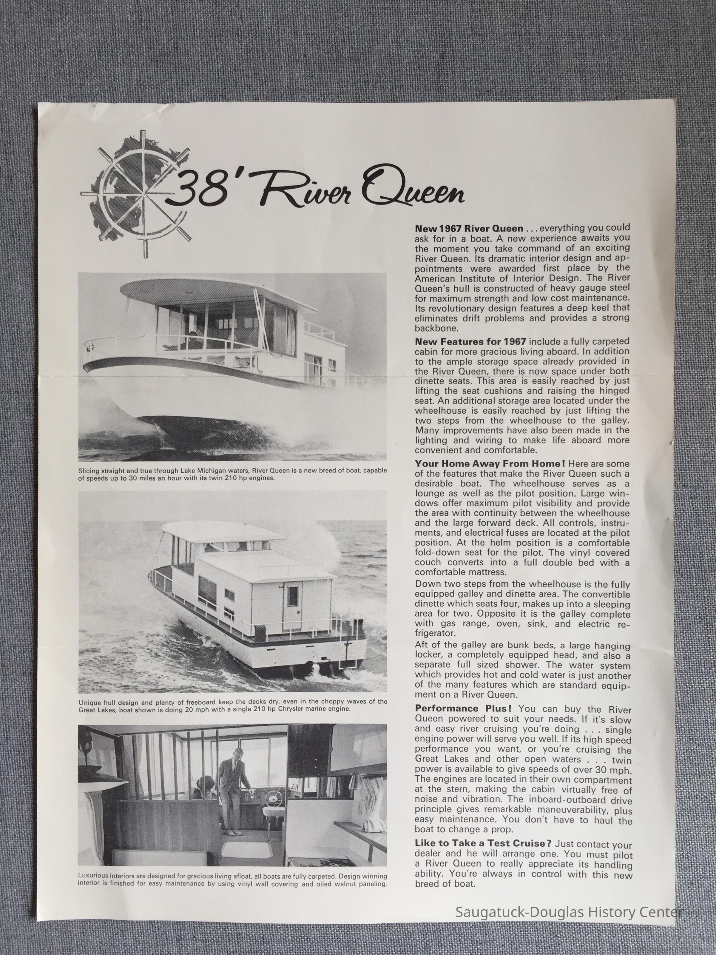 Two-sided flyer to sell the 38' River Queen houseboat. The flyer includes the logo, b/w photos with captions, text descriptions, specifications, a drawing and floor plan, quotes from satisfied customers and contact information.Context