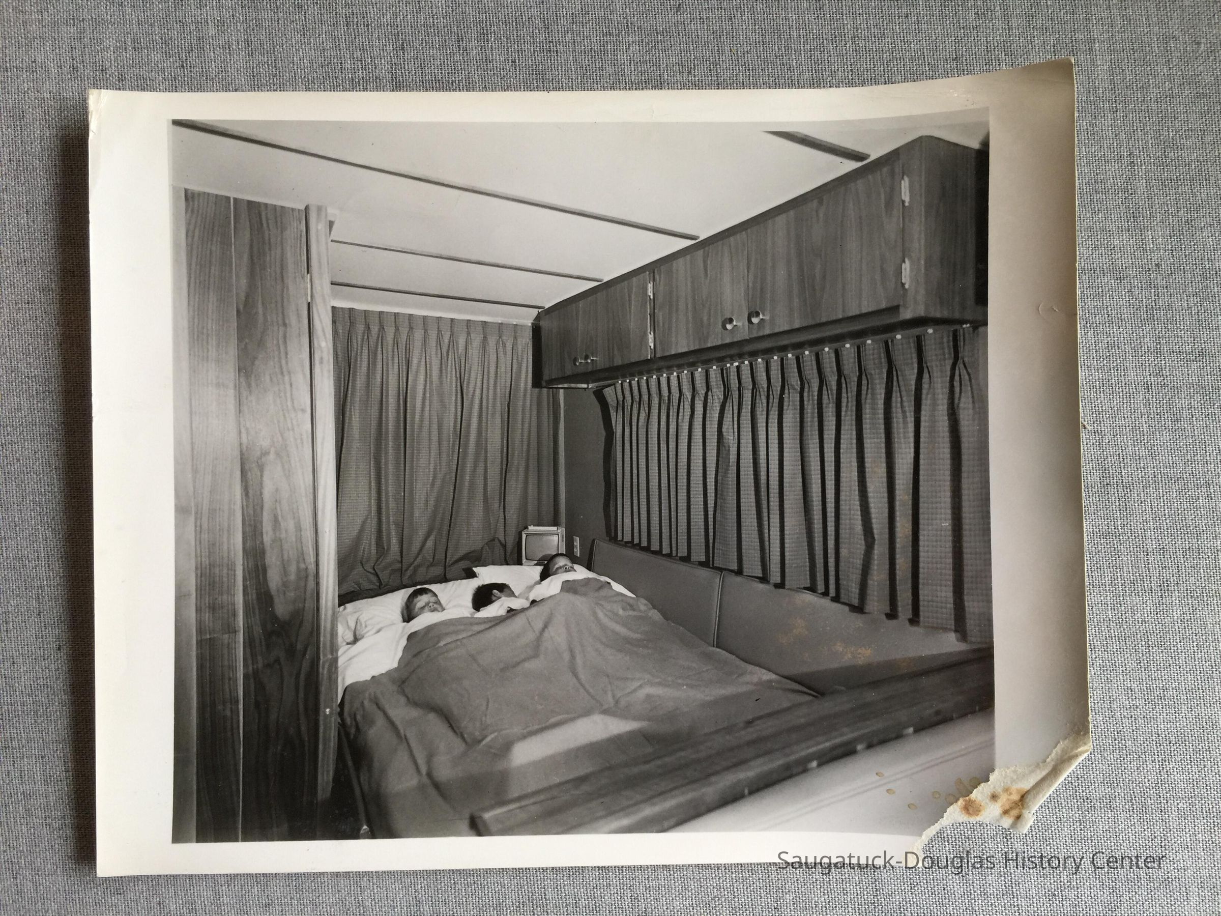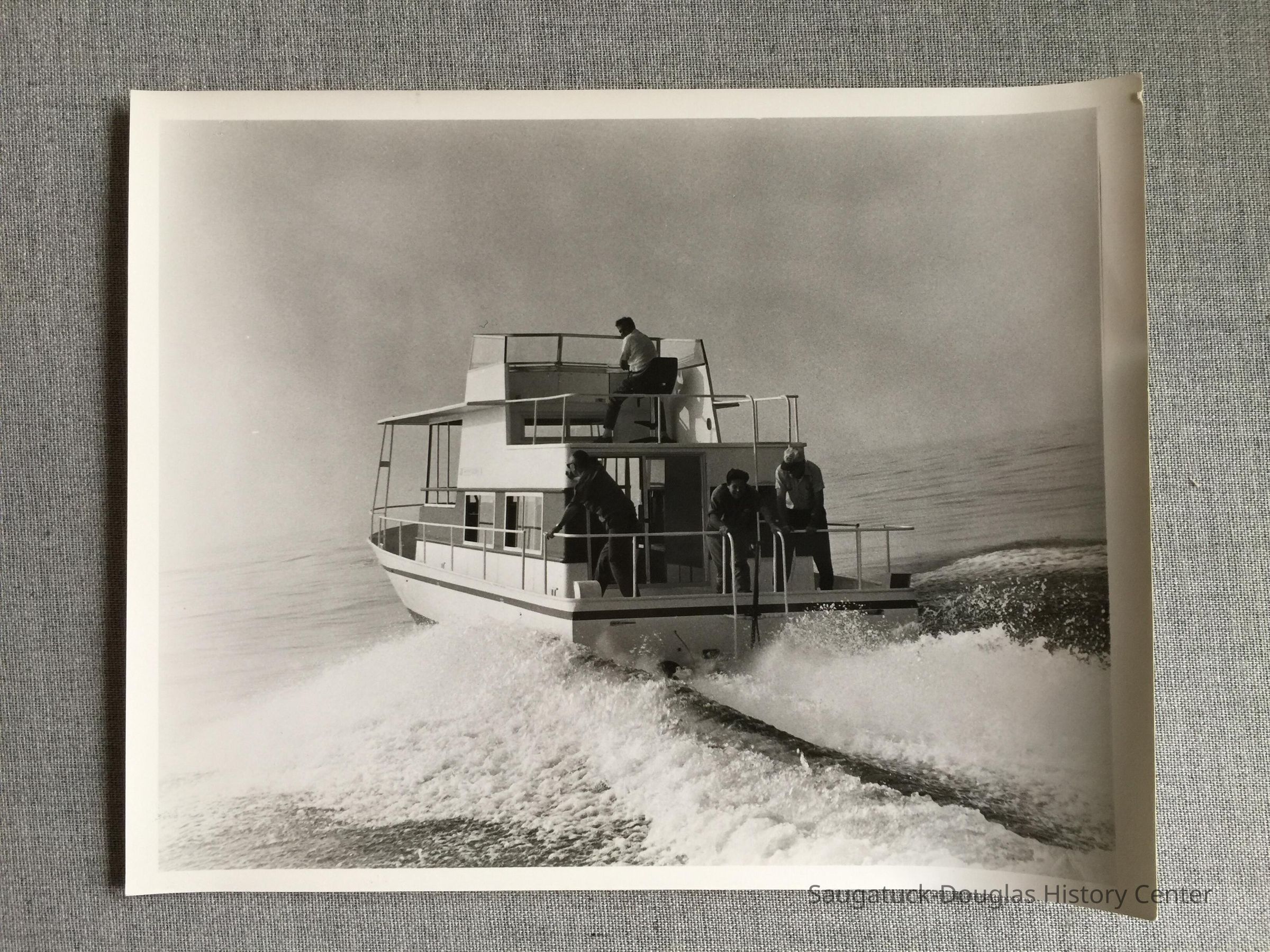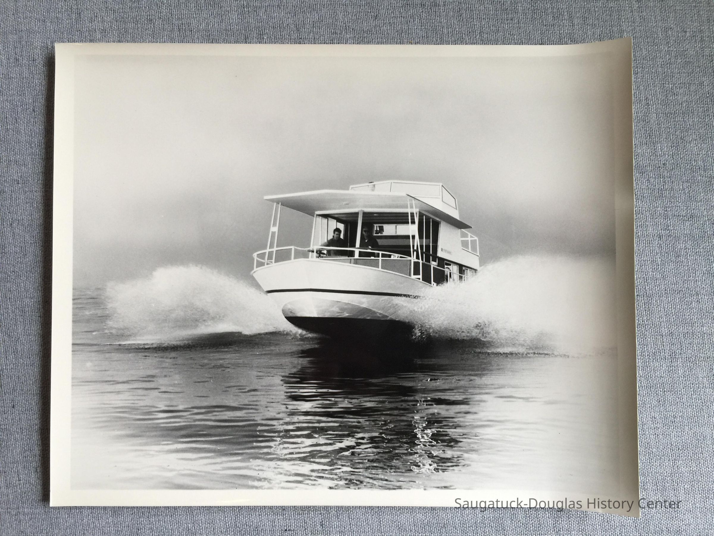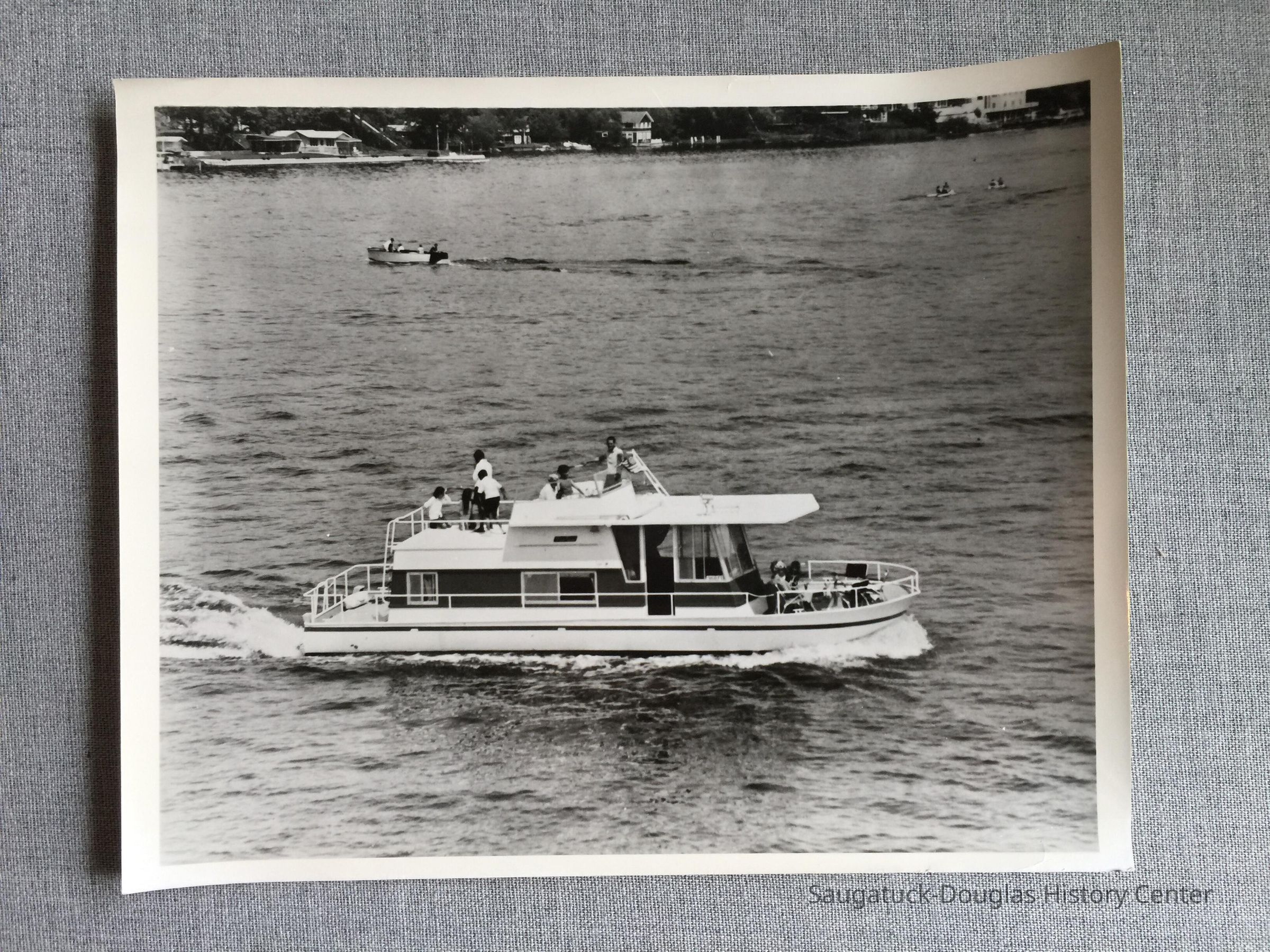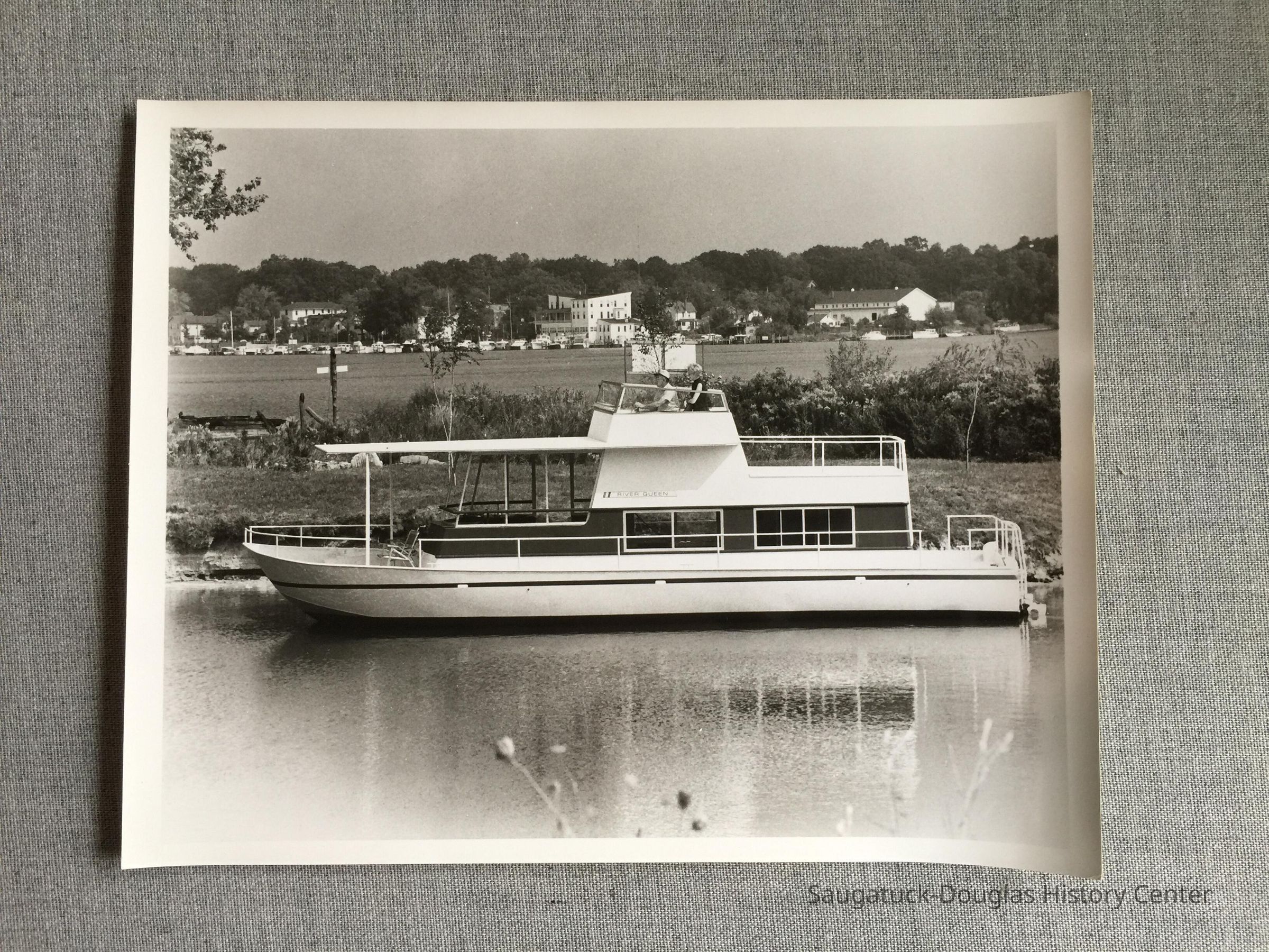 Collection of black and white photos of the River Queen house boat. Each print has a stamp on the back with the name and address of advertising company and the negative number.Collection