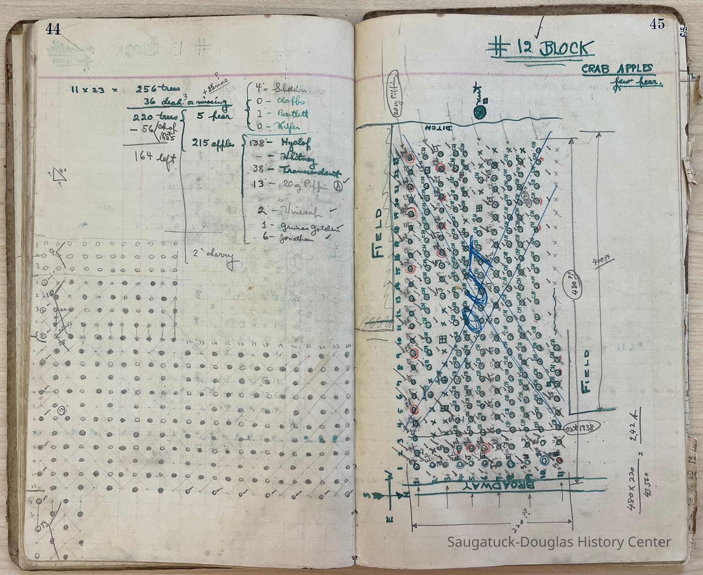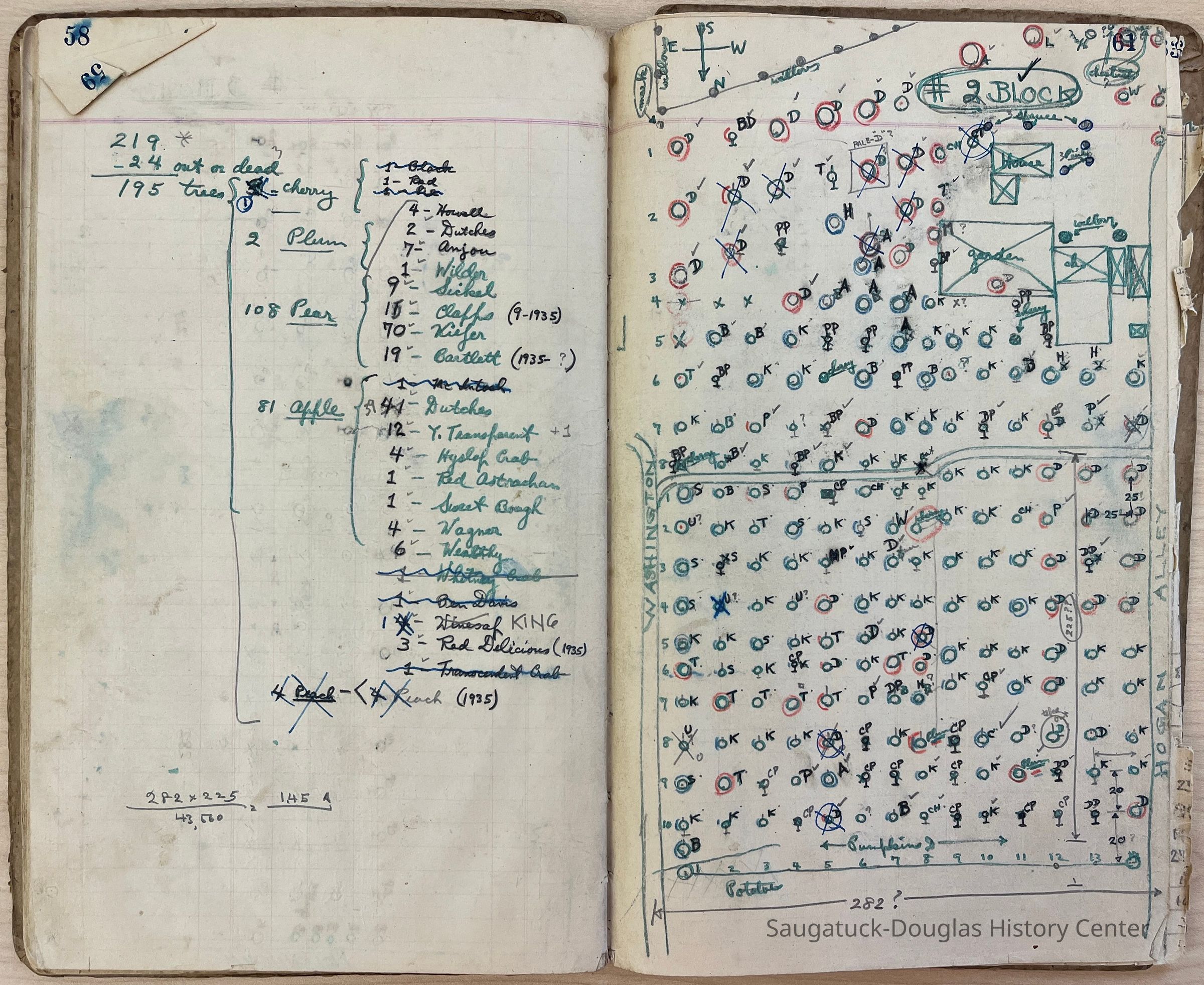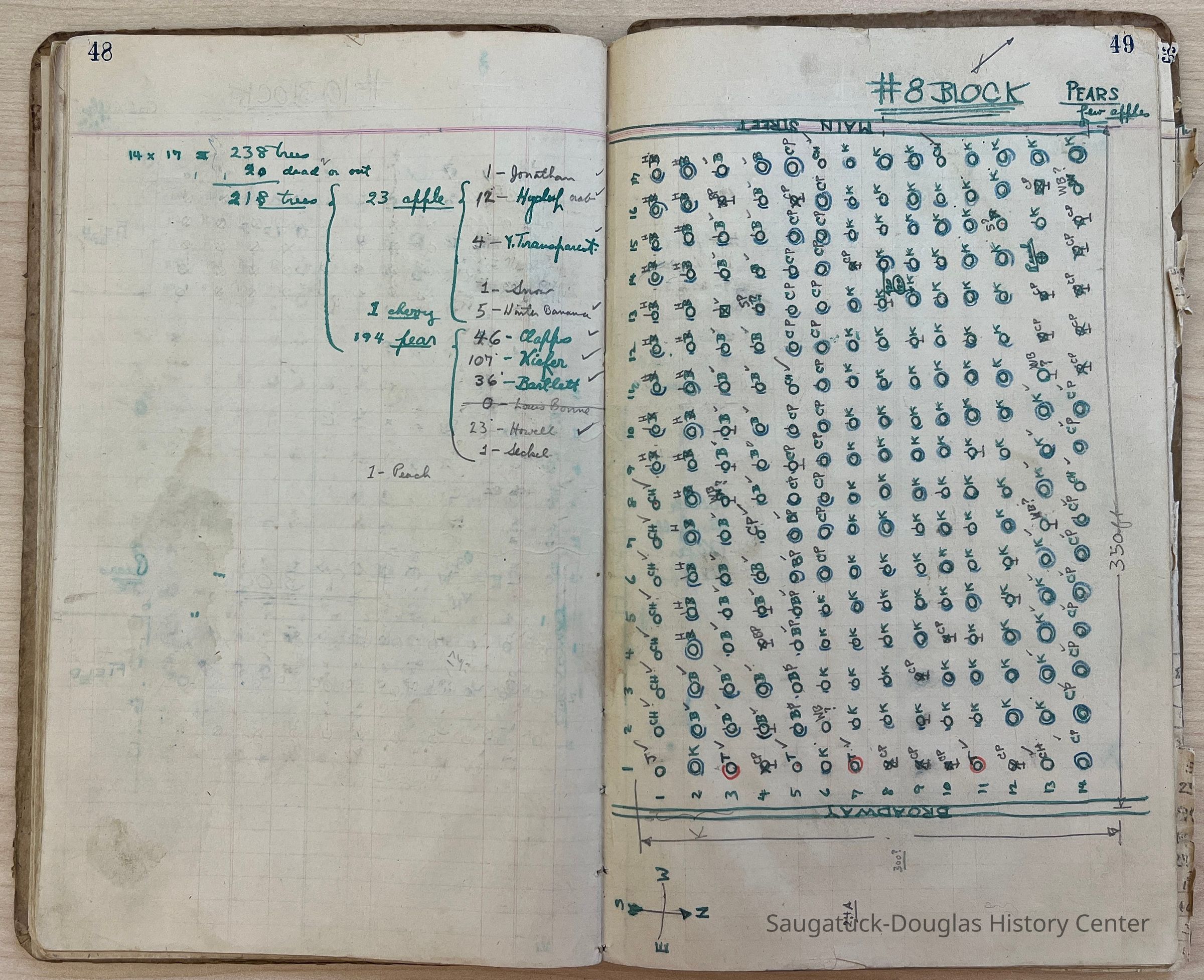 Six Riverside Farm account books for the years 1933-1940 plus an index/expenses marked 1917. The books includes land-use maps, calculations, addresses, general expenses and fruit variety notations. The farm grew many varieties of apples, crab apples, plus pears, cherries, plums and peaches.Collection