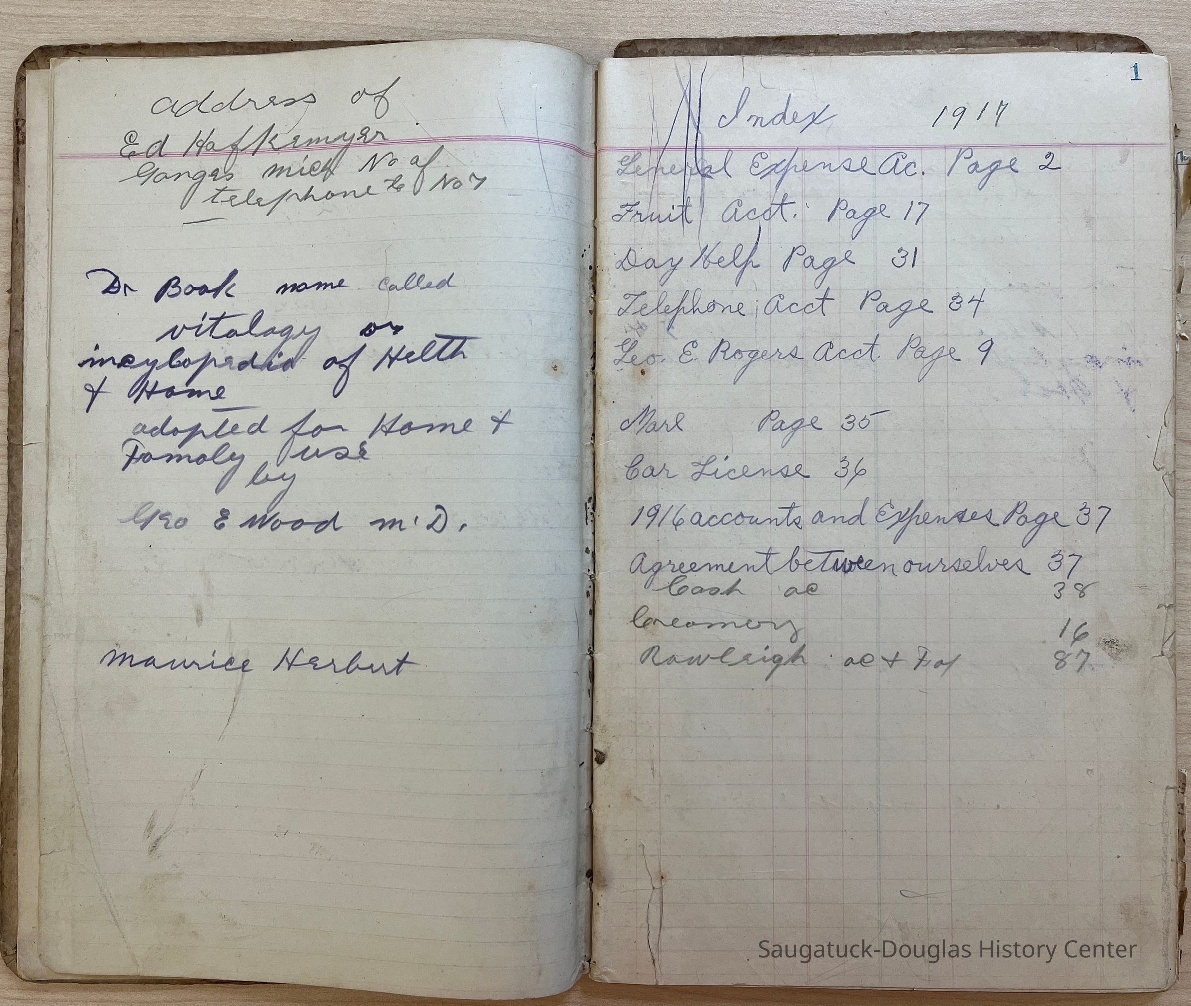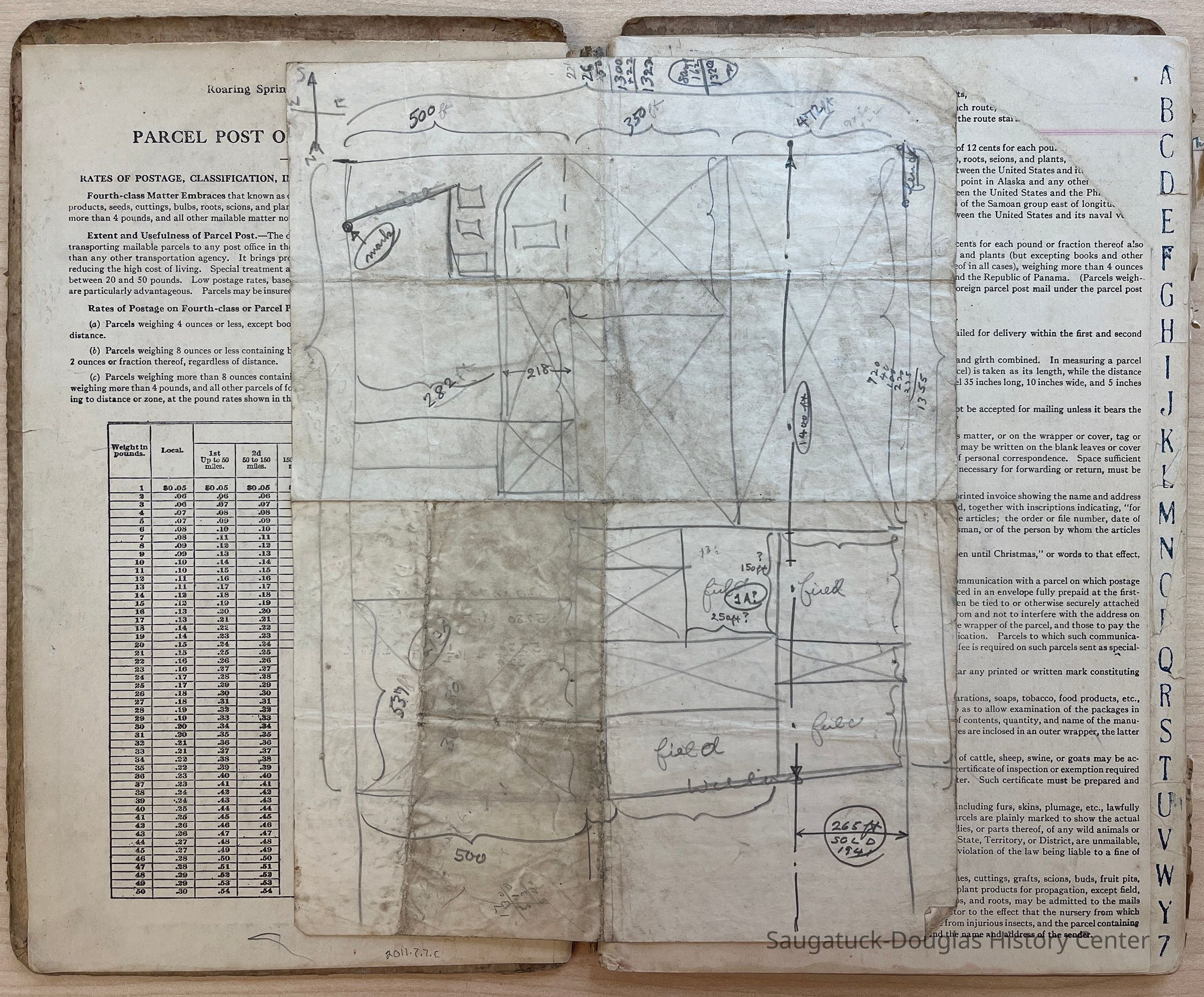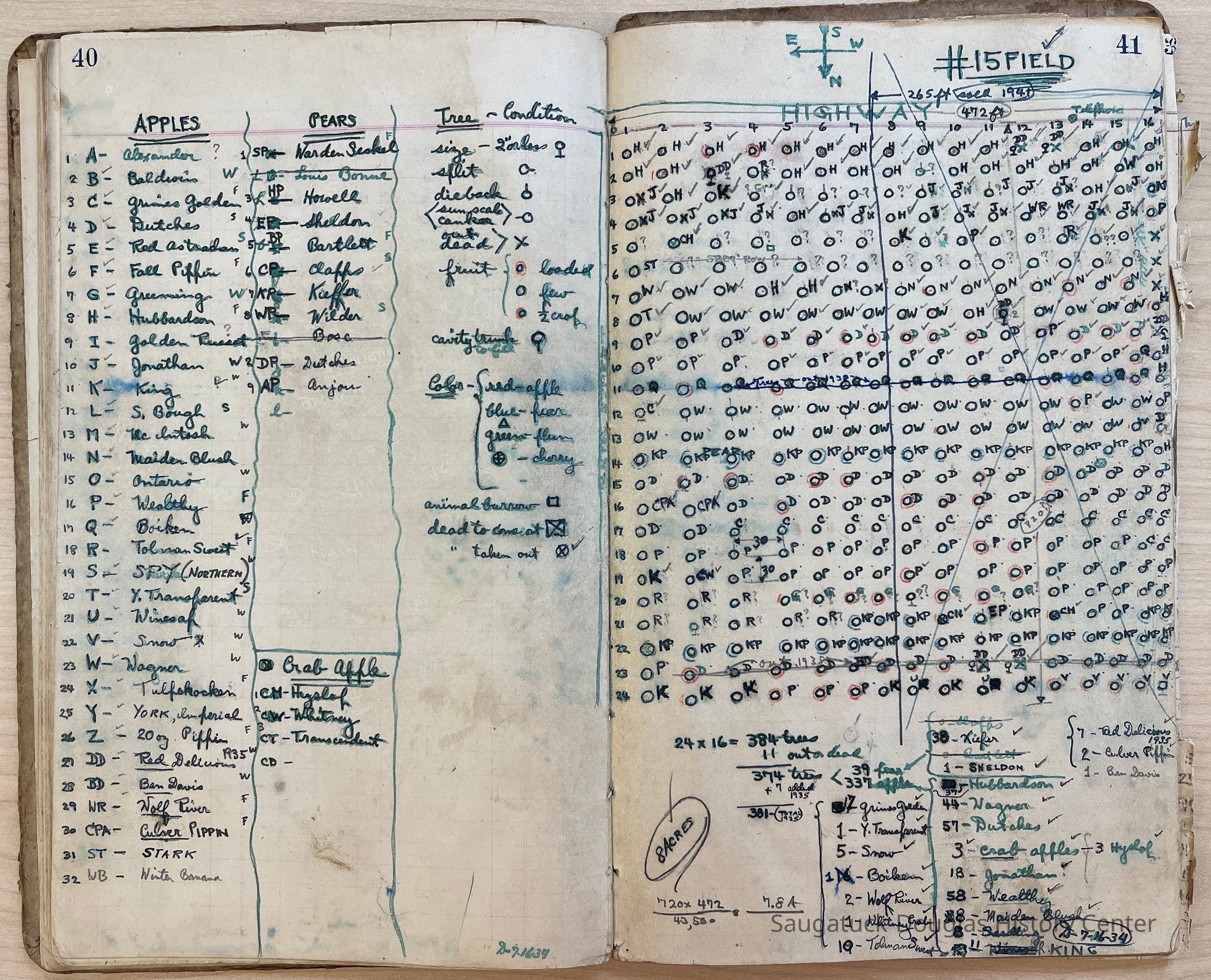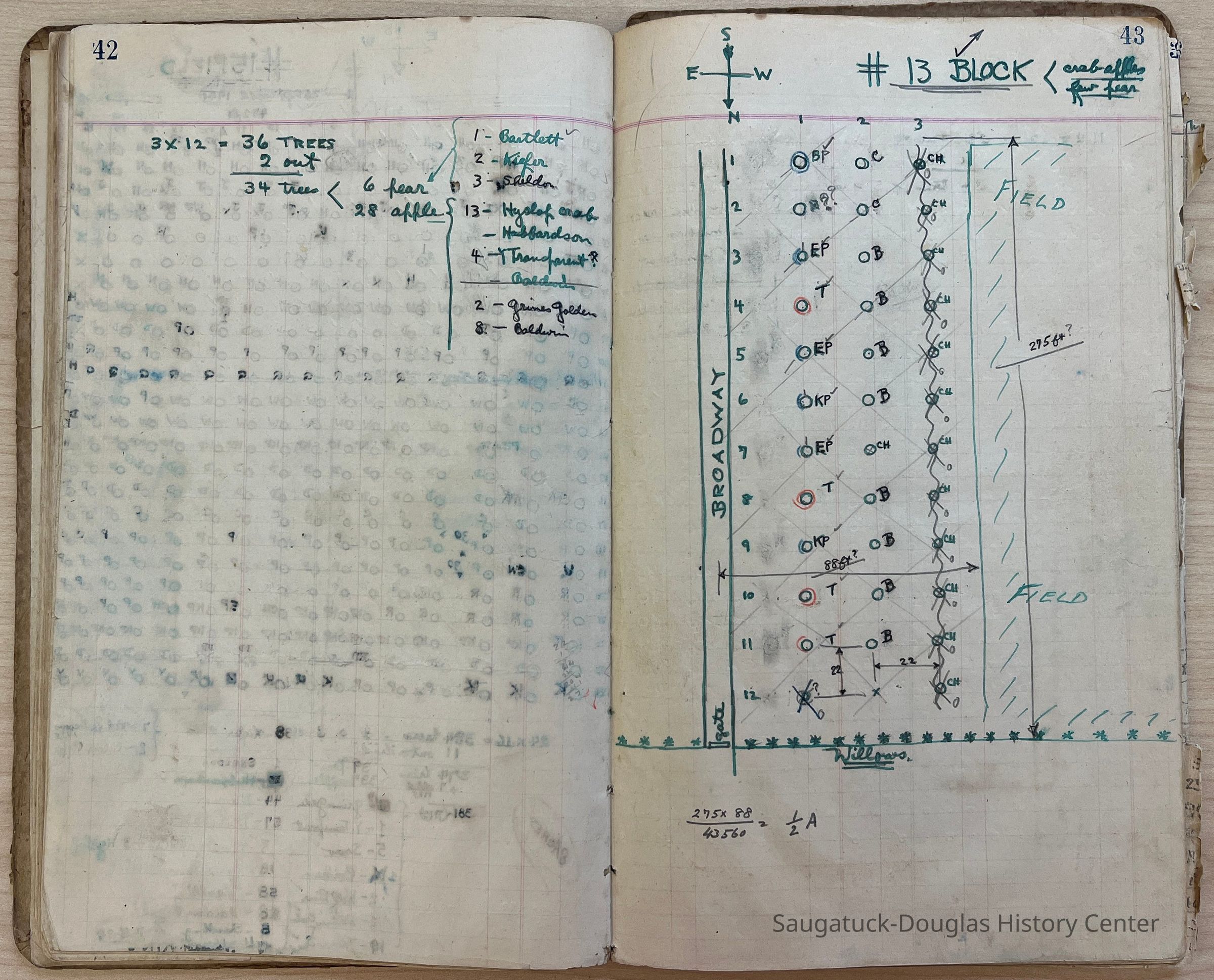 Six Riverside Farm account books for the years 1933-1940 plus an index/expenses marked 1917. The books includes land-use maps, calculations, addresses, general expenses and fruit variety notations. The farm grew many varieties of apples, crab apples, plus pears, cherries, plums and peaches.Collection