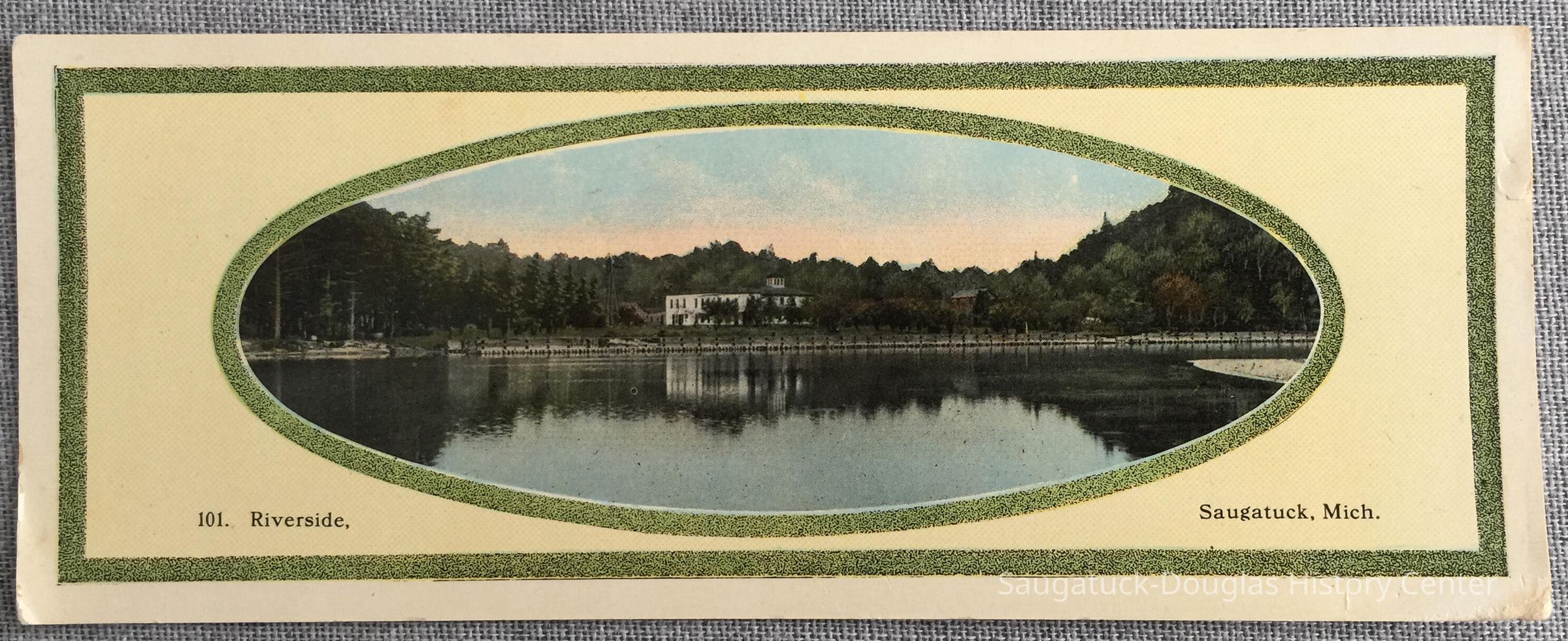 Mailing card with a view of the Riverside Inn and channel walls at the last turn of the Kalamazoo River. The color image is centered in a green oval and rectangular frame on a long, horizontal card.