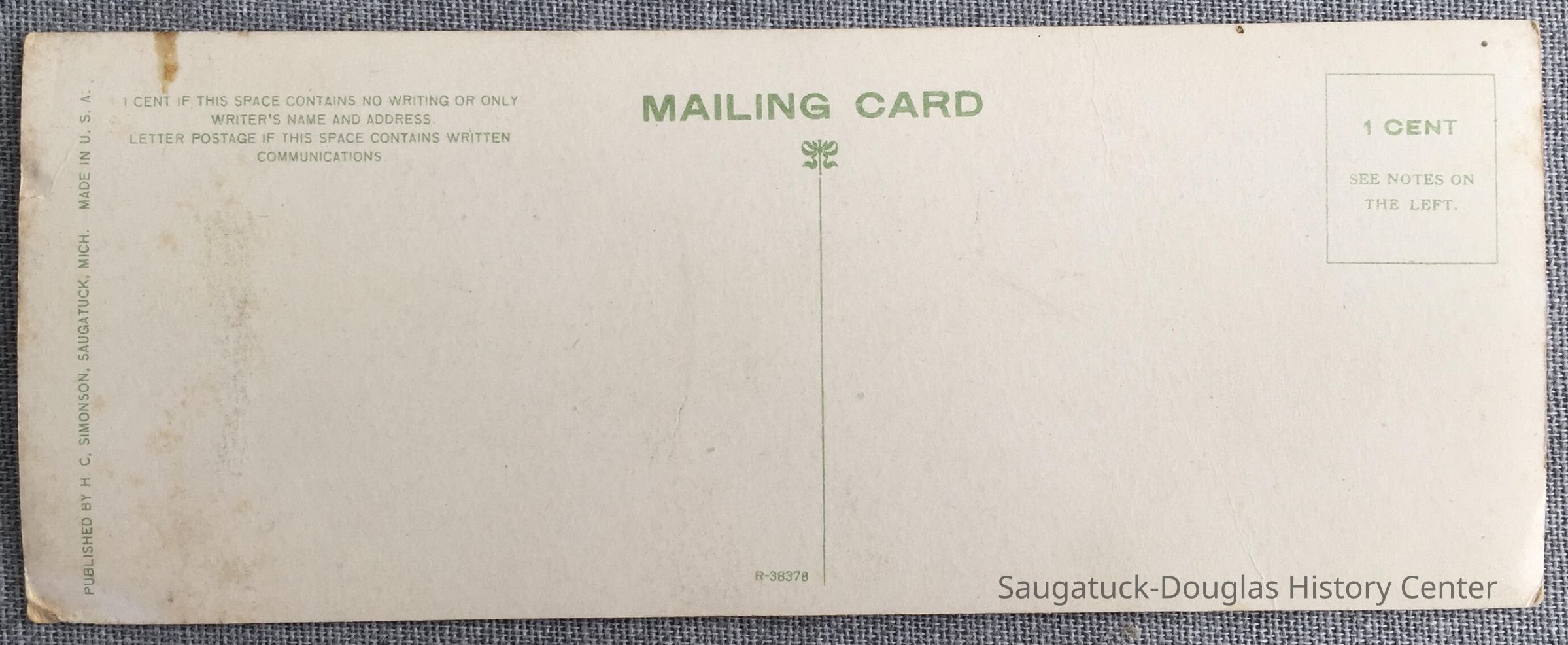 The code R-38378 is on the center bottom of the card back. Postage is noted as 1 cent "see notes on the left."