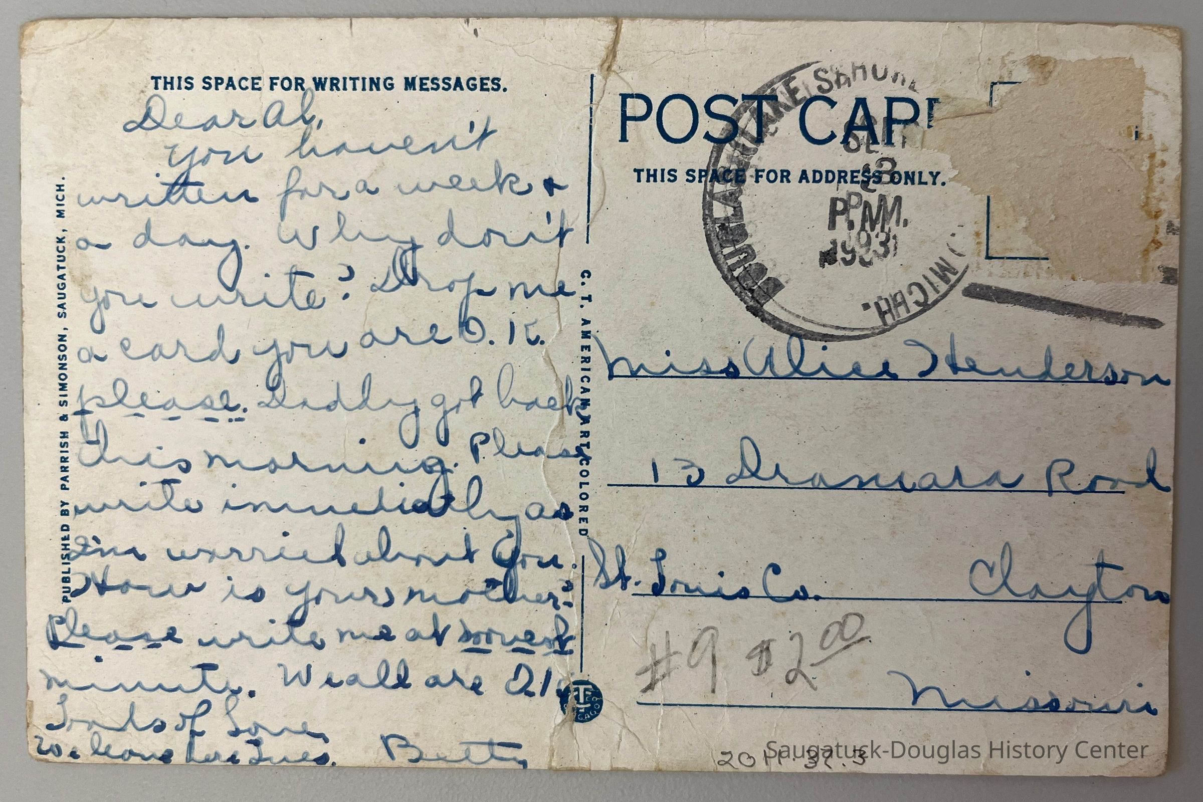 Color postcard of the bridge connecting Saugatuck and Douglas. Mailed to "Dear Al" from Betty. 36385Subject Person/Organization