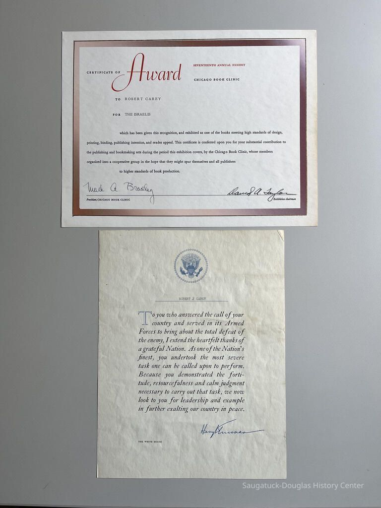 D. Award to Robert Carey from 1953 Chicago Book Clinic for "The Israelis." Undated.