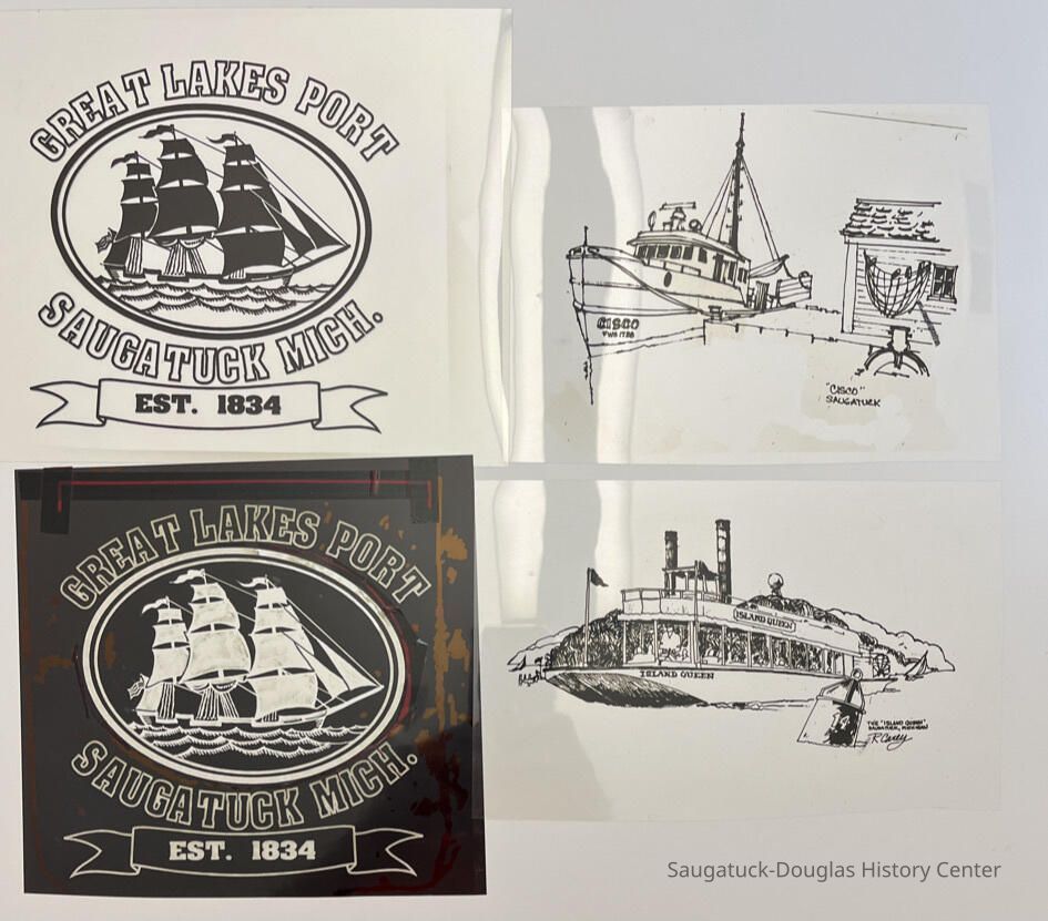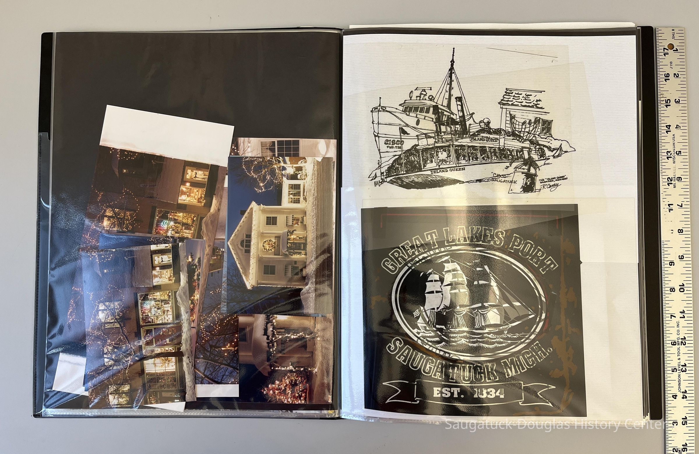Black vinyl portfolio with clear plastic pages stuffed with photographs and illustrations created by Douglas resident and historian Rob Carey. Collection includes images of fireworks over Lake Kalamazoo, winter/snow scenes, Saugatuck Village Hall, the Maplewood Hotel, The Butler, Butler Street, Wick's Park, the boardwalk and docks at Cook Park, Le Levant, The Blueberry House (the Carey home in Douglas), the Peterson Grist Mill, the Chain Ferry, the replica lighthouse at Tower Marine, the Star of Saugatuck, the Keewatin, the gazebo at Coghlin Park, view from Mt. Baldhead, custom-made signs, Oval Beach, logo for a "Saugatuck University", negatives and positives for "Great Lakes Port" design and Cisco and Island Queen boat/ships illustrations. Some motives used for screen printing t-shirts for his shop on Butler Street.