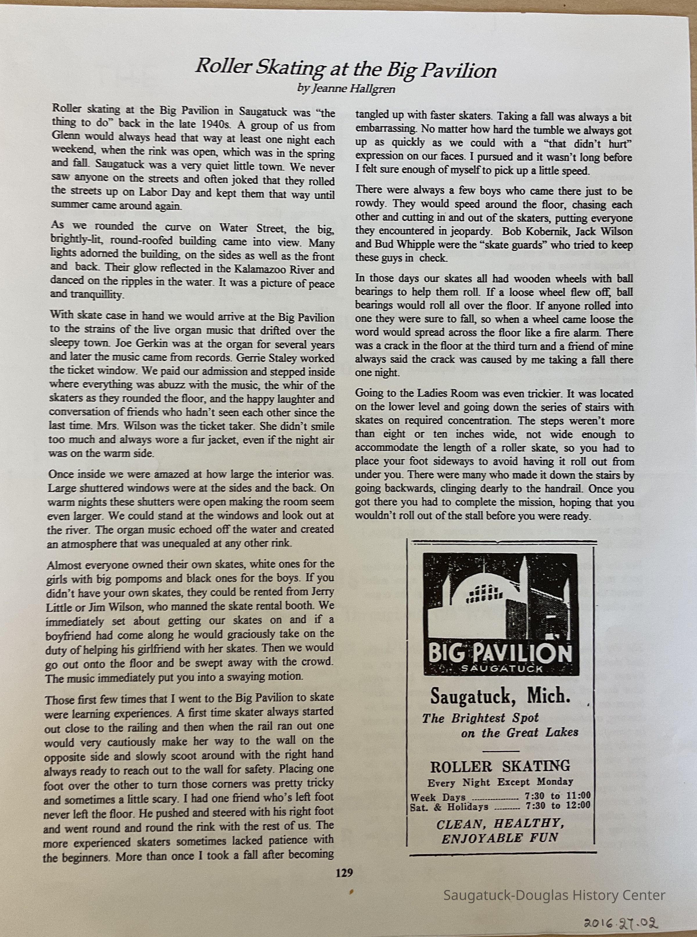 a copy of an memoir written by Jeanne Hallgren about roller skating at the Big Pavilion in the 1940s. It was published in the Society newsletter , (date? ) p. 129Collection