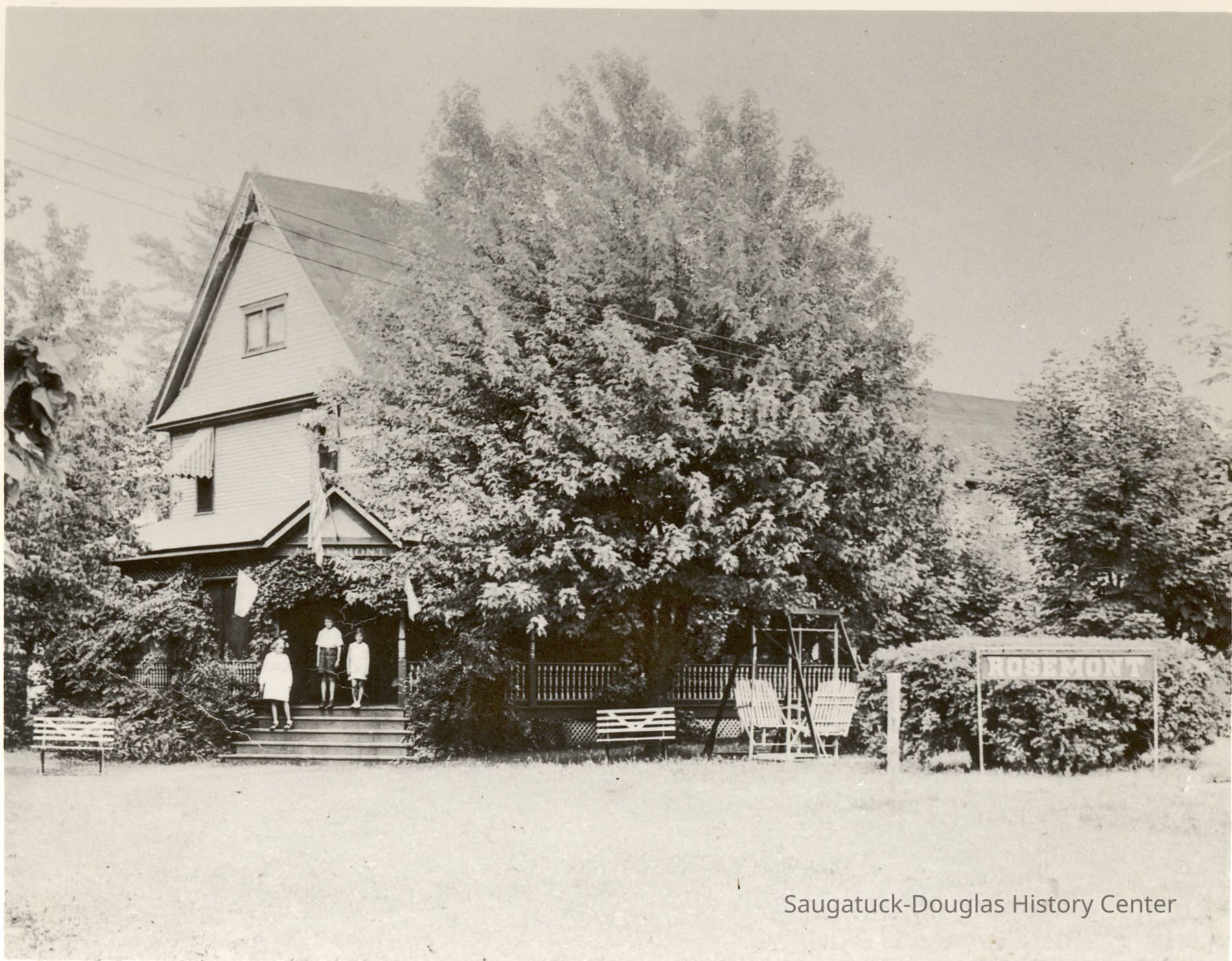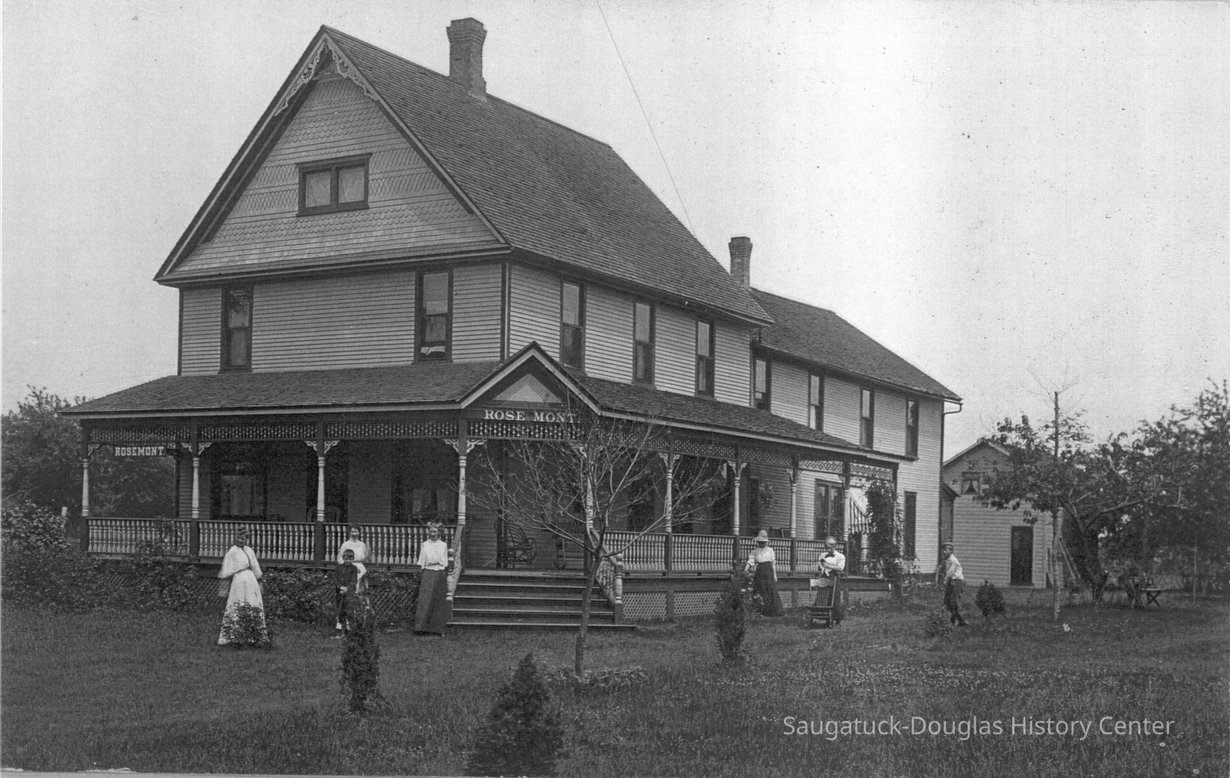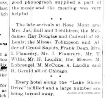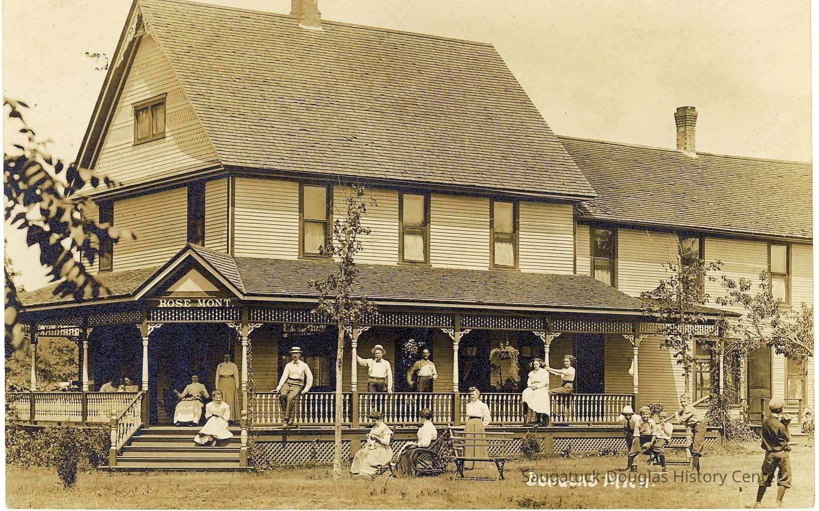 About this time, the Lake Shore area was becoming a vacation destination. The Rosemont (initially named Rose Mont) was established by 1904 after an addition was built onto the front of the new building. Samuel had some understanding of hotel management since his parents had operated a hotel in Kalamazoo. Initially, the resort served meals. The lower level of the rear building was occupied by dining and kitchen areas. Over time it became a Rooming facility and later a Bed & Breakfast. The lake shore area became part of the Village of Douglas in 1904. Hallie and Douglass built homes just to the south of the resort. Willis built his home along Center St. Over time all other lots abutting Lake Shore Drive and Center St. were sold.