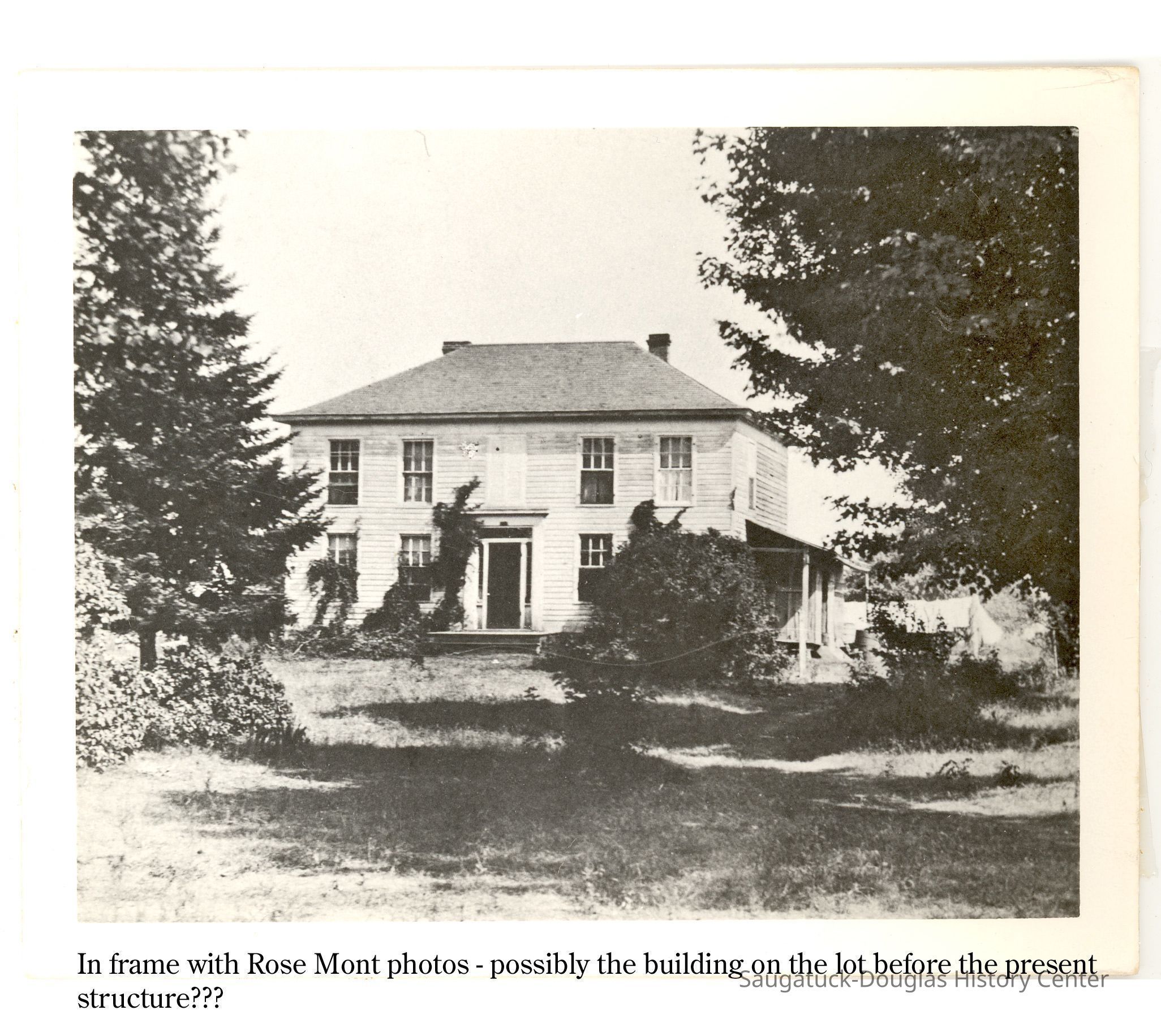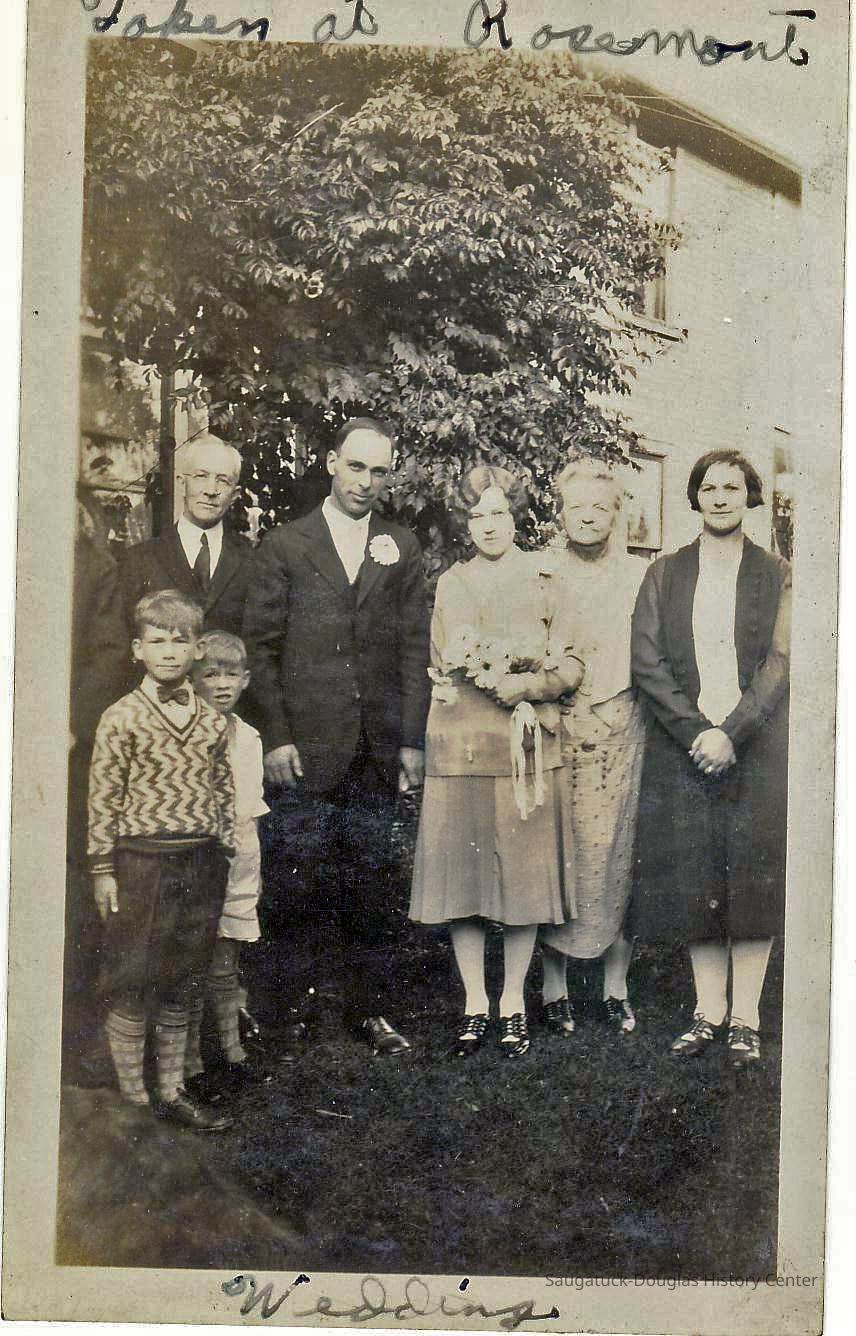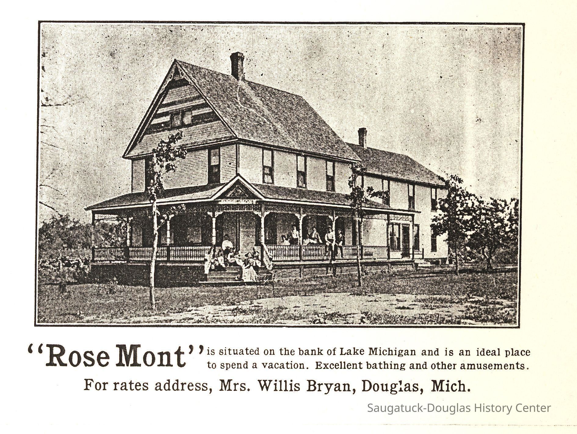 About this time, the Lake Shore area was becoming a vacation destination. The Rosemont (initially named Rose Mont) was established by 1904 after an addition was built onto the front of the new building. Samuel had some understanding of hotel management since his parents had operated a hotel in Kalamazoo. Initially, the resort served meals. The lower level of the rear building was occupied by dining and kitchen areas. Over time it became a Rooming facility and later a Bed & Breakfast. The lake shore area became part of the Village of Douglas in 1904. Hallie and Douglass built homes just to the south of the resort. Willis built his home along Center St. Over time all other lots abutting Lake Shore Drive and Center St. were sold.