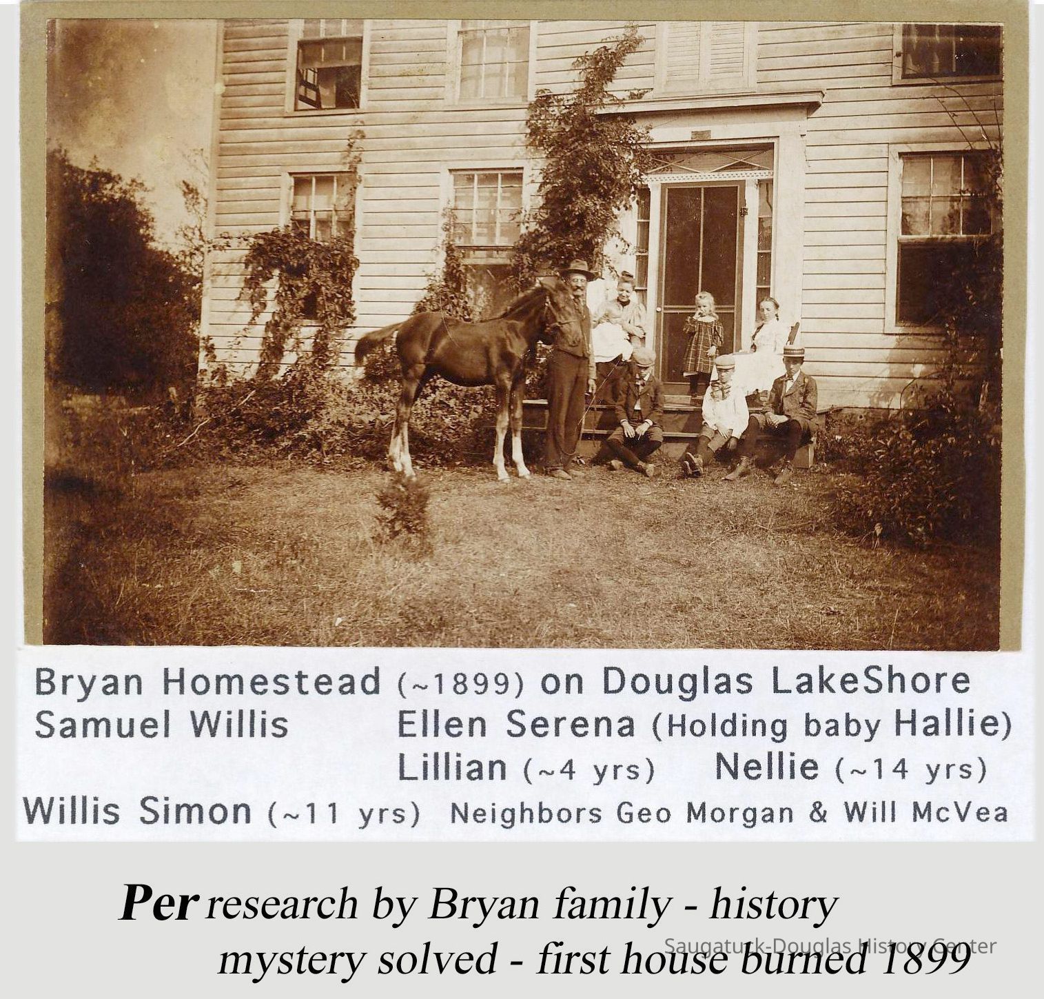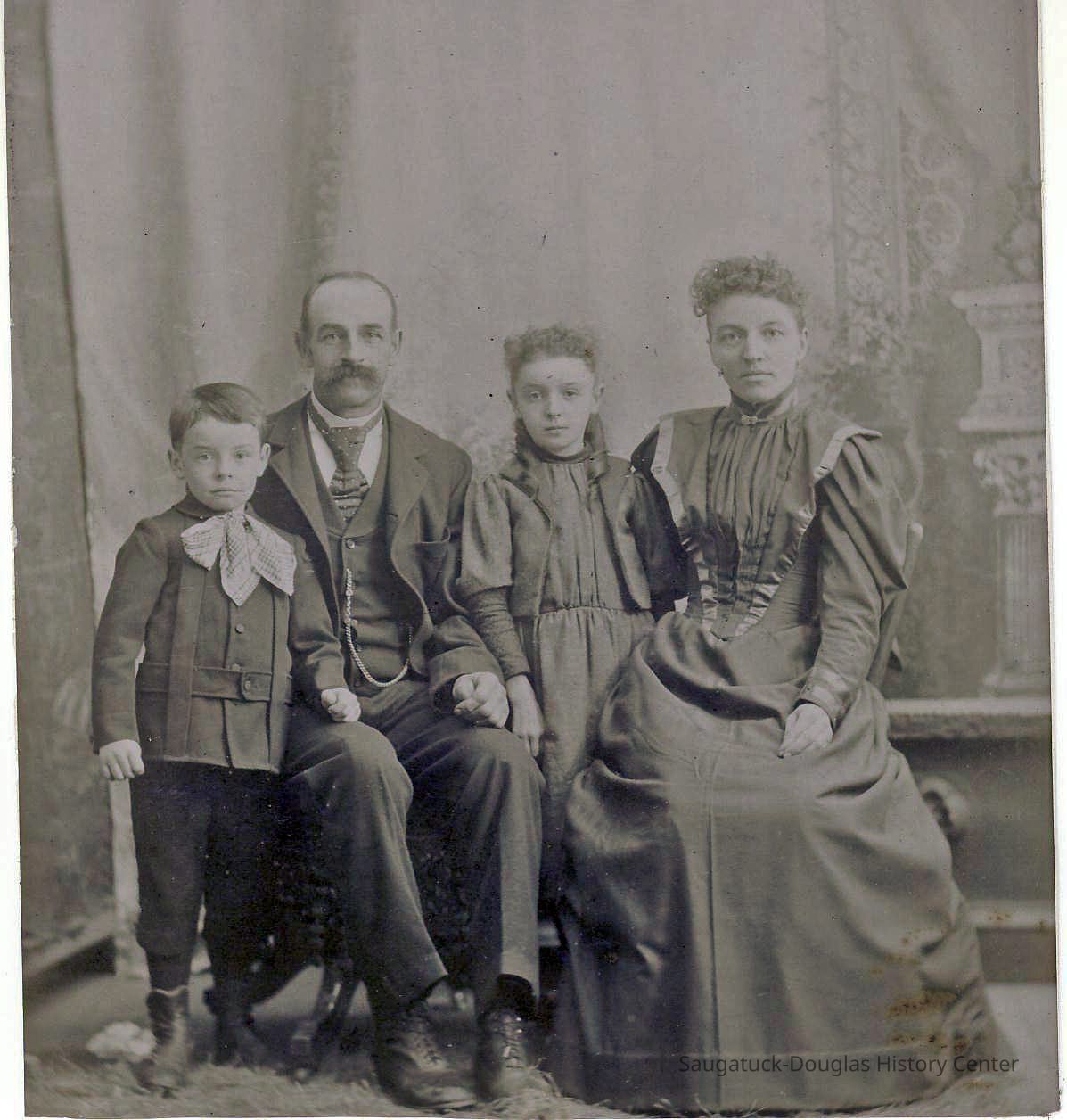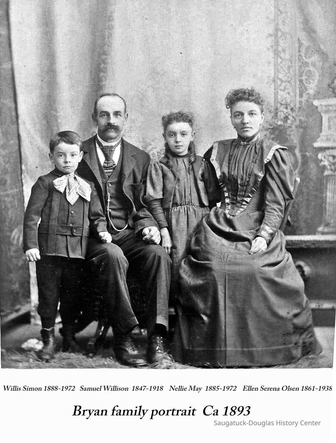 Samuel Willison Bryan Jr. (born Kalamazoo, Dec. 24, 1847) and Ellen Serena (Olsen) Bryan married in 1882. In 1886, they purchased the 40 acre farm. The property, which originally extended east from Lake Michigan and north from Center Road, would eventually be occupied by a number of private dwellings, the Douglas Public Beach, the Rosemont Resort, a chestnut grove and portions of the Golf Course. Unfortunately, in the 1890s the area peach growing economy suffered major losses due to weather and several genetic malignancies. Trees began producing deformed fruit. The government eventually required the cutting and burning of entire orchards to prevent further spread of the disease. The Saugatuck Township property tax in 1896 was $17.76, based on an assessed valuation of $1000. Children Nellie, Willis, Lillian and Hallie were born in the farmhouse.