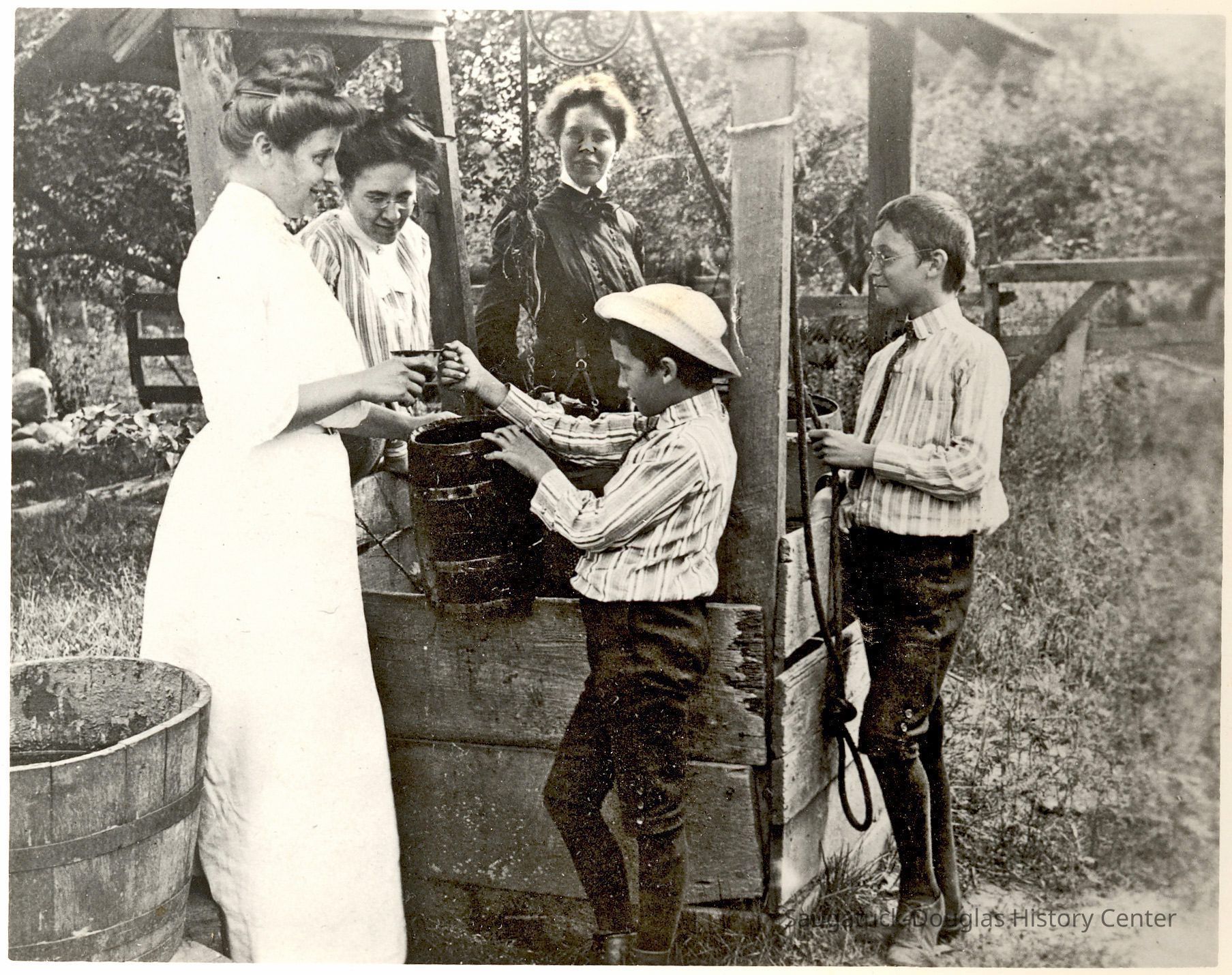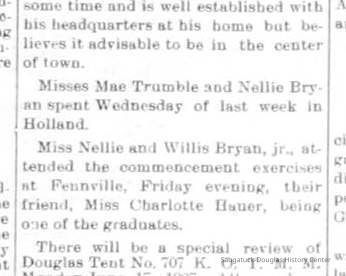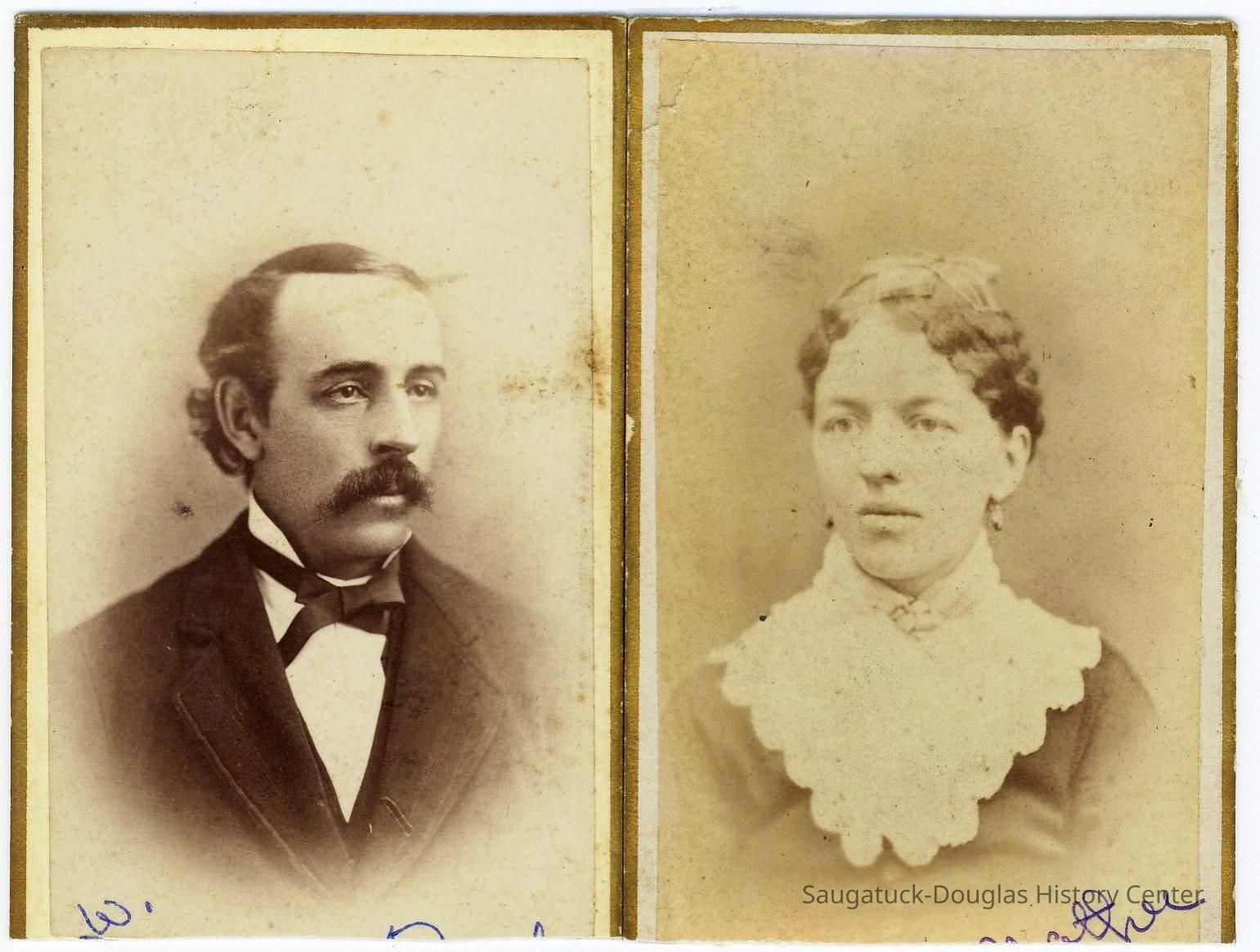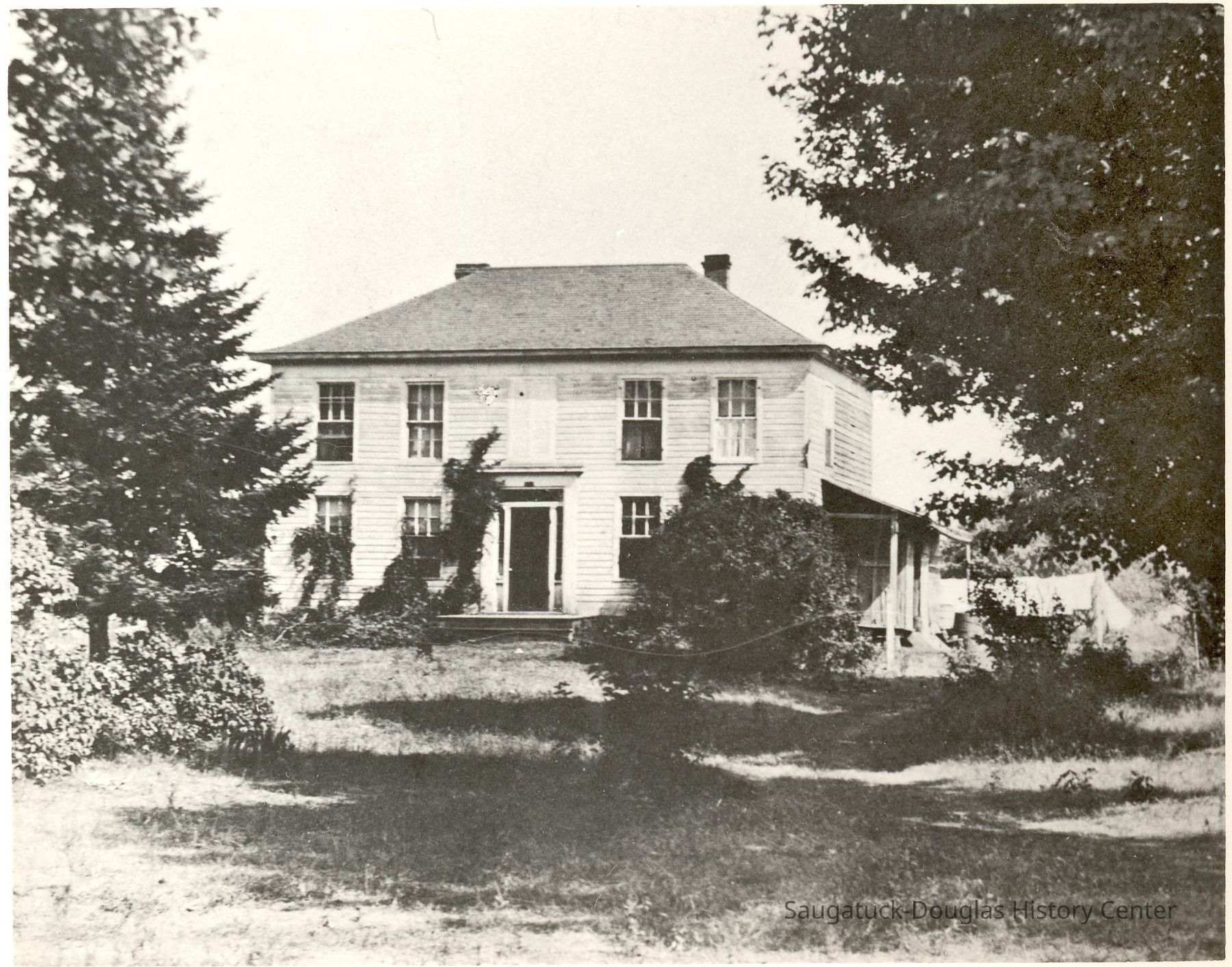 Samuel Willison Bryan Jr. (born Kalamazoo, Dec. 24, 1847) and Ellen Serena (Olsen) Bryan married in 1882. In 1886, they purchased the 40 acre farm. The property, which originally extended east from Lake Michigan and north from Center Road, would eventually be occupied by a number of private dwellings, the Douglas Public Beach, the Rosemont Resort, a chestnut grove and portions of the Golf Course. Unfortunately, in the 1890s the area peach growing economy suffered major losses due to weather and several genetic malignancies. Trees began producing deformed fruit. The government eventually required the cutting and burning of entire orchards to prevent further spread of the disease. The Saugatuck Township property tax in 1896 was $17.76, based on an assessed valuation of $1000. Children Nellie, Willis, Lillian and Hallie were born in the farmhouse.