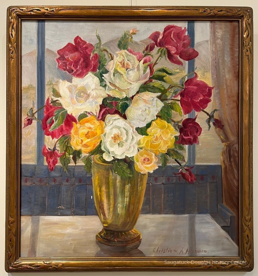 Still life painting of a golden glass vase full of red-pink, white and yellow roses. The arrangement is placed on a table top with a blue-gray bench and window in the background. The gray and tan mountains in the distance suggest a Coachella Valley location.