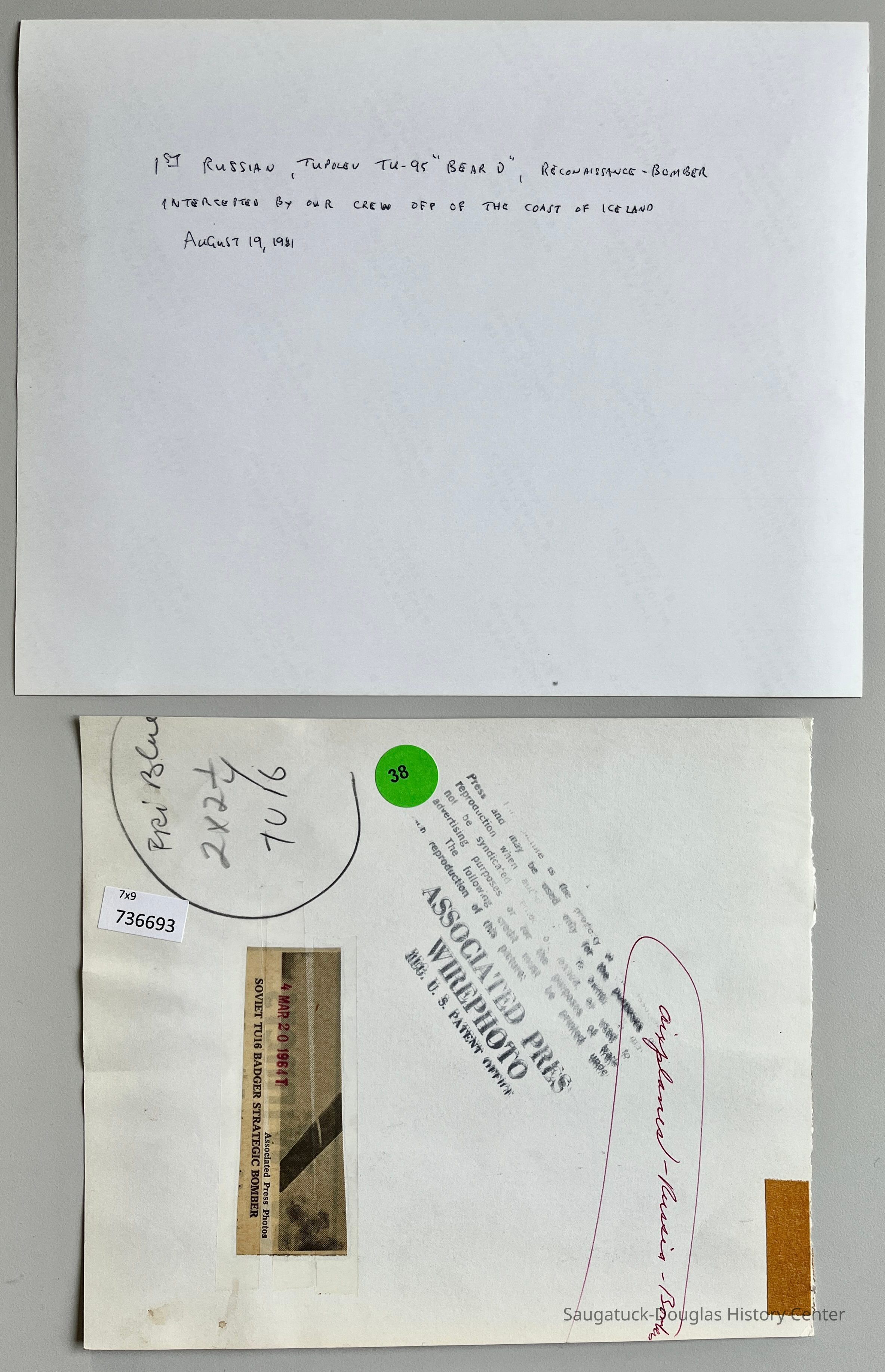 The four-propeller airplane photo is labeled on the back as "1st Russian Tupolev TU-95 "Bear D", reconnaissance-bomber. Intercepted by our crew off the coast of Iceland August 19, 1981" 8x10 inches
