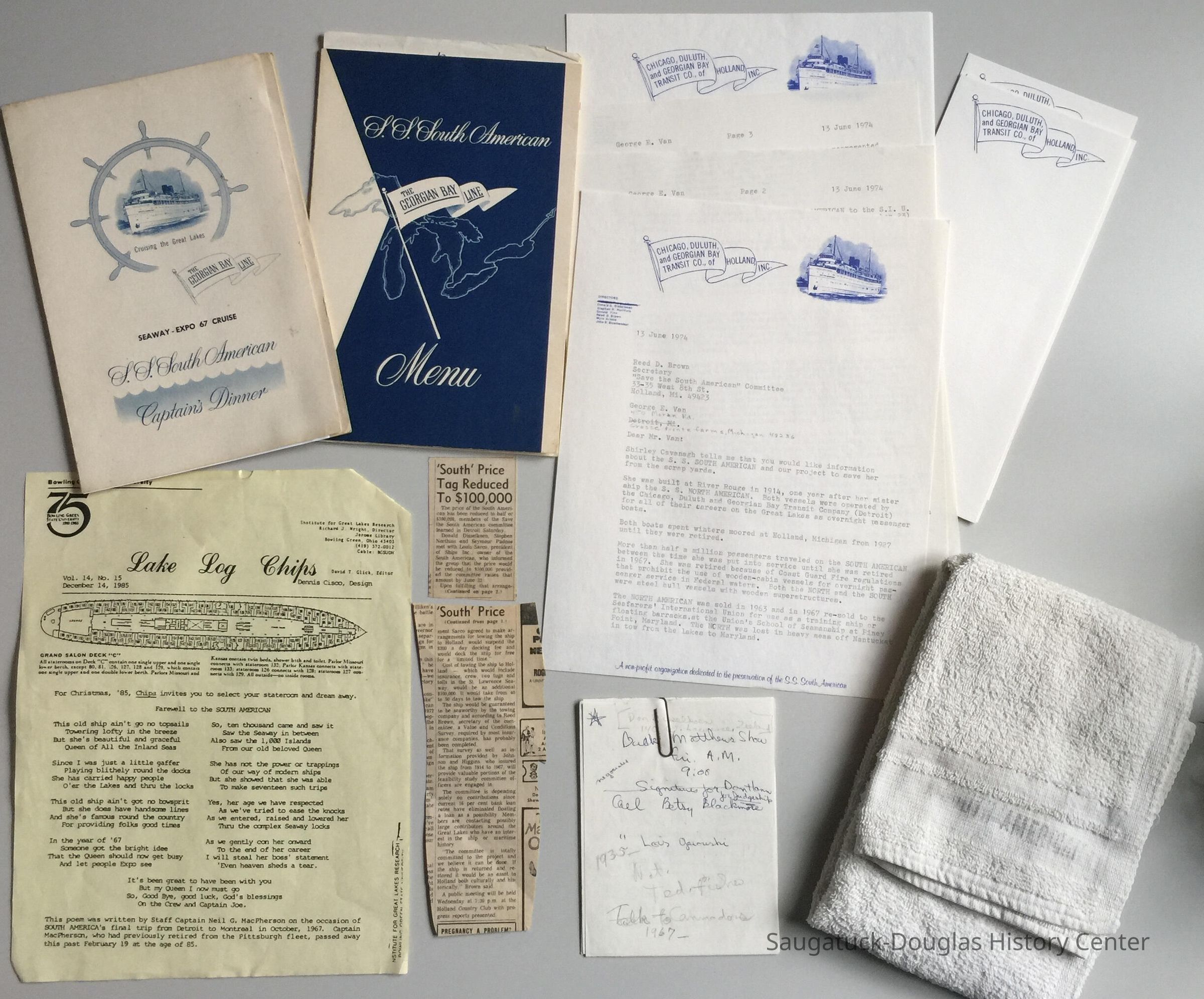 Flyer includes diagram of Grand Salon Dec "C" and "Farewell to the South American" poem by Staff Captain Neil G. MacPherson (?-1985) written for the ships final trip from Detroit to Montreal in October 1967.Creator