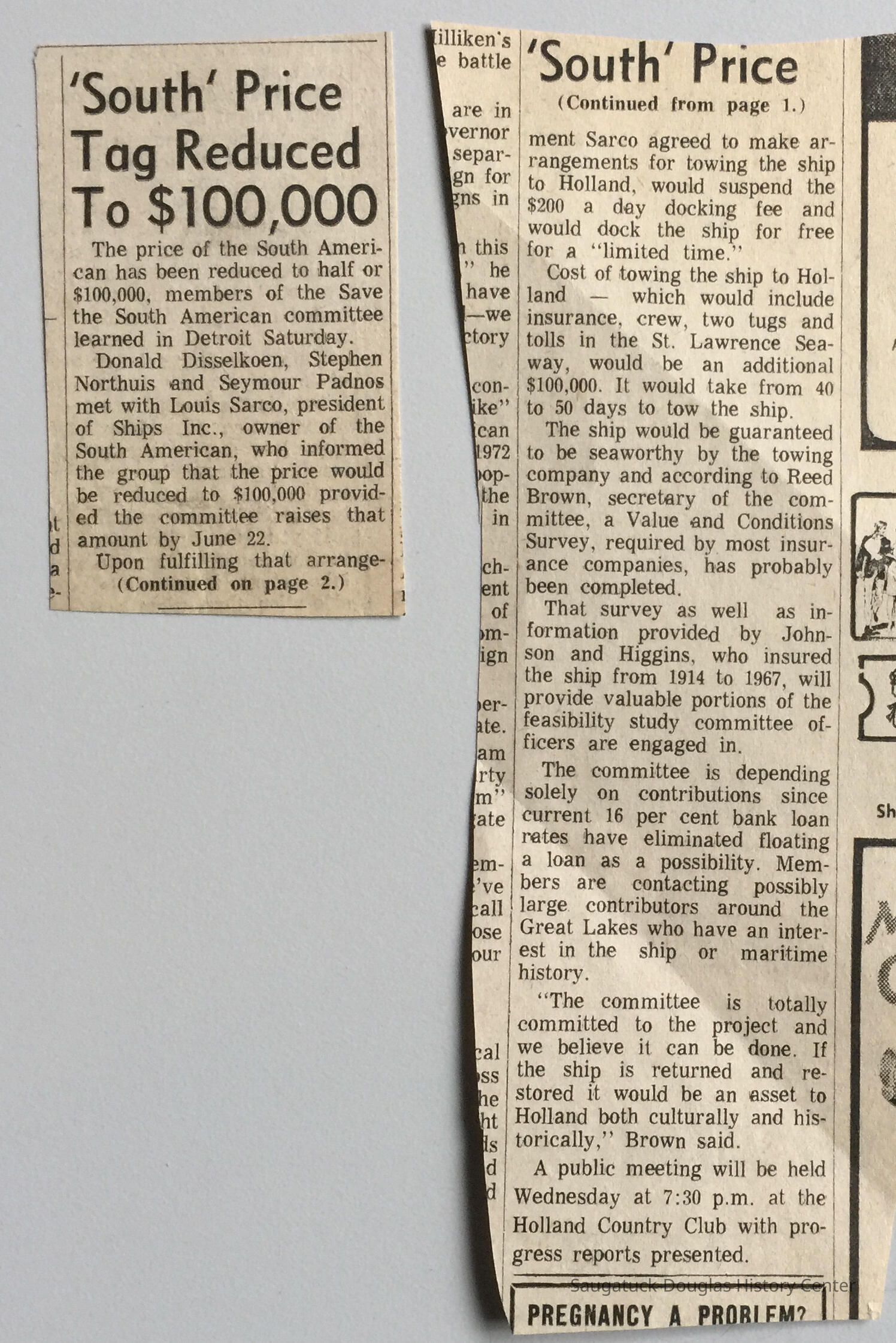 Headline " 'South' Price Tag Reduced To $100,000" from unknown publication. Article names Save the South American committee members Donald Disselkoen, Stephen Northuis and Seymour Padnos meeting with Louis Sarco, president of Ships, Inc., owner of South American. Article photocopied for archiving purposes. Original, aging newsprint not saved.Title