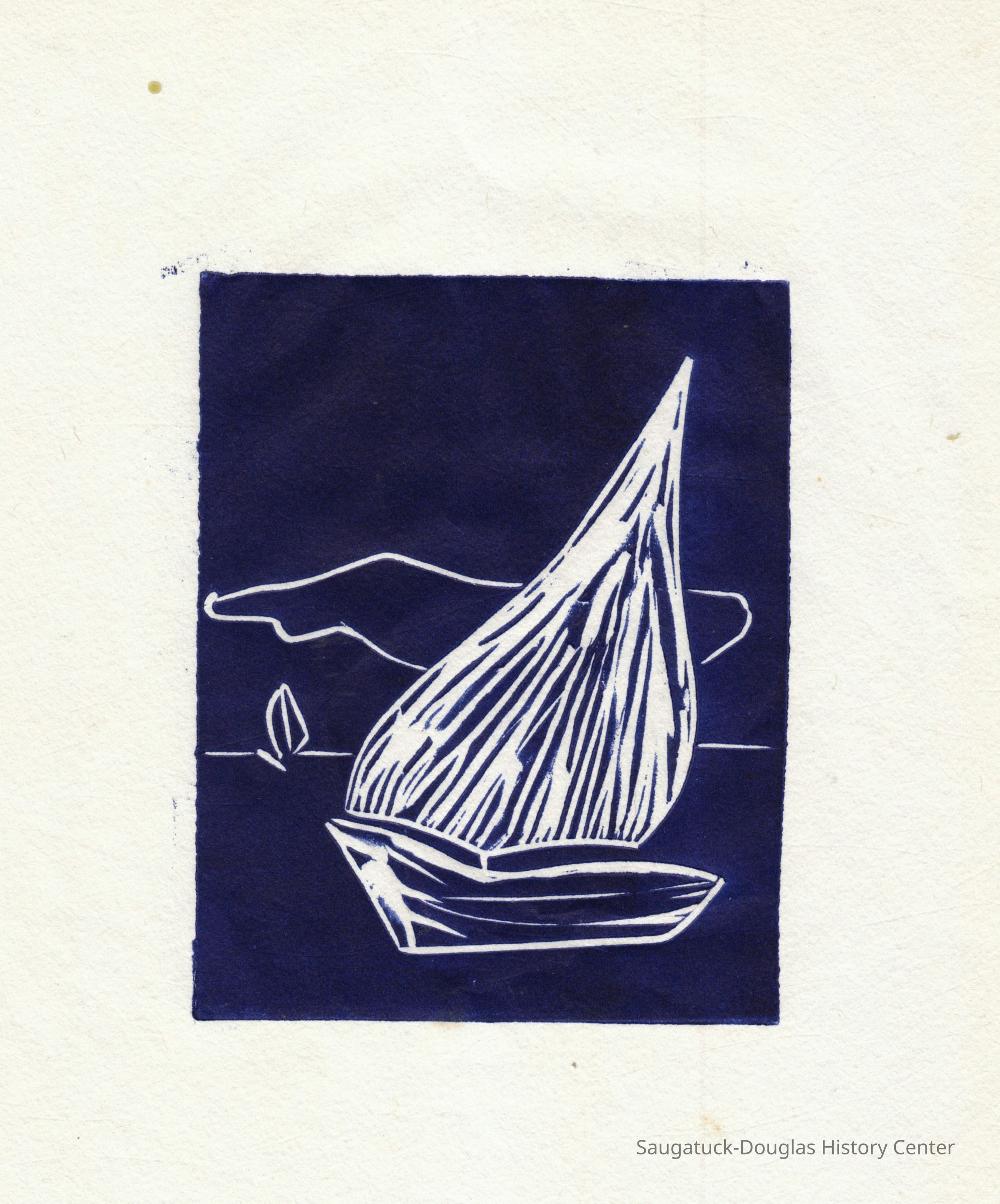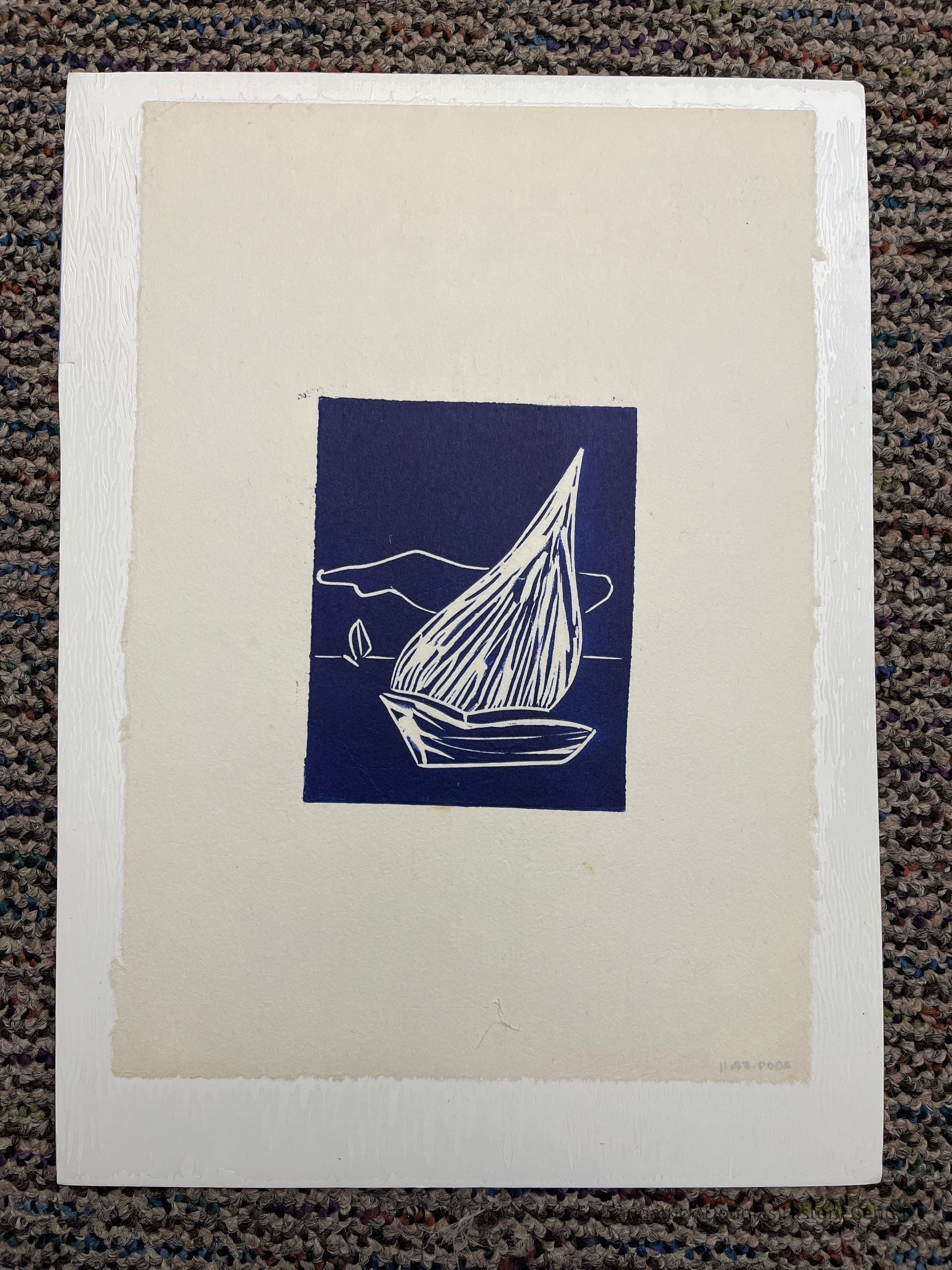Woodblock print of a sailboat on blue backgroundType of Print