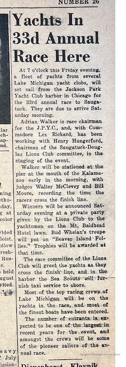 10"x8" photograph of four sailboats docked at the Big Pavilion at the conclusion of the July 4 Chicago to Saugatuck Yacht Race (undated.)Collection