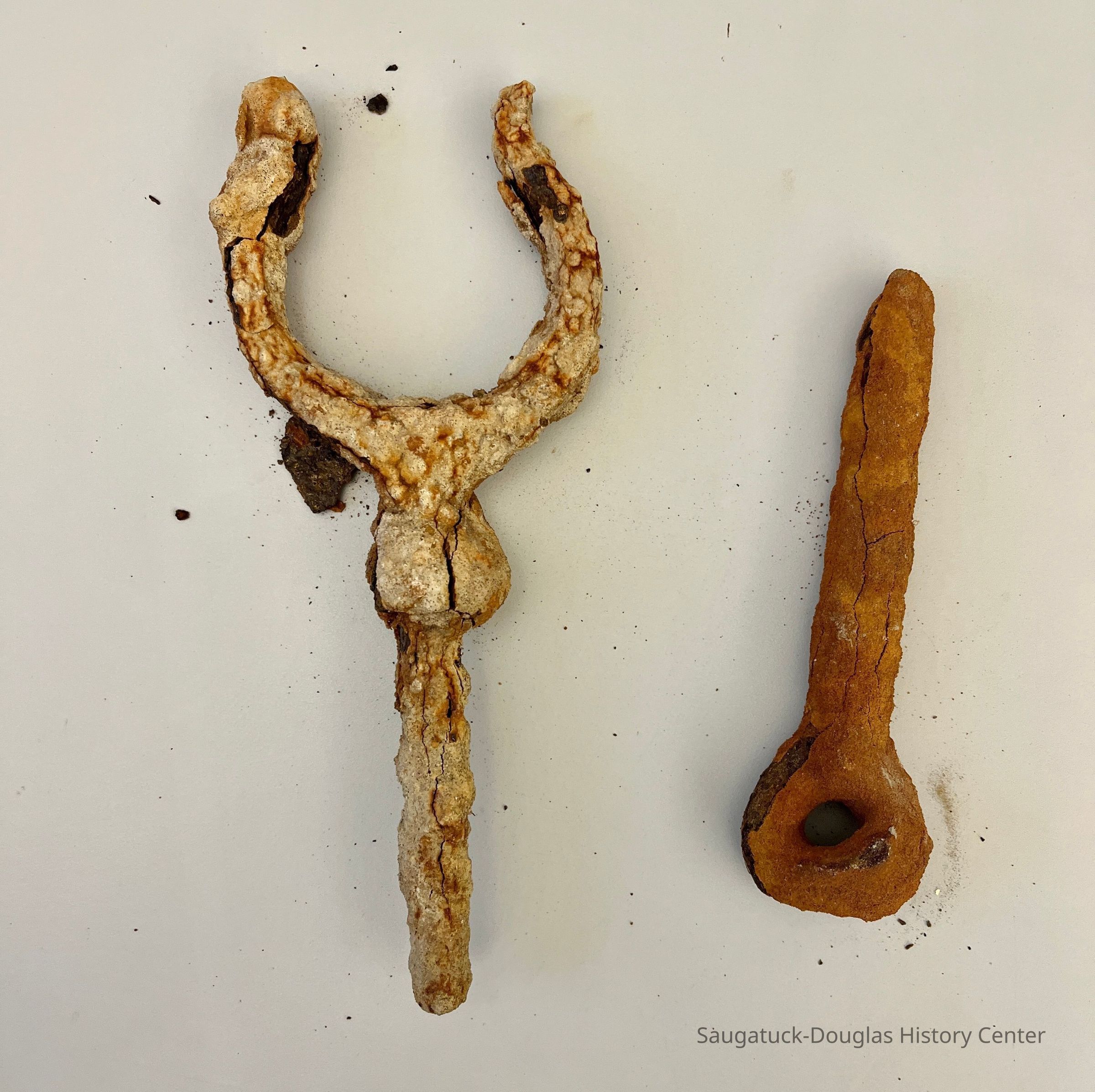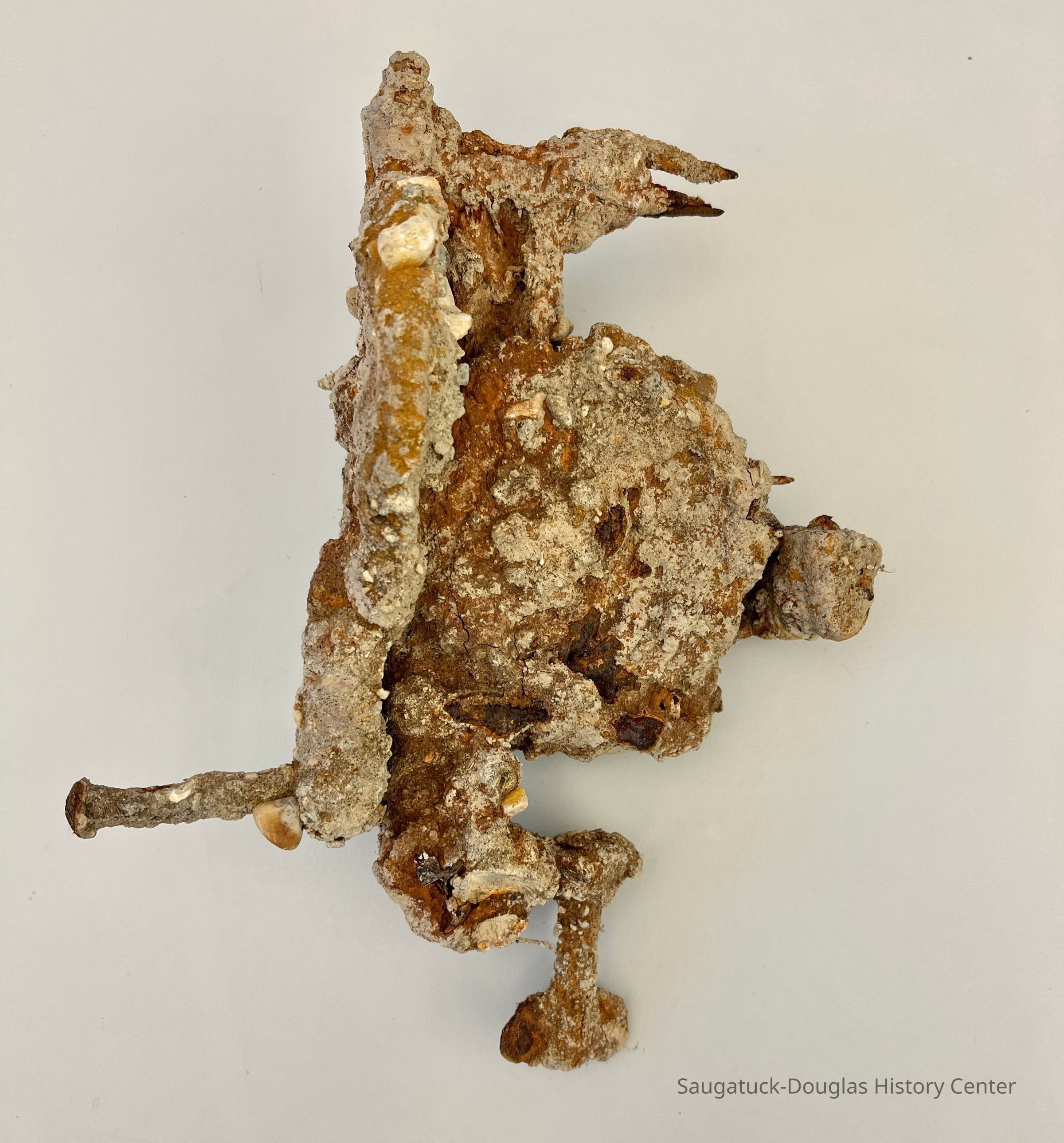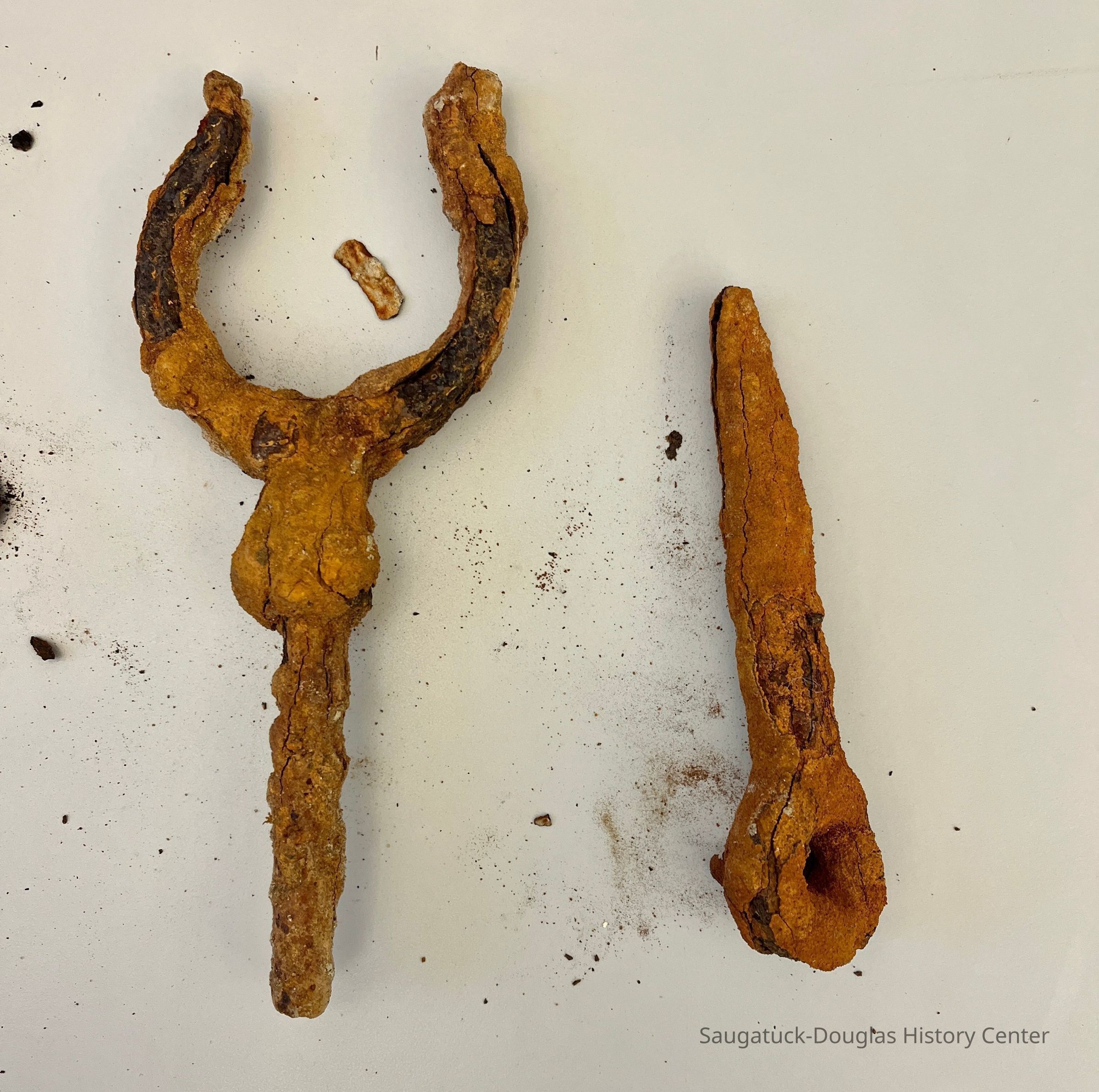 Six heavily rusted and/or encrusted items, thought to have been salvaged from the river. All have a similar amount of orange rust or gray encrustation that easily flakes off.