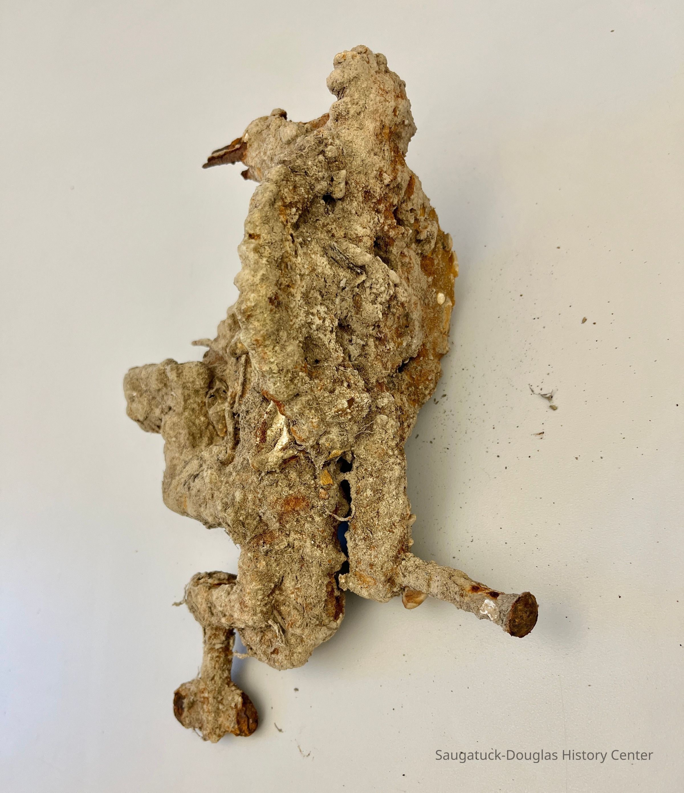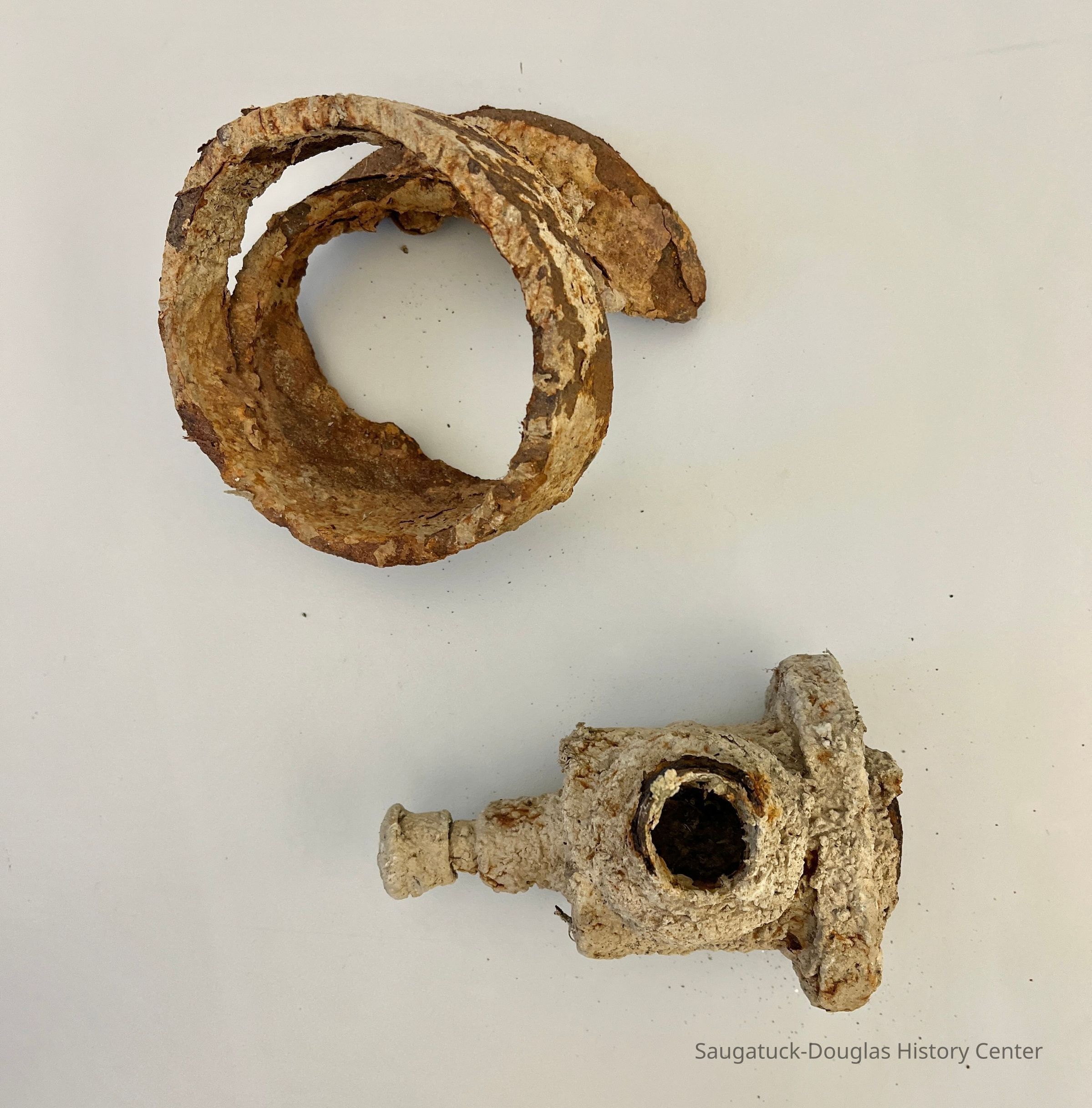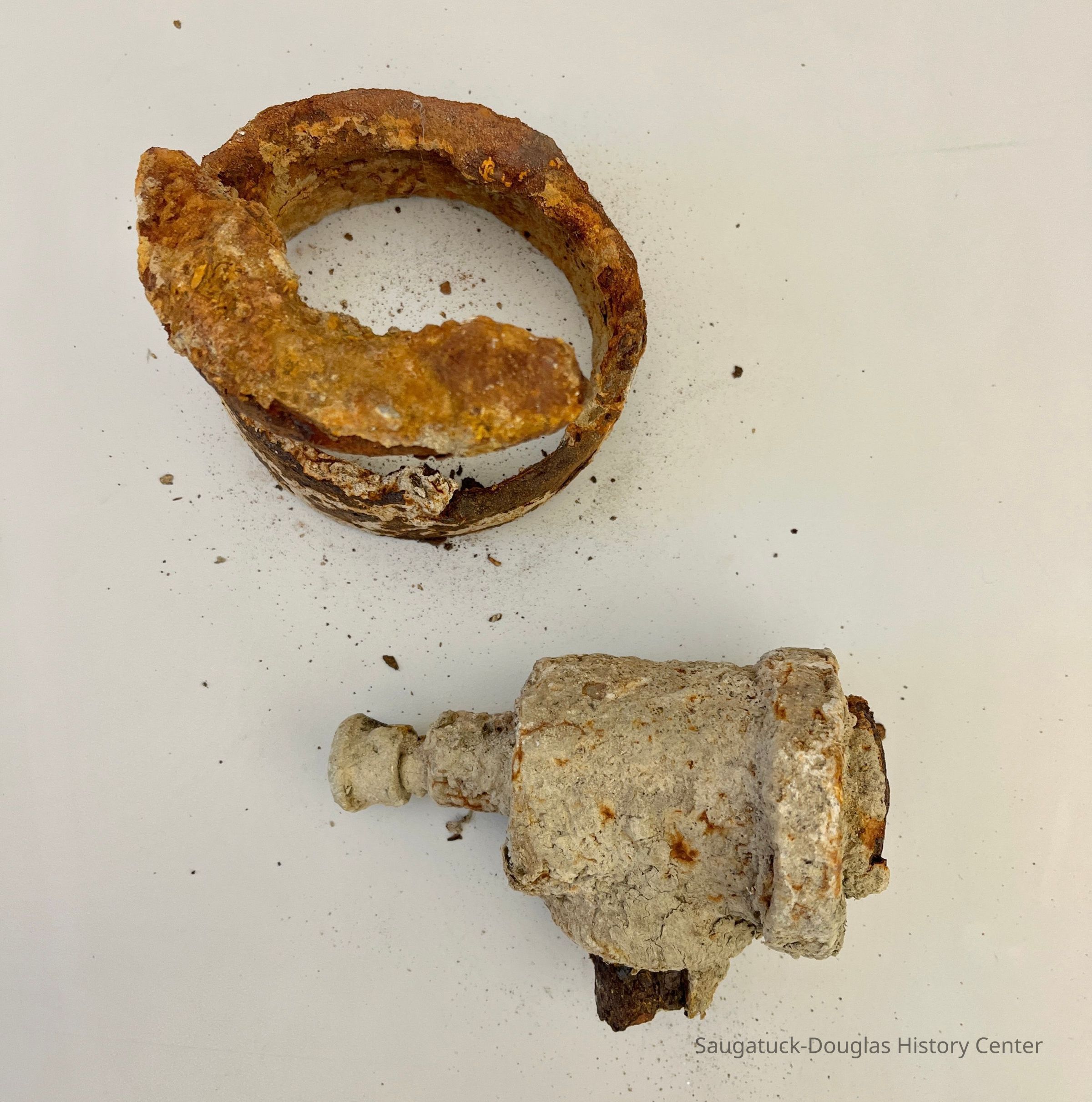 Six heavily rusted and/or encrusted items, thought to have been salvaged from the river. All have a similar amount of orange rust or gray encrustation that easily flakes off.