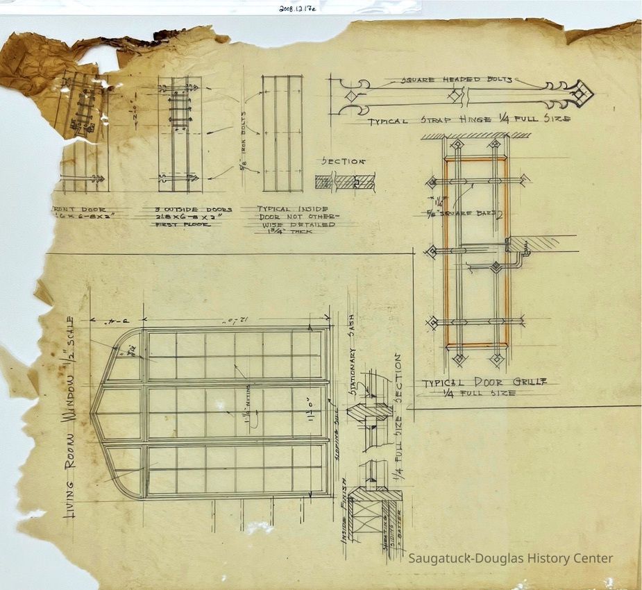 This architectural drawing consists of very detailed drawings for the Samuelson addition. They include the window in the living room, the doors and an up-close detail of the door grilles. The upper left corner and left side of the page contain damage and tears.Collection