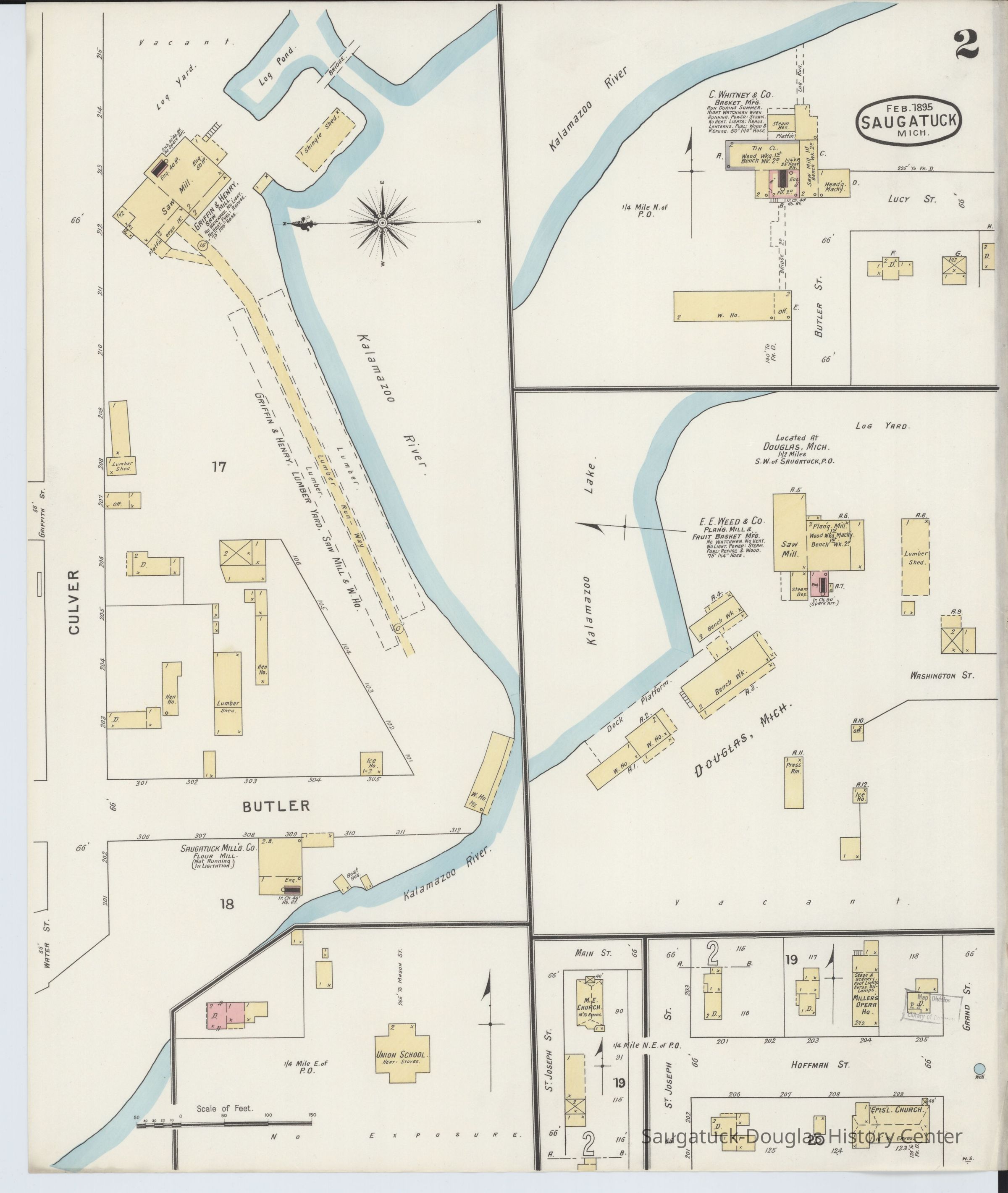 E.E. Weed & Co., 1880s-1927, Griffin & Henry Lumber Yard/Griffin & Henry Sawmill/Griffin & Williams/Stockbridge & Johnson/Wells & Johnson/M.B. Spencer Mill, Whitney Iron Clad Basket Factory 1887-1903 Saugatuck, Rogers & Bird Shipyard/Line, Goodrich Transit Co. warehouse/East Shore Pavilion Skating Rink/Brittian Boatyard, 152 Butler/Kilwins/Flint's Quality Store/Landmark Building/A.B. Taylor Store/Odd Fellow Hall, 201 Butler/Saugatuck Drug/Rexall/Parrish's Drug/Hotel Hamilton/Saugatuck House 1852-1913, 306 Butler/Landsharks/Tripp's/Kruger's/C.E. Bird's/Ensign Drug Store/Wilcox Building, Viola Fox Building/103-107 Butler/Leland Lodge/S.A. Morrison home 1850-1978, Davis Livery/Heath & Stillson livery/Schaberg’s Roller Rink, 317 Butler/Saugatuck Gallery/Singapore Bank Book Store/Kozy Koffee/Variety Shop/Aliber Grocery/Moore Building, 303 Butler/Owl House/Woman's Club/Brueckman house, 439 Butler/Butler Pantry/Wilkins/Koning/Nies Hardware, 246 Culver/Restaurant Toulouse/Reed's Livery/Union House