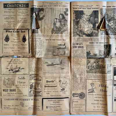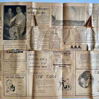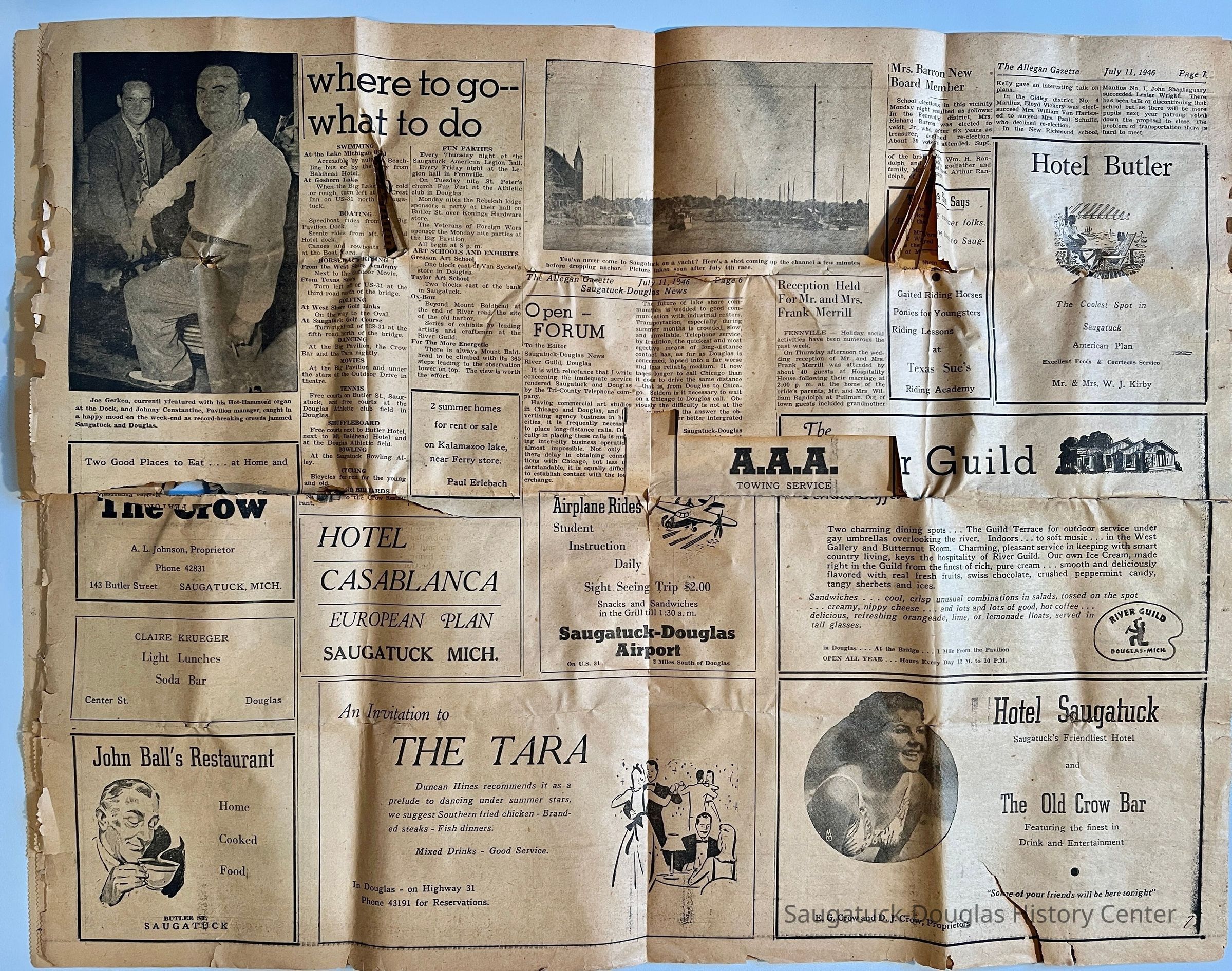 Ads for the Crow/143 Butler/A.L. Johnson; Claire Krueger light lunches in Douglas; John Ball's restaurant; Hotel Casablanca; the Tara; Airplane rides at Saugatuck-Douglas airport 2 miles south of Douglas; Hotel Butler; Texas Sue's riding academy; The River Guild; Hotel Saugatuck and the Old Crow Bar/E.G. Crow and D.J. Crow proprietors