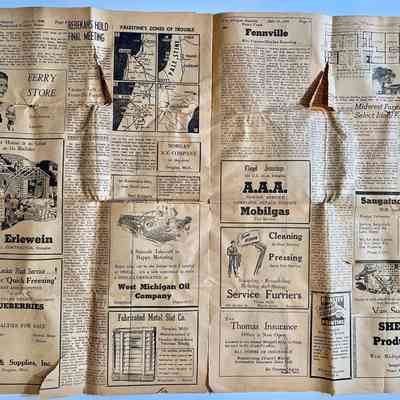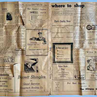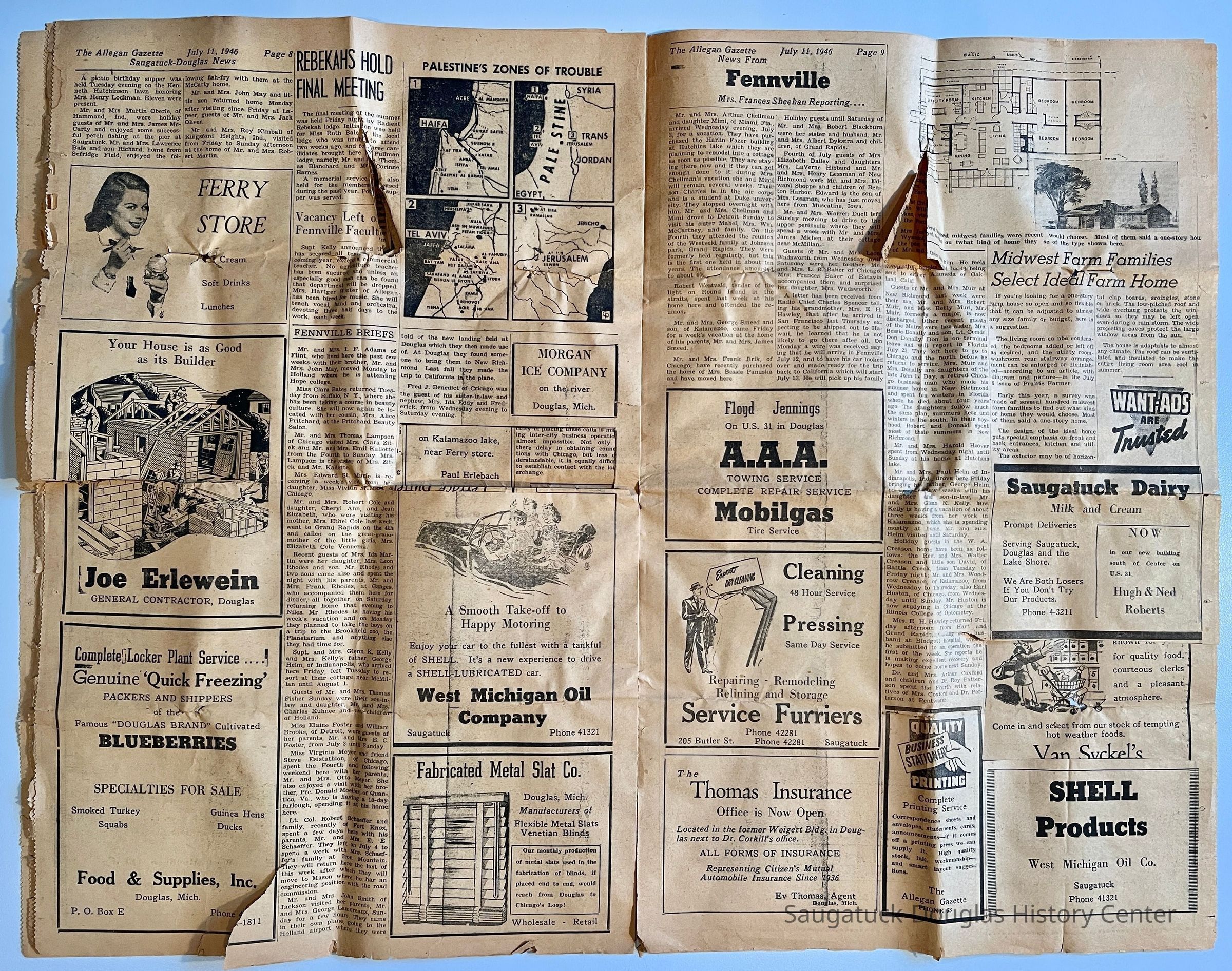 Ads for Floyd Jennings A.A.A. towing services and Mobilgas on US-31 in Douglas, Service Furriers at 205 Butler, Ev Thomas insurance, Allegan Gazette business printing, Saugatuck Dairy/Hugh and Ned Roberts, Shell Products.