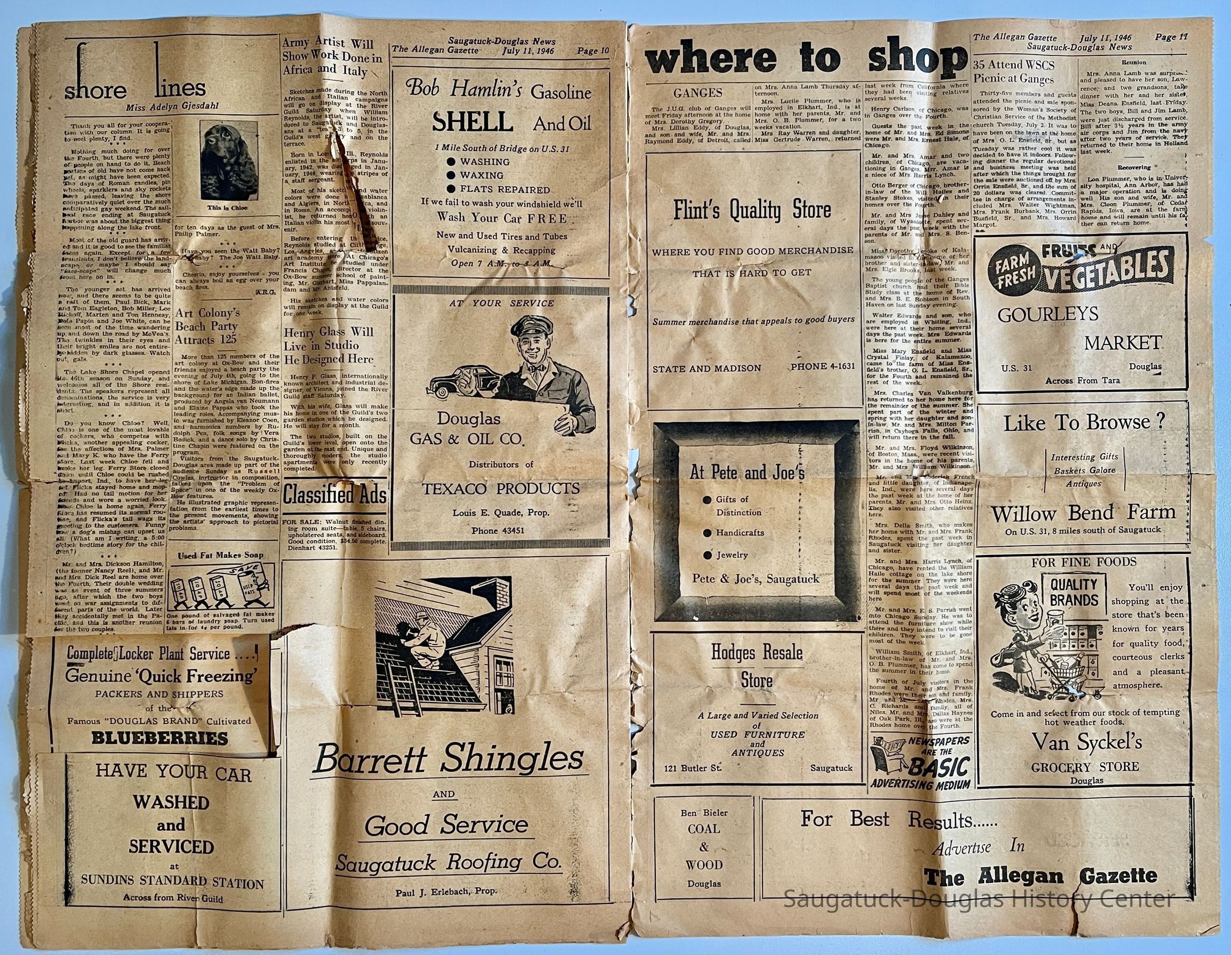 Ads for Flint's Quality store/State and Madison; Pete & Joe's Saugatuck; Hodges Resale/121 Butler; Ben Bieler Coal and Wood in Douglas; Gourley's Market on US-31 across from Tara; Willow Bend Farm; Van Syckel's grocery