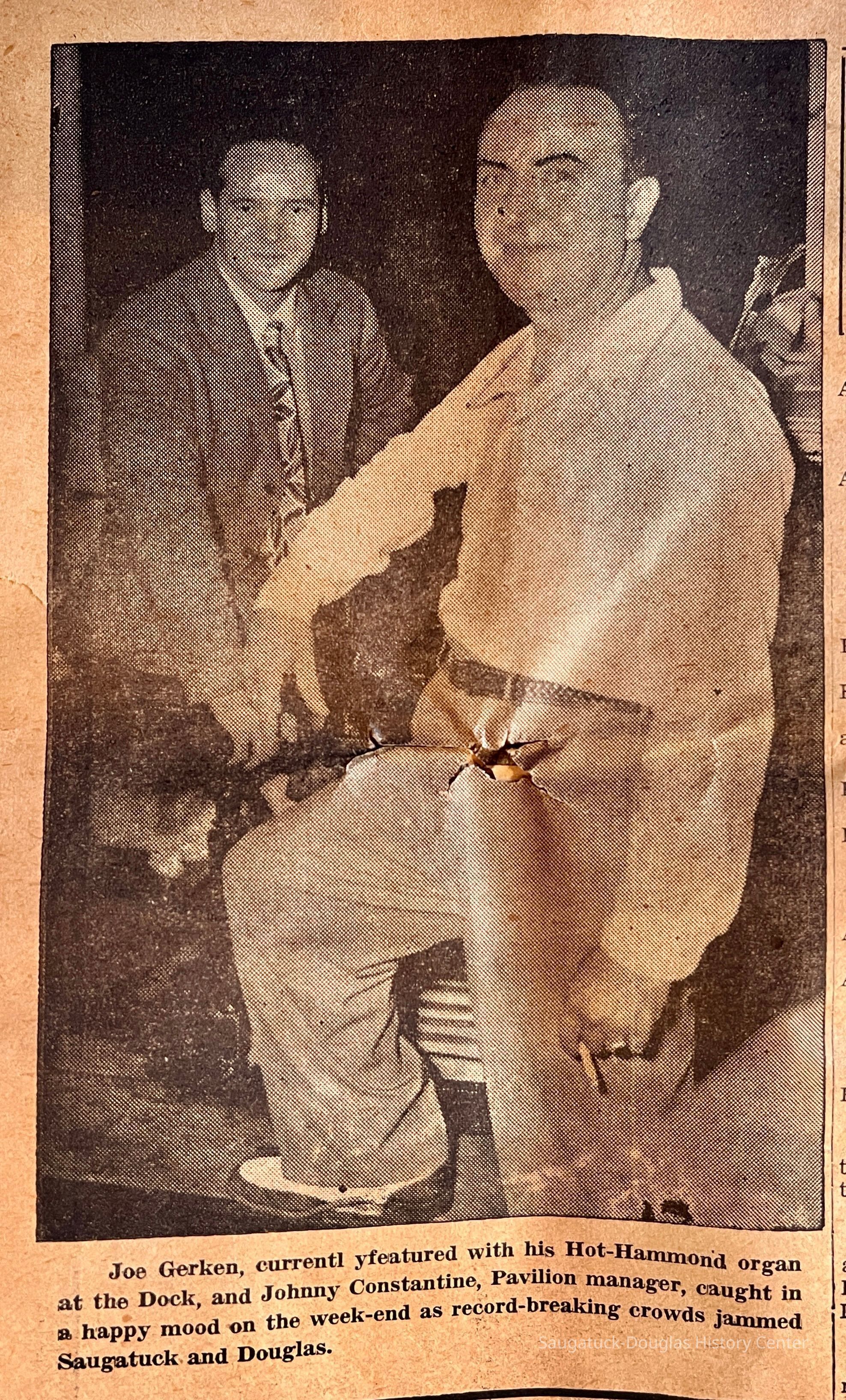 News from Saugatuck by Margaret Graves - mentions of Aldeen Jarvis, Dick Pear, Bob Pear, Joe Sheridan, Mrs. Waddle, Terry Costello, Crampton Manufacturing, Mac Staples, Jack Kreager, Miss O'Mara, Stuward Felt, Edgar Lewis, Pauline Lewis, Edward Barstow, John Kruger, Pete Twiner, W.B. Lee, Mrs. John MacMorris, Mrs. Rob Crawford, Mrs. William LaGrave, Mrs. Val Smith, Mrs. William Wodall, Mrs. Joe Jackson?, Mrs. Charles Tenhave
