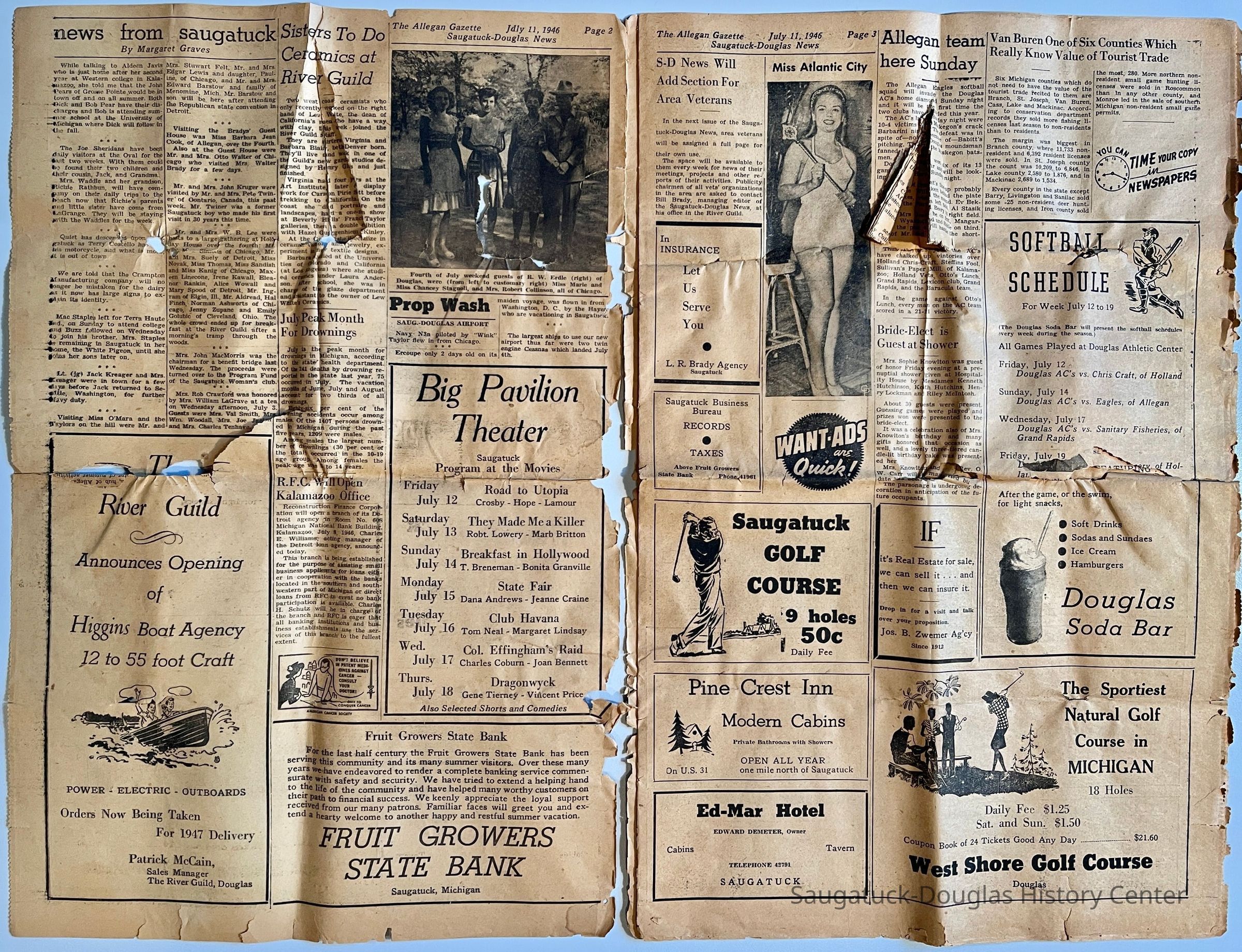 Ads for L.R. Brady Agency, Fruit Growers State Bank, Saugatuck Golf Course, Pine Crest Inn, Douglas Soda Bar, Jos. B. Zwemer Agency, Ed-Mar Hotel, West Shore Golf Course