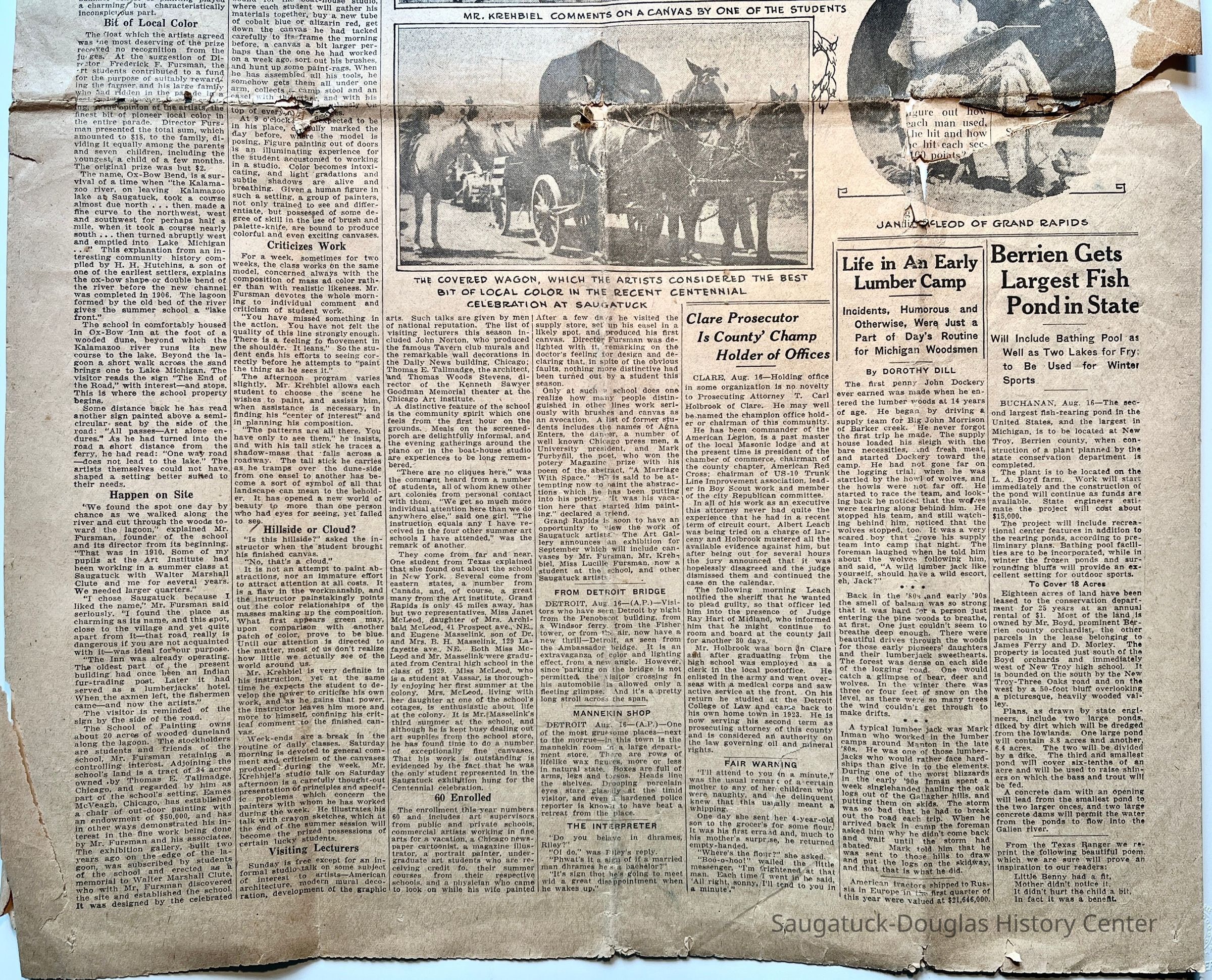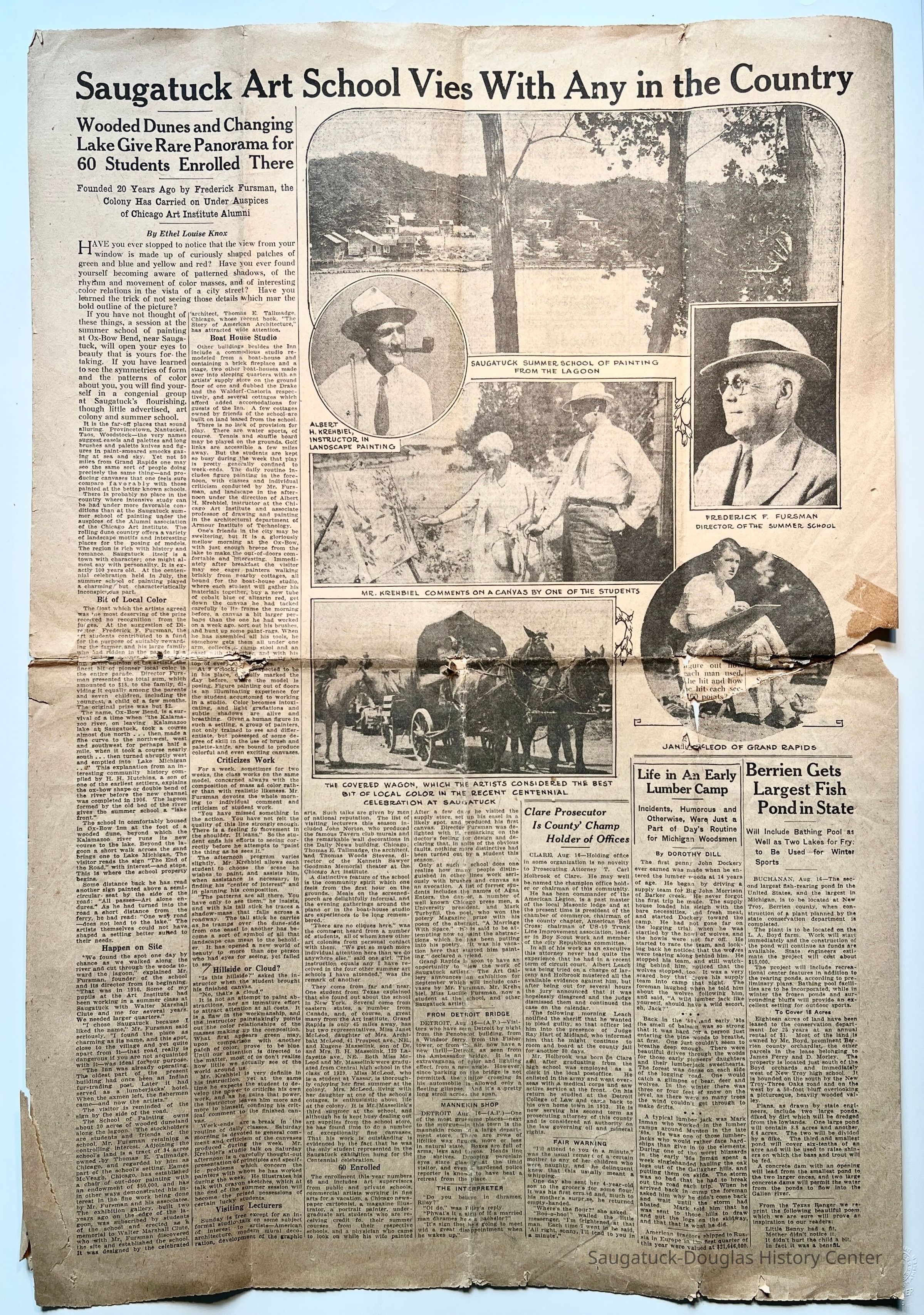 Four broadsheet pages from an unidentified newspaper, likely from Grand Rapids. One page features an illustrated story about the Saugatuck Summer School of Painting [Ox-Bow] with the subtitles: