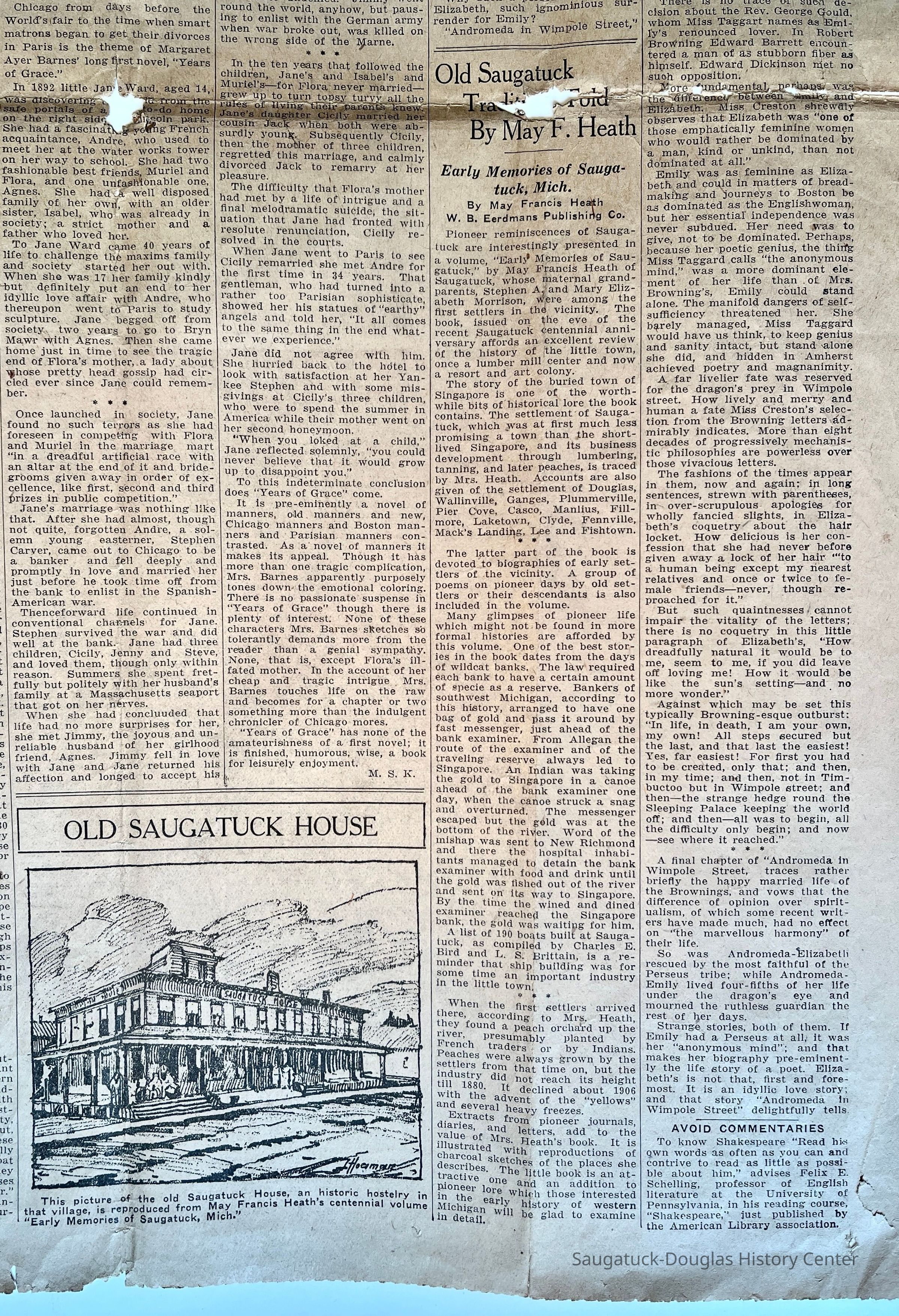 The back of this page has a book review of May (Francis) Heath's "Early Memories of Saugatuck, Mich." suggesting the newspaper was printed in or after May, 1930.Context