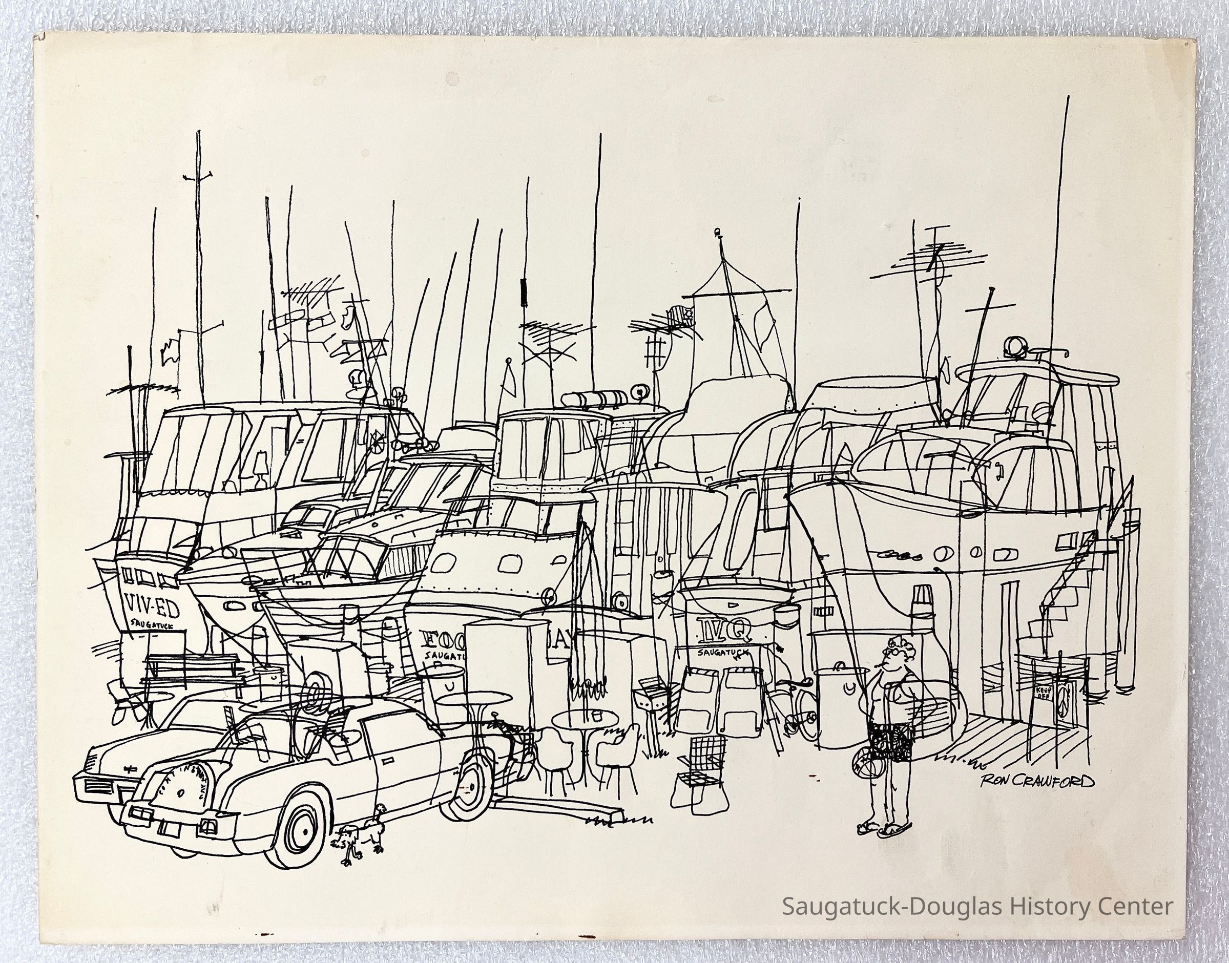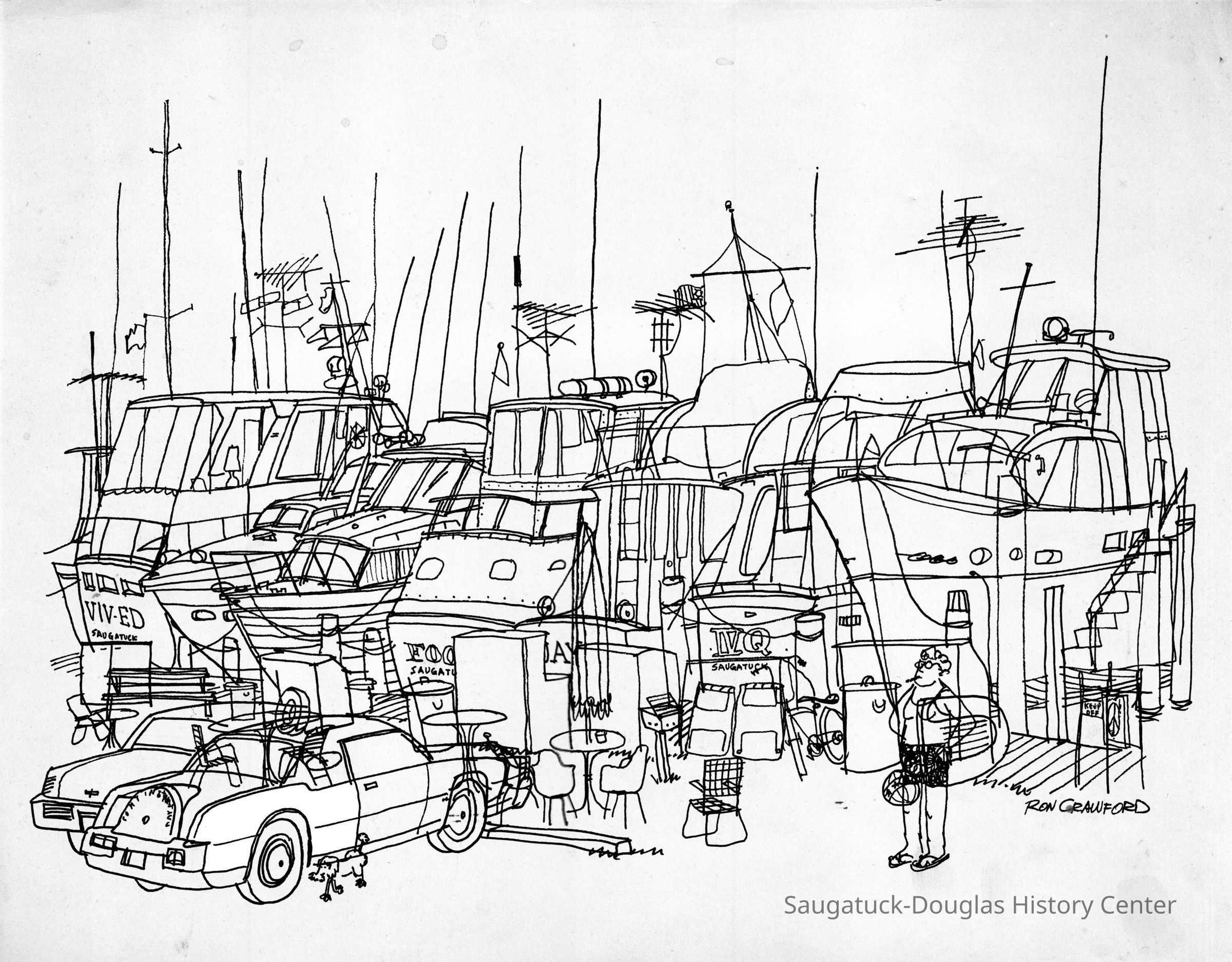 Undated print of a drawing by Ron Crawford of the boardwalk in Saugatuck with a row of large yachts bristling with antennas, boat boxes, patio furniture, grills, parked cars, little dog and a smoking lady. 11x14"Collection