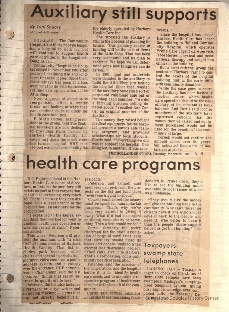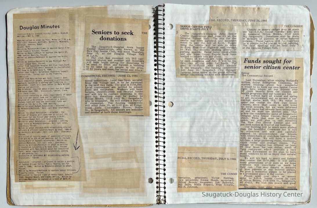 Spiral-bound notebook with newspaper clippings from 1985 to 2005, plus a few flyers and snapshots, that trace the history of the Saugatuck Douglas Area Senior Center. Compiler of album is not identified. Notebook traces the efforts to create and run the center, the activities it offered and its closing in 2005