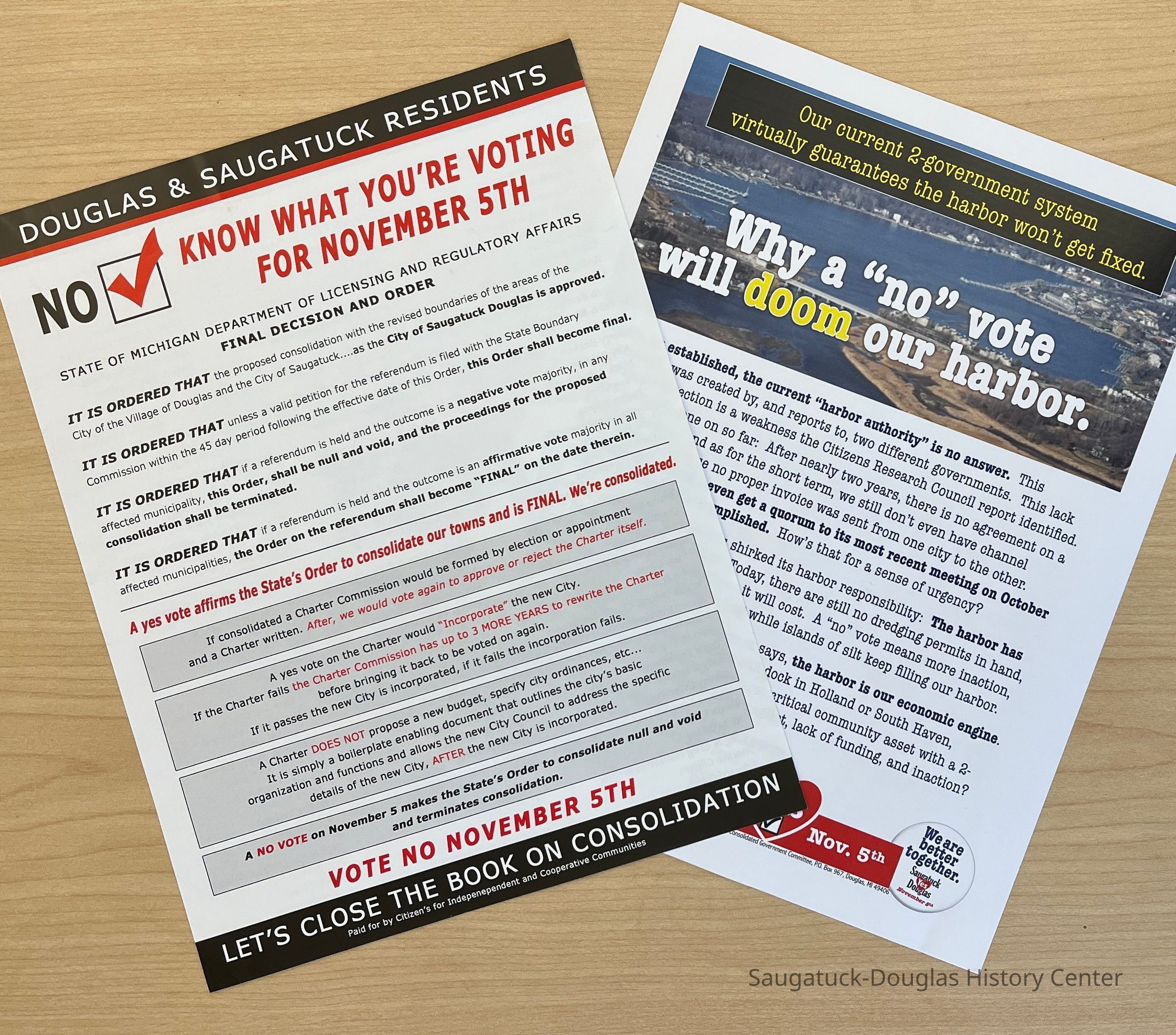 The possibility of combining the Saugatuck City, Douglas City and Saugatuck Township governments was supported by some residents and resisted by others. In the end, the consolidation effort failed.Collection