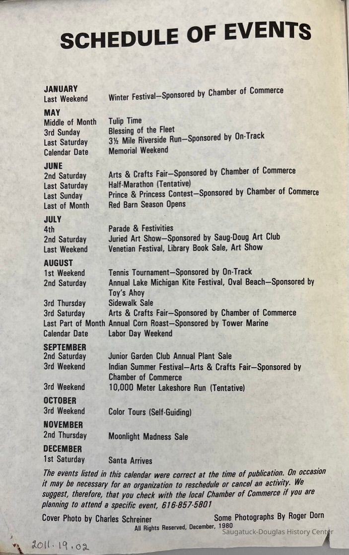 Chamber of Commerce, Saugatuck-Douglas, Schreiner, Charles "Charley", Queen of Saugatuck (ship) c1977-, 141 Butler/Sand Bar Saloon/Edson Crow Barbershop & Billiard Parlor, 56 Blue Star Hwy/Pines Motor Lodge/Plaza Motel, Saugatuck Historical Museum, Walker's Landing & Marina, Valleau Studio/Valleau Bros. Dairy, 447 Butler/Inn of Saugatuck/Victorian Inn/Highbanks Art Gallery/John Koning home, Wavecrest Farm/Nursery, City of Douglas (ship), Sunday Drive/James Connor Gallery/220 Culver west/Olive Mill 1st, Left Bank, Lulu Cadieux/House by the Side of the Road/Edwin House farmstand, Tara Restaurant/Spencer House/200 Center, Broward Marine "North" 1979-c1999, Fenn Valley Vineyard 1973-present, Cranes Orchard Pie Pantry, Restaurant & Bakery, Timberline Motel, 528 Water/Ship-N-Shore Hotel 1959-, Keewatin (ship), 215 Butler/Phil's/The Walton/The Embassy Bar & Grill/Cook /Metzger/Wallin Building, 650 Water/Saugataco/River Market/Gleason's Party Store, Wally's/130 Hoffman/Pat's Place/Bird & Wells, Blue Wildwood/Virginia Burton Silversmith/Bill Schumacher Barber, Clearbrook Golf Club/Hamilton Lake Club/Saugatuck Golf Club, Dune Rides, 132-140 Butler/Brass Anchor/Prajna Gallery/Celebration/Elms Hotel/Francis residence/Morrison Hall, 115 Butler/Beach Day/MI Coast/Music Box/John Ball's Restaurant/Niles Jewelery 1910, Motel Shangrai La c1950-, 252 Butler/Tuck's Pandora Christmas Shop/East of the Sun/Cabin Tavern/Walz's Butcher Shop/Nichols Bldg., 237 Butler/Puddingstone/Sinbad/Carl Walter's/Community Cleaners/Roche building, Saugatuck RV Resort/West Wind KOA/West Wind Cottages, Diane (boat) Chain Ferry 1965-present, 880 Holland/Southerner/Elbo Room/Clover's Landing, Douglas Building Center/Hutchins Lumber and Supply Co., Wolbrink Insurance Agency, 241 Butler/Momentum/Brigadoon, 134 Mason/Spice Merchants/Cindy's/Red Dog B&B/Metzger Residence, 247 Butler/Hidden Garden-Renaur-Wine Sellers/John Noonan home/Surry/Summer Home/Corner House/Capt. Rogers home, Saugatuck Yacht Service, 322 Culver/Scooter's Pizza/Gourmet Shop/Villager Restaurant, 229-233 Butler/Oosting Appliance Shop East/Green Kandle/Busy Bee, 119-121 Butler/Leland's Department Store Building 1907, 236 Culver/Coast 236/Hercules/Loaf and Mug/Simonson Studio #1, Dunes Resort 1999-present/Douglas Dunes 1981-1999/Amity Motel, 220 Water/Coral Gables/Hotel Saugatuck/Columbia Hotel/Leiendecker's Inn/Ebmeyer Shingle Mill, Peel, Mike 1953-2016
