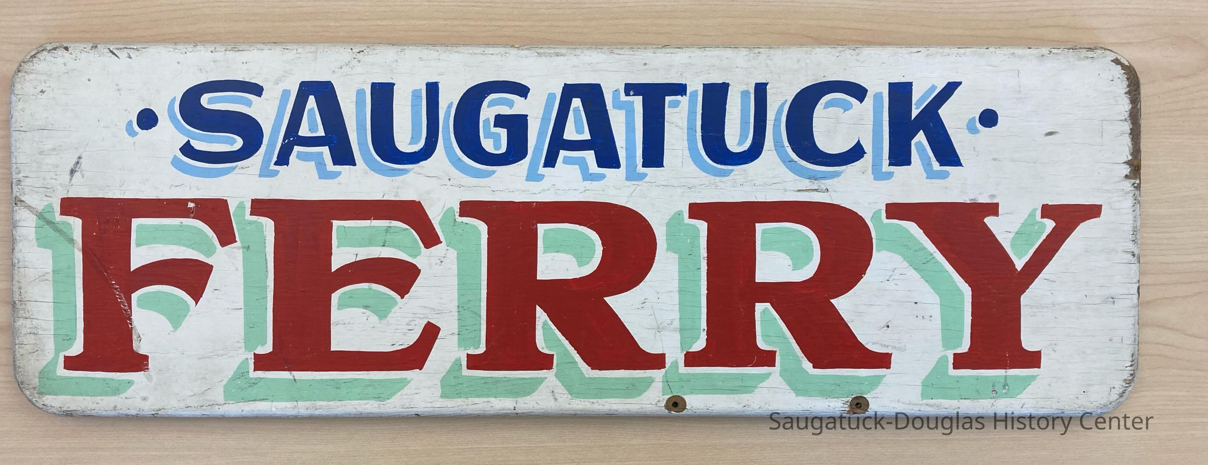 White painted sign with blue Saugatuck and large red Ferry letters.Collection