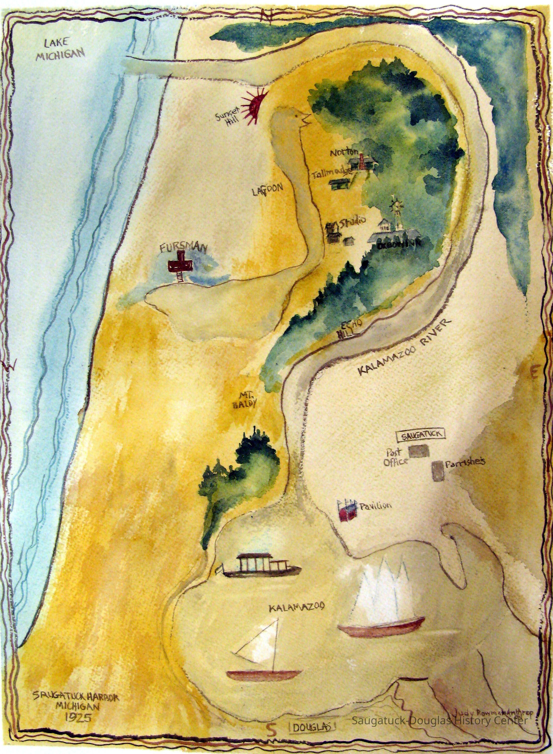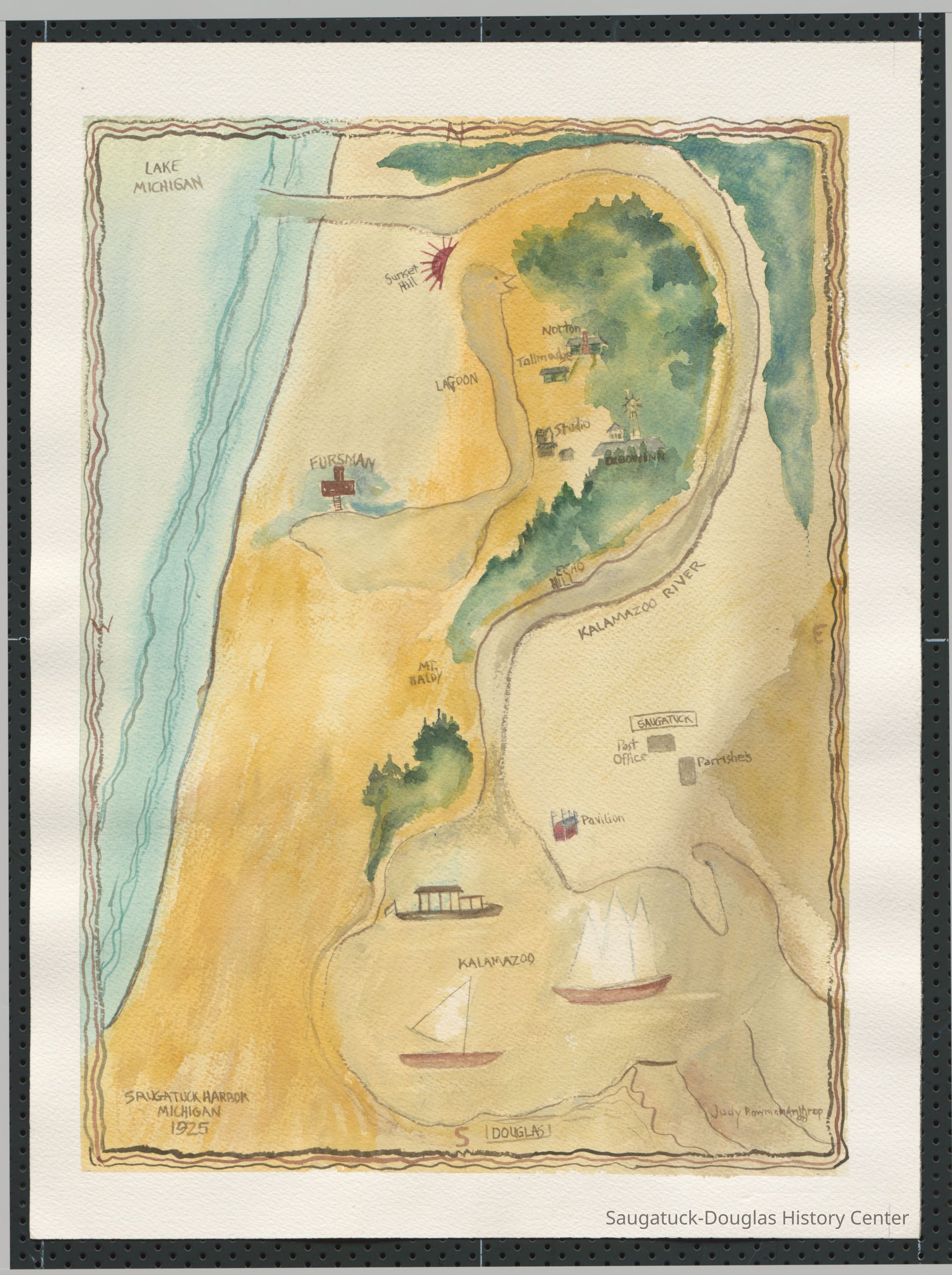 12"x16 1/2" watercolor painting reproduction of a 1925 map of the Saugatuck Harbor and Kalamazoo River. Painted by Judy Bowman AnthropCollection
