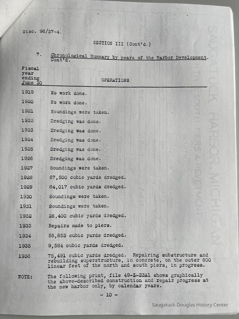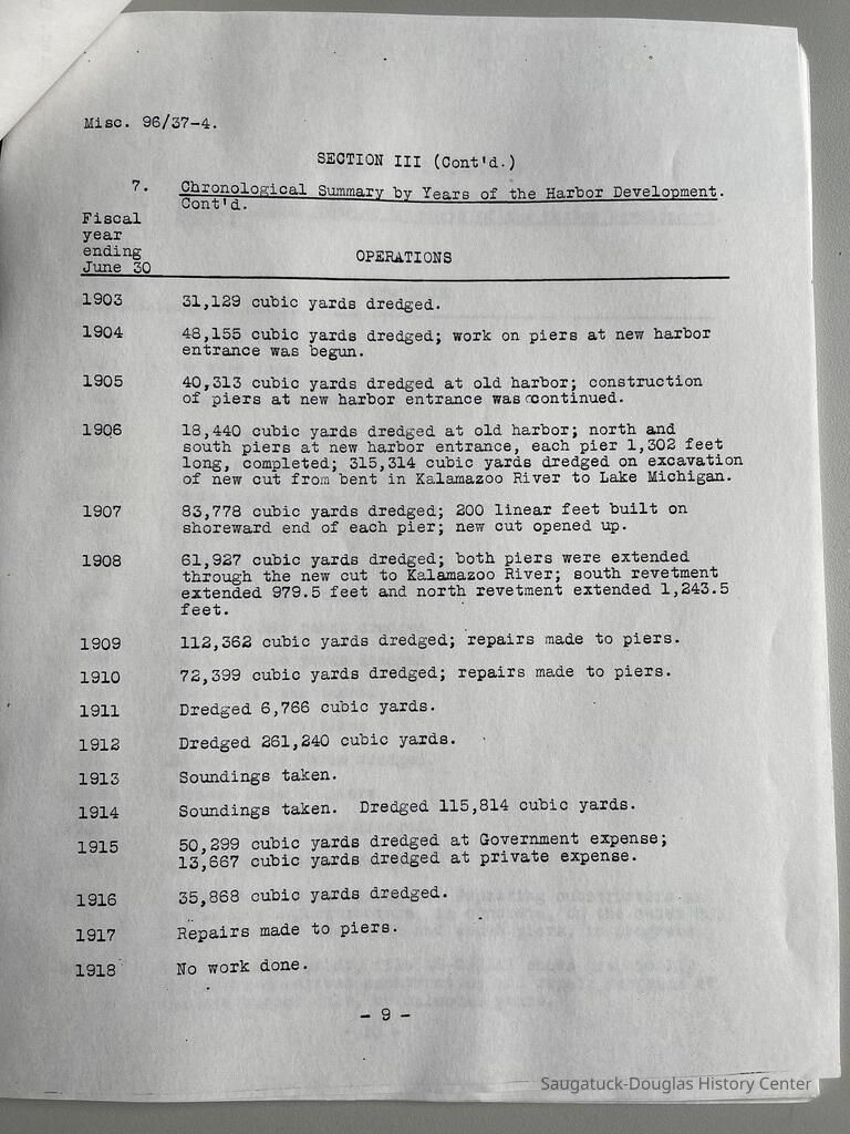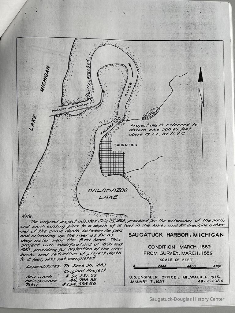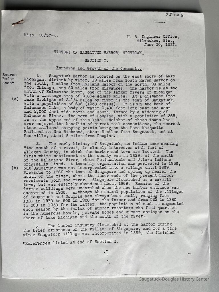 Photocopy of 21-page report by the U.S. Engineer Office, Milwaukee, Wisconsin, June 30, 1937 on the History of the Saugatuck Harbor. Report signed by A.F. Everett, Associate Engineer