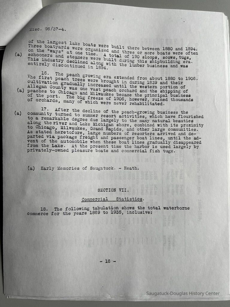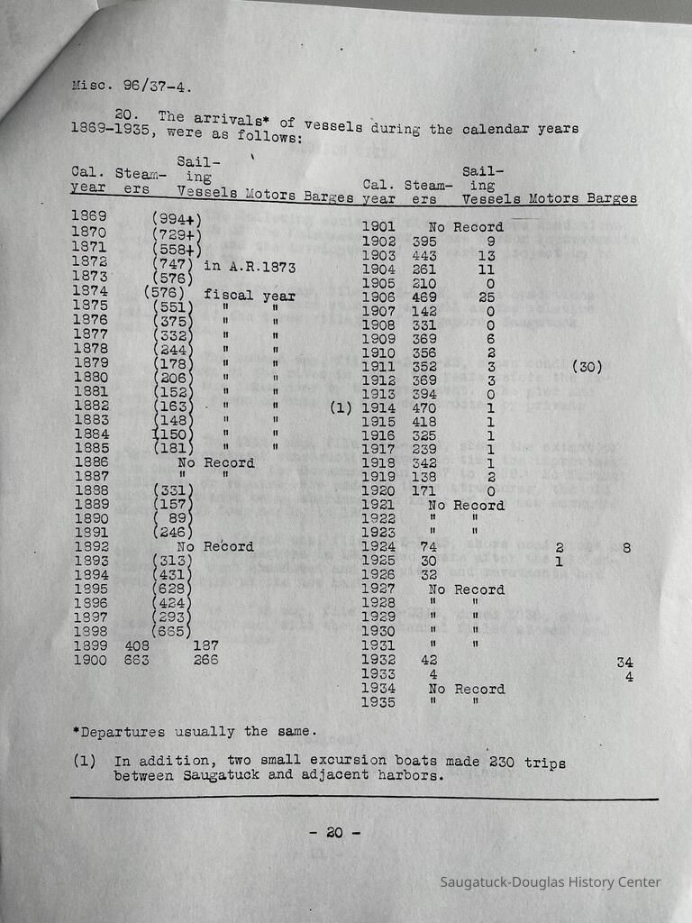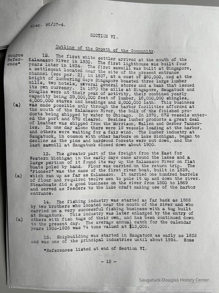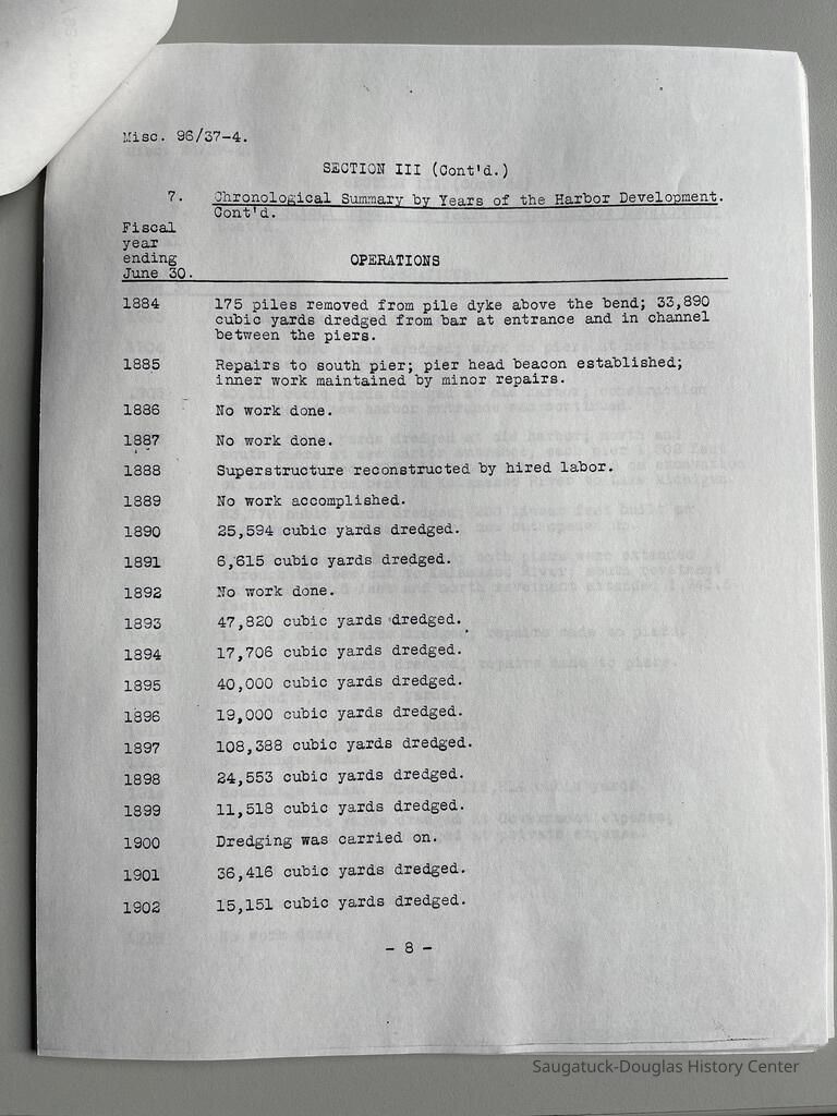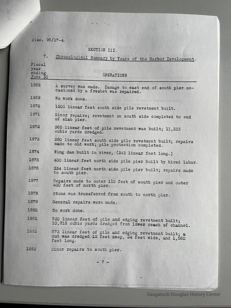 Photocopy of 21-page report by the U.S. Engineer Office, Milwaukee, Wisconsin, June 30, 1937 on the History of the Saugatuck Harbor. Report signed by A.F. Everett, Associate Engineer